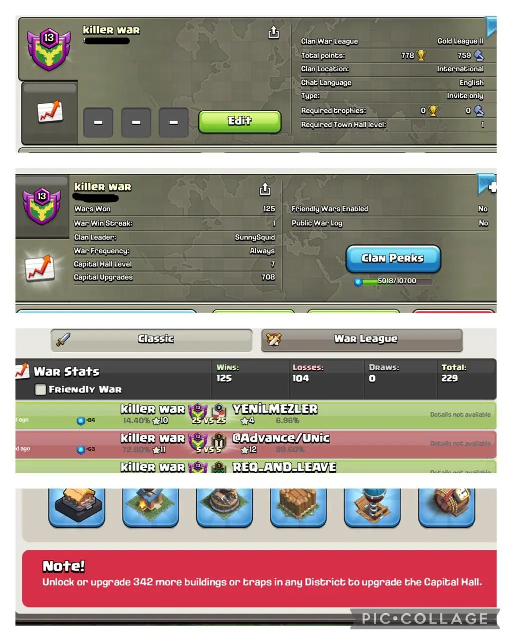 💥Killer waR🔥 | LVL 13.5🔵 |⚡ WARLOG W/L/D: 125/104/0 | CWL League:Gold2☠️ | CC: Almost Capital 8💥