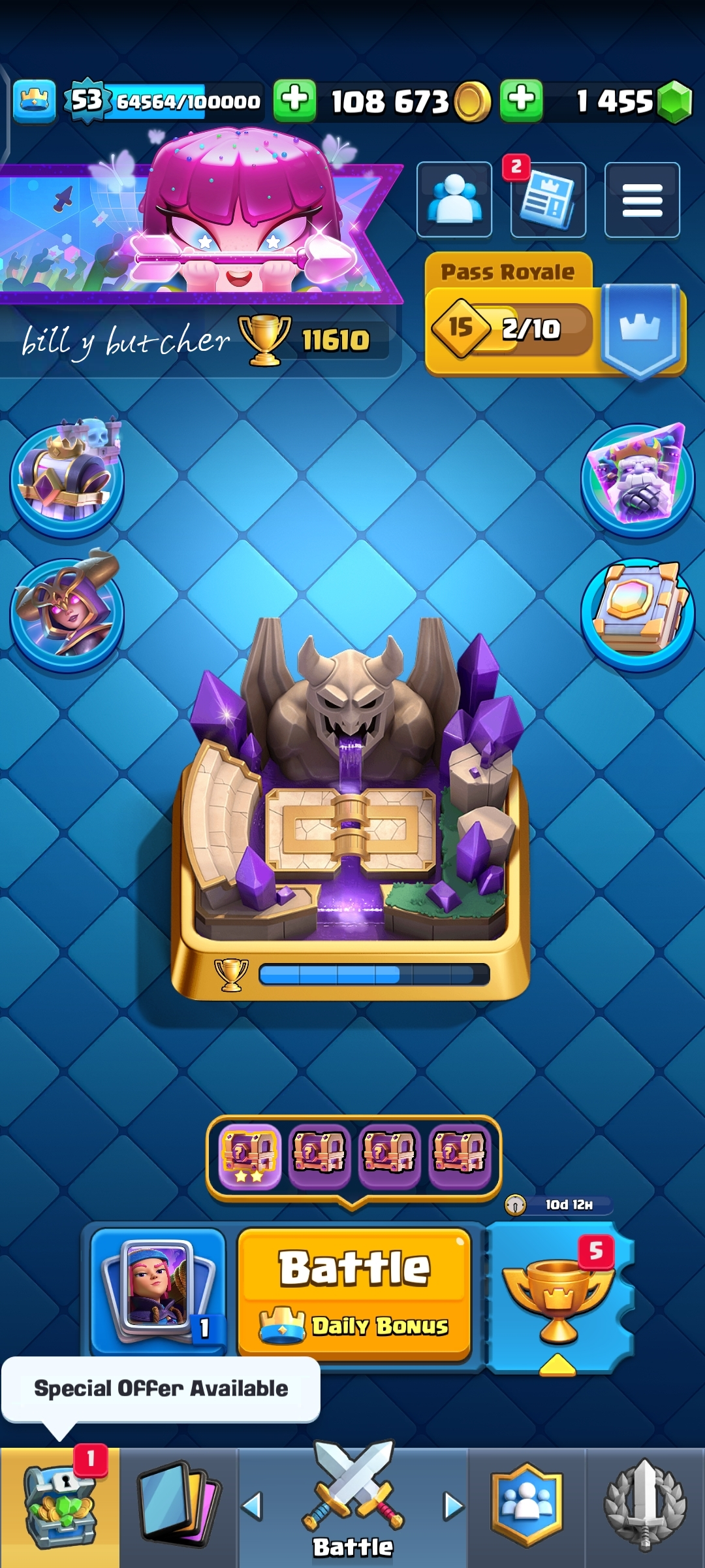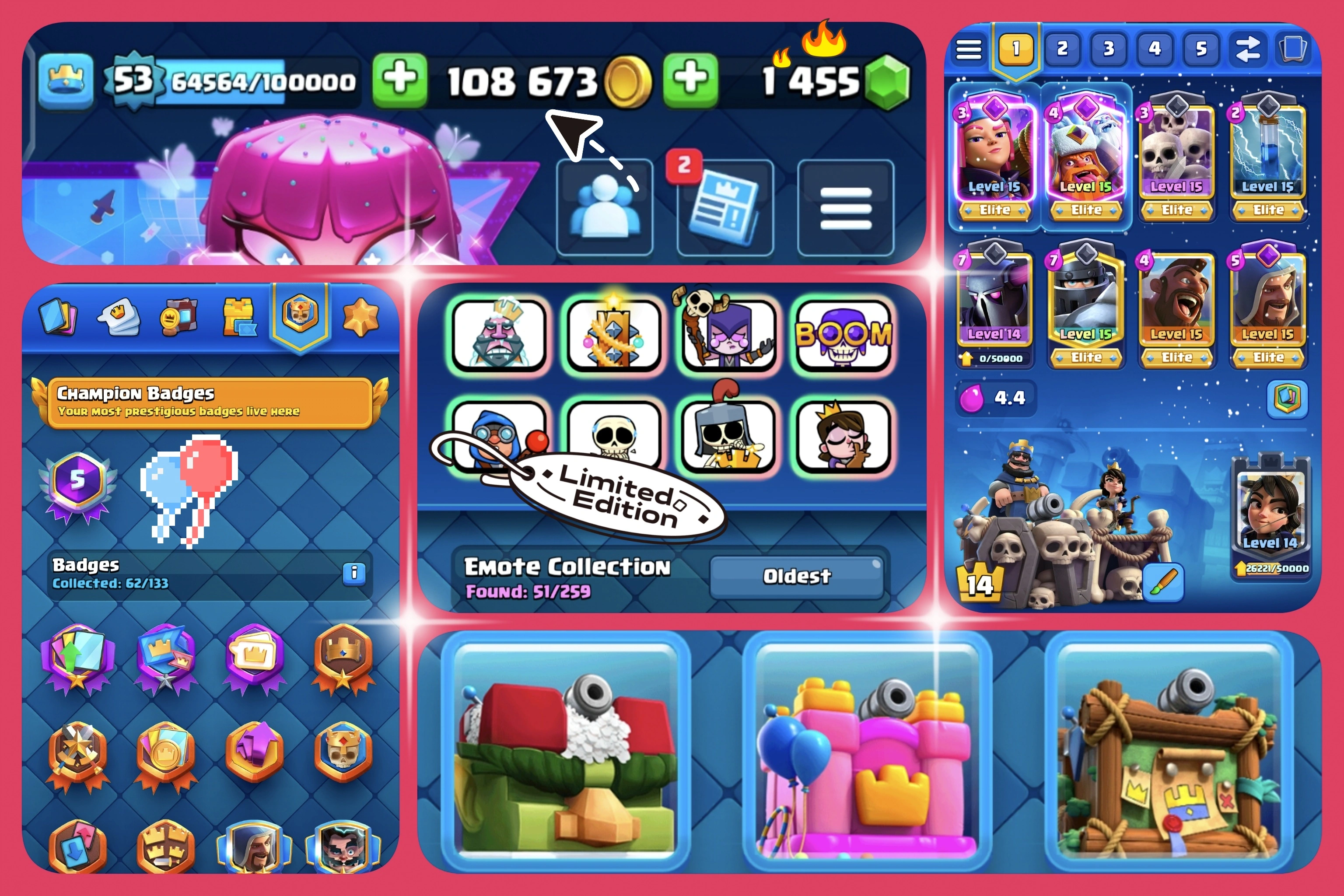 [15%OFF] 11,600 TROPHY • 1500 GEMS • SEASONAL ARENA 2 • 9 EVO • 7 ELITE • 19 MAX CARDS • 5 YEAR BADGE • 12%OFF • 50+ EMOTES • 7 CROWN SKINS • INSTANT DELIVERY • KT 14