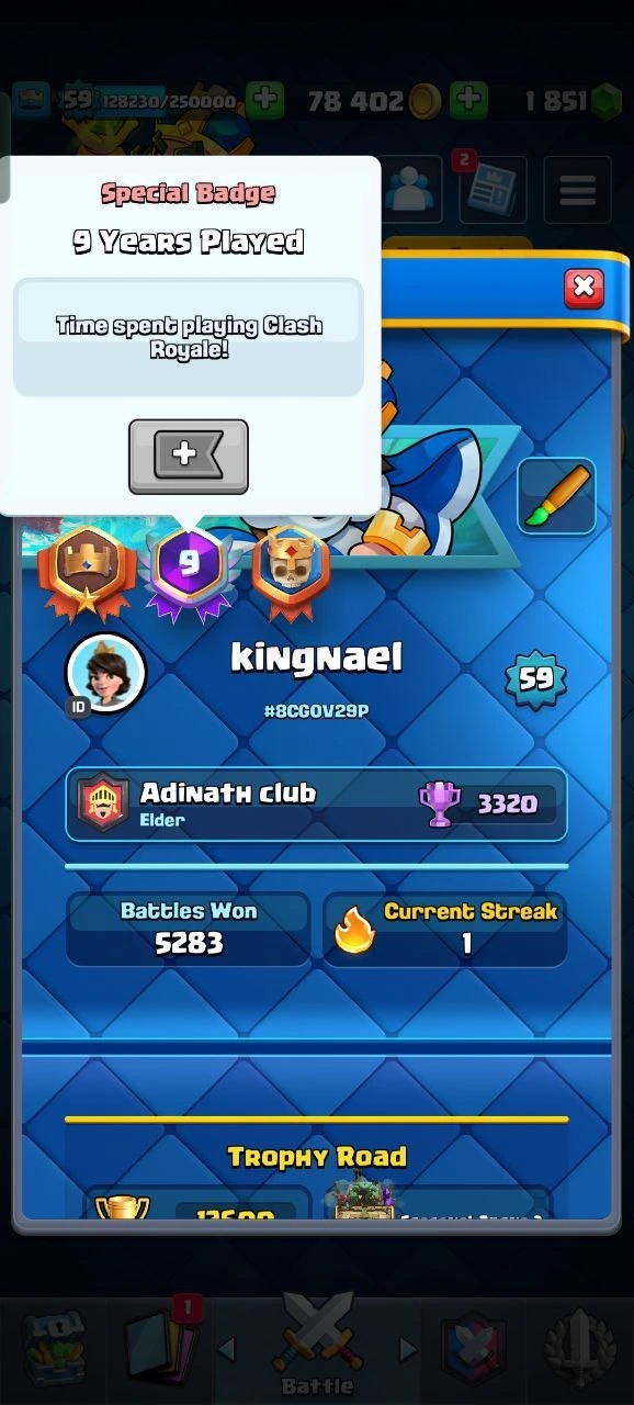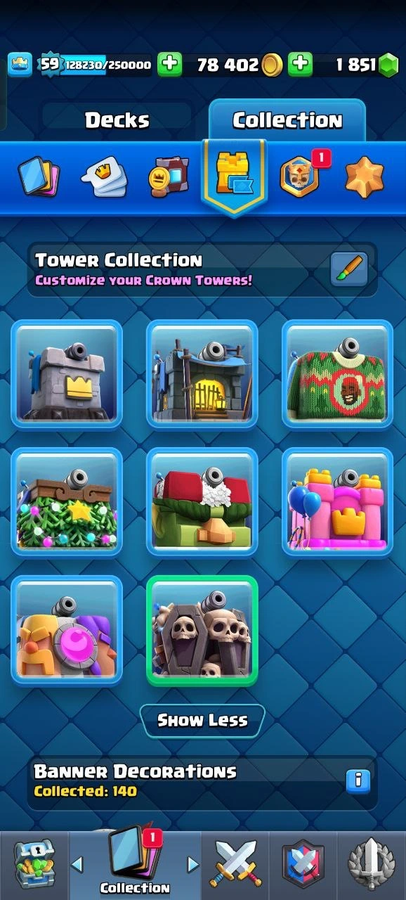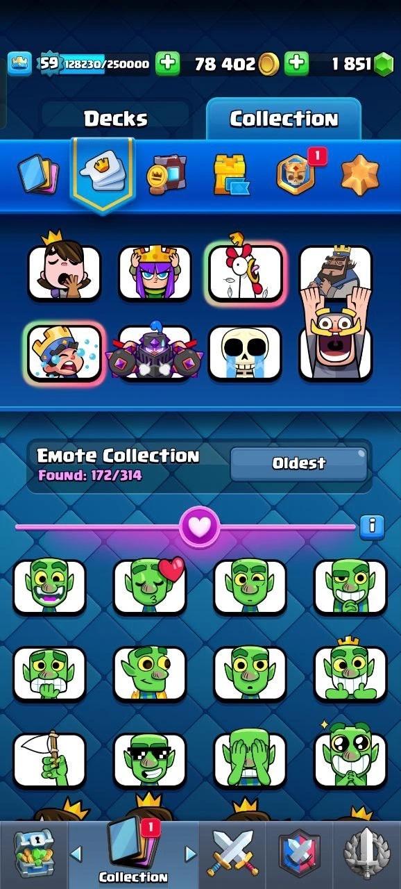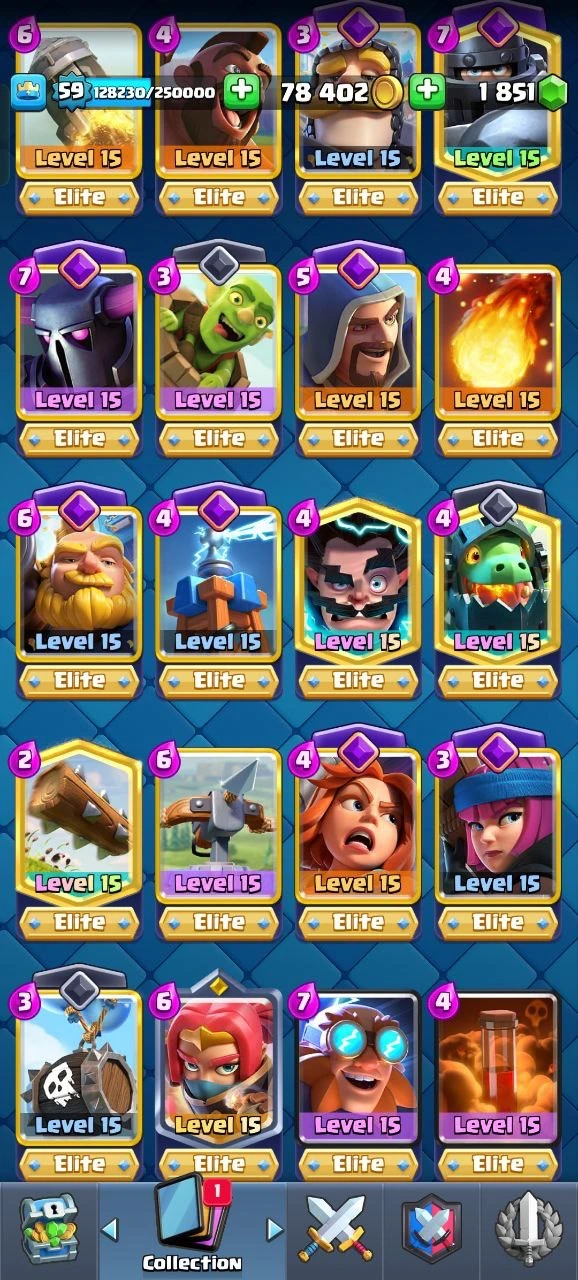 đ172 OG EMOTES COLLECTION đ12600+ Trophy đ EXCLUSIVE Acc đ 76 MaX Cards đ´ 59 LVL đKT 15 đ 9 YEAR OLD đ 8+ TOWER SKINS đ 21 ELITE CARDS đ 18 EVOLUTION đ 1800+ GEMS đ