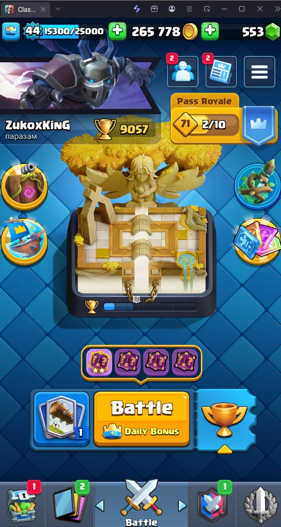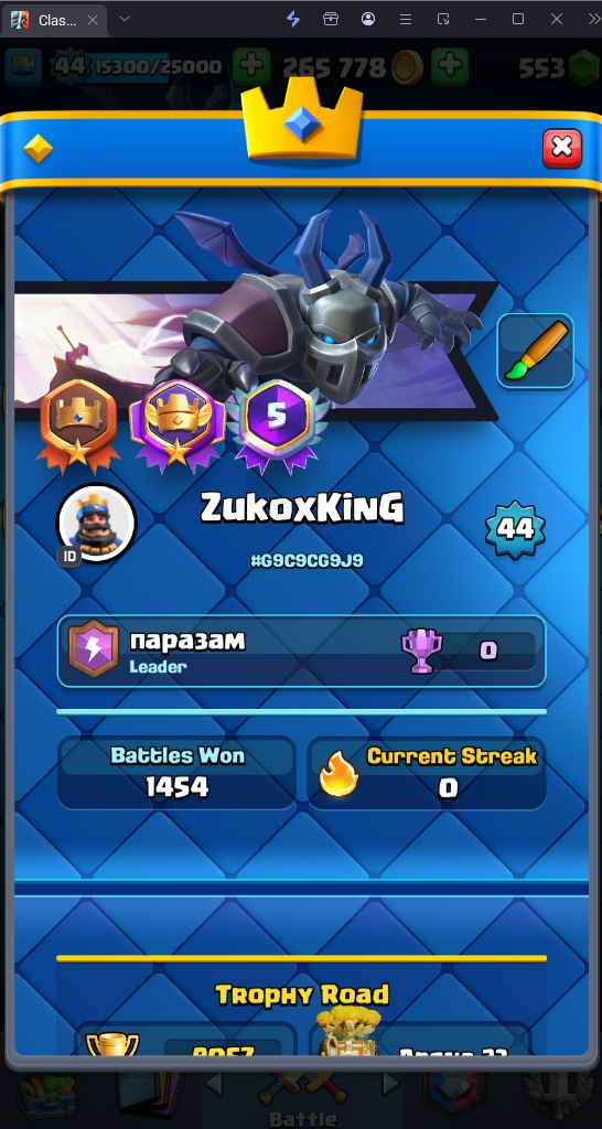 9057 TROPHY 🏆 44 LVL 💯 KT 14 👑 121 CARDS ♦️ 8 MAX CARDS 👑 1 ELITE CARDS 🔮 8 EVO 💯 EMOTE 42 🎭 #G9C9CG9J9 ⸱ TAG ACCOUNT ♥️