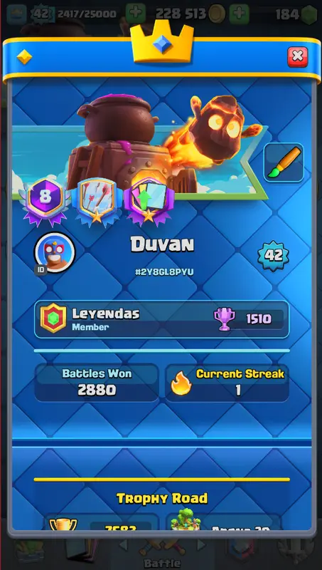 CL6238 KT 14 LEVEL 42 | Trophies:7583 | 120 Cards | 6 Cards (14LVL) | 2 Tower Skins | 45 Emotes | 228K Gold | 184 Gems | IOS/ANDROID