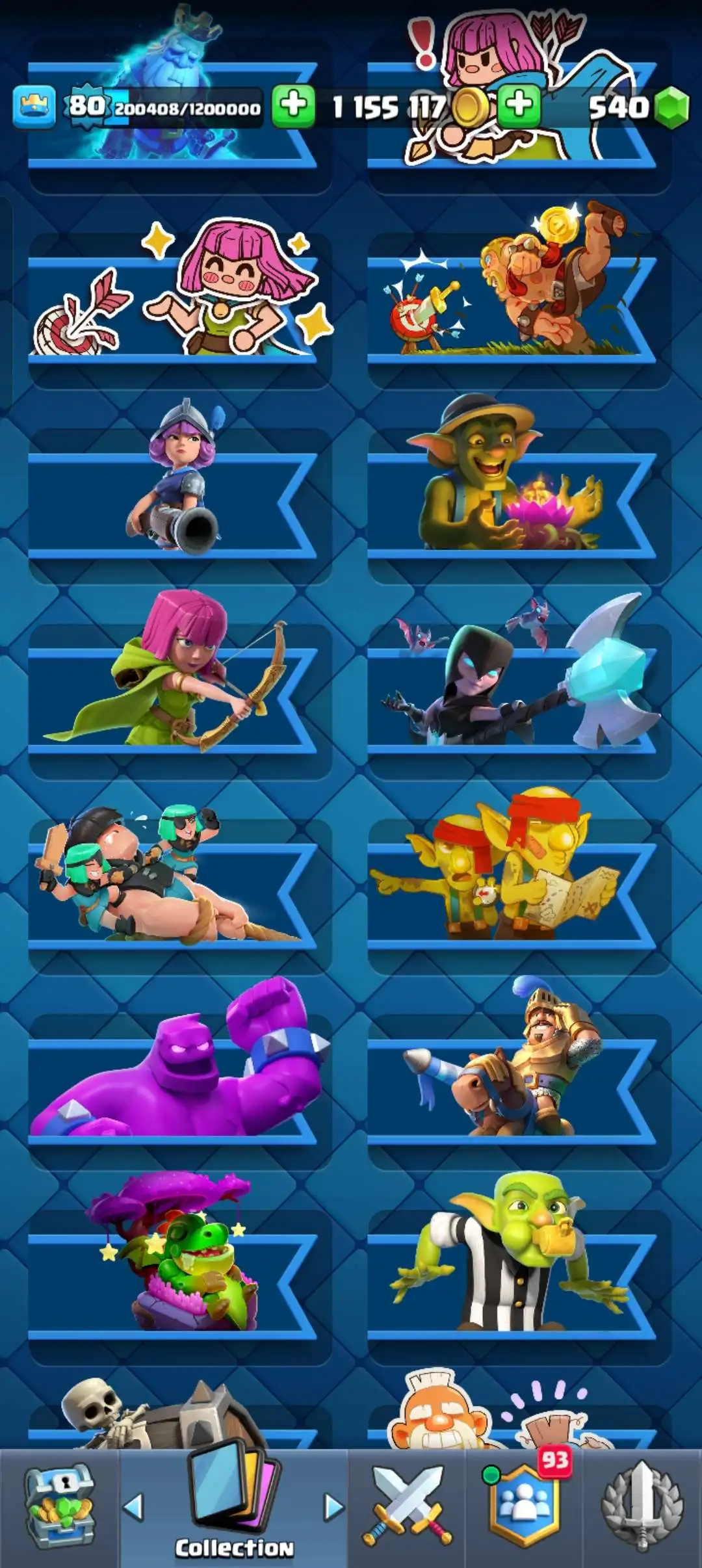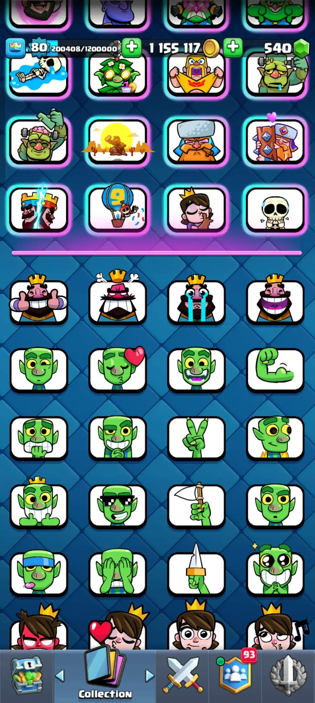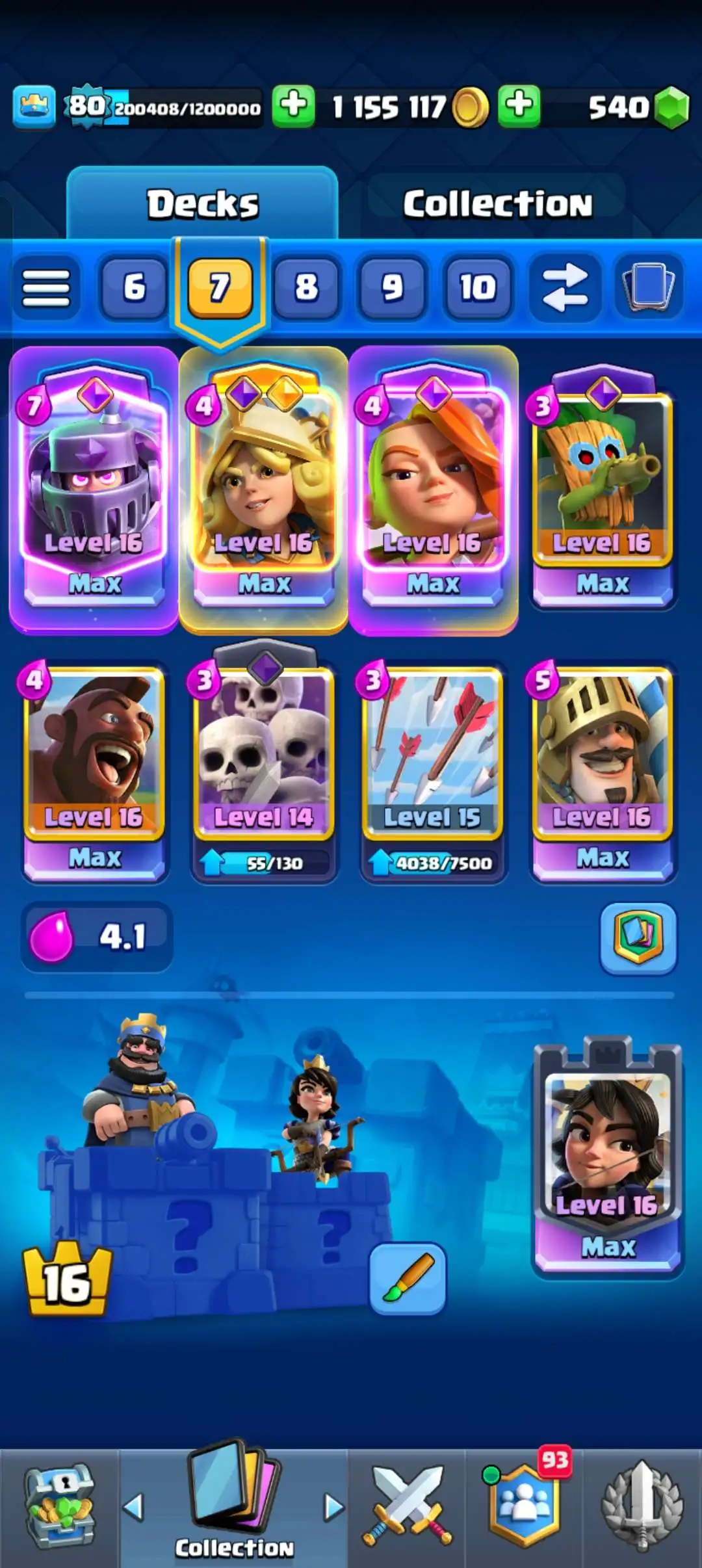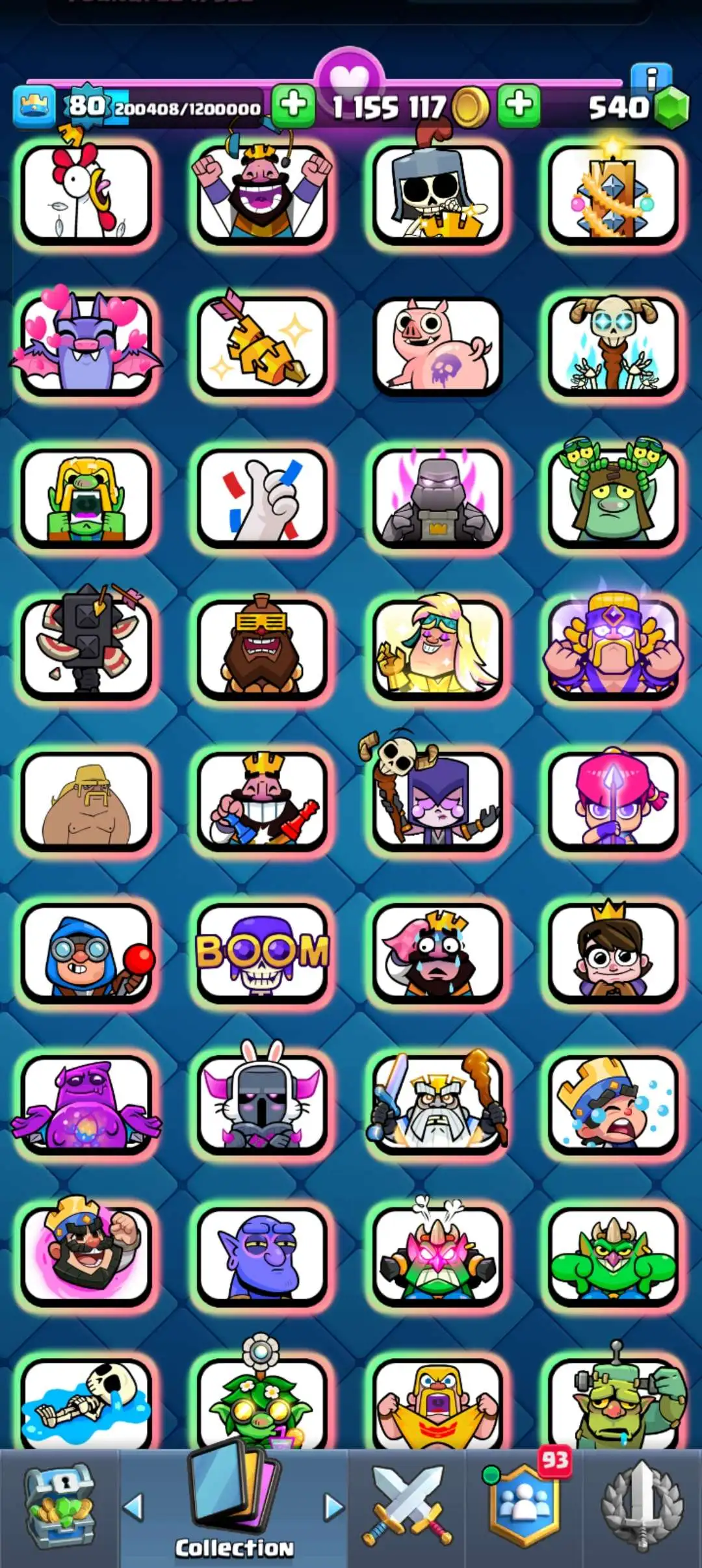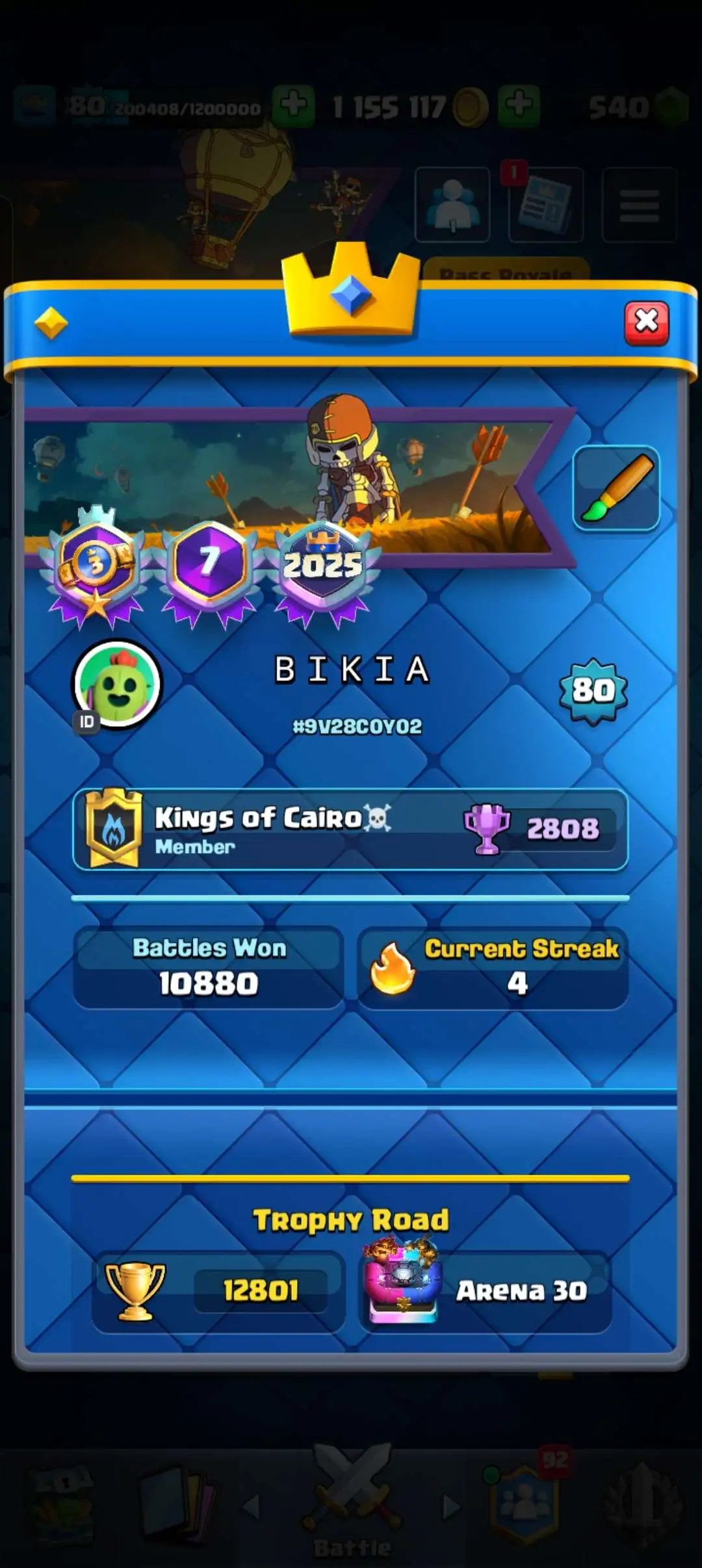 CR Lvl 80 . 6 Old seasons ✨ 12350 Trophy . Player ID CHANGEABLE 🏆 KT 16 ✨ 4 Hero ✨ 28 Evo Cards ✨ 40 max cards ✨ 75 Cards lvl 15 ✨ 224 Emotes ✨21 tower skins