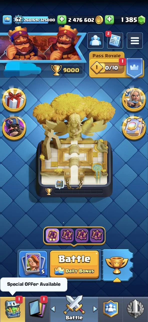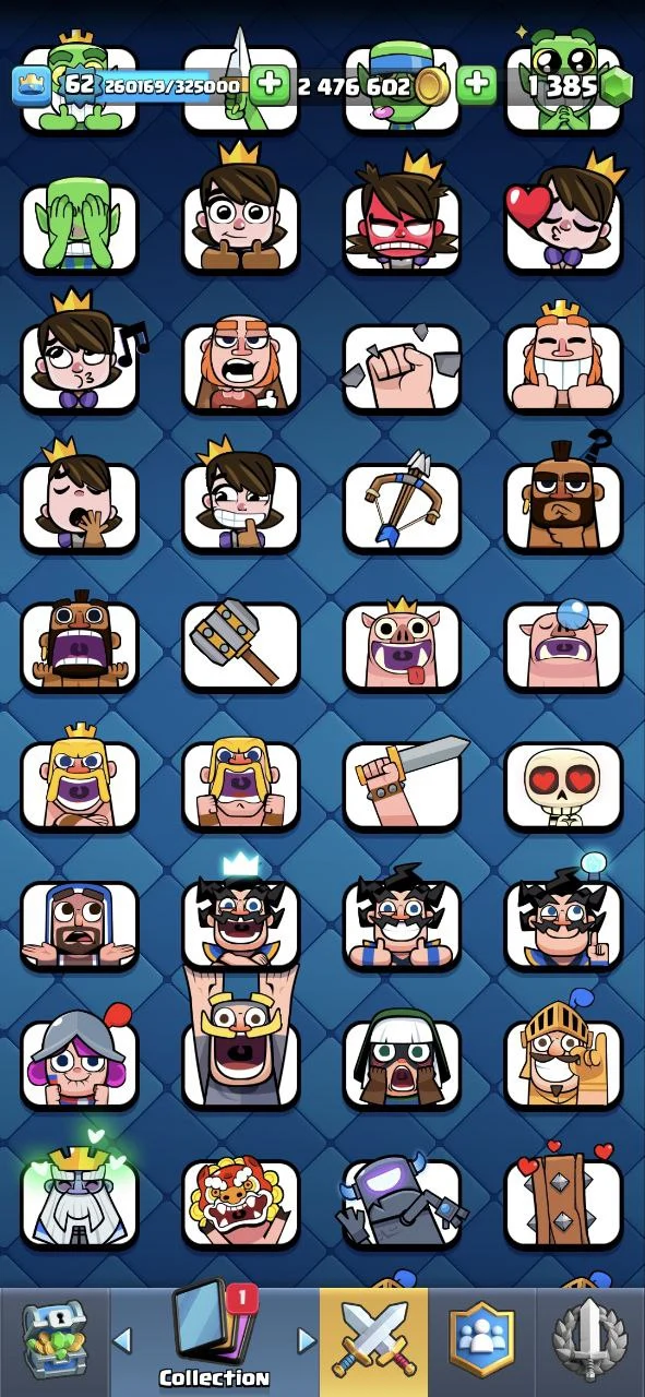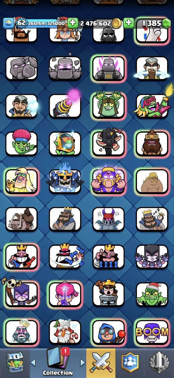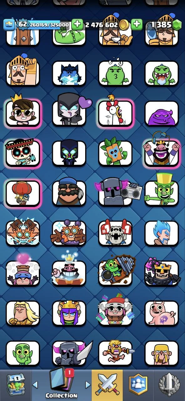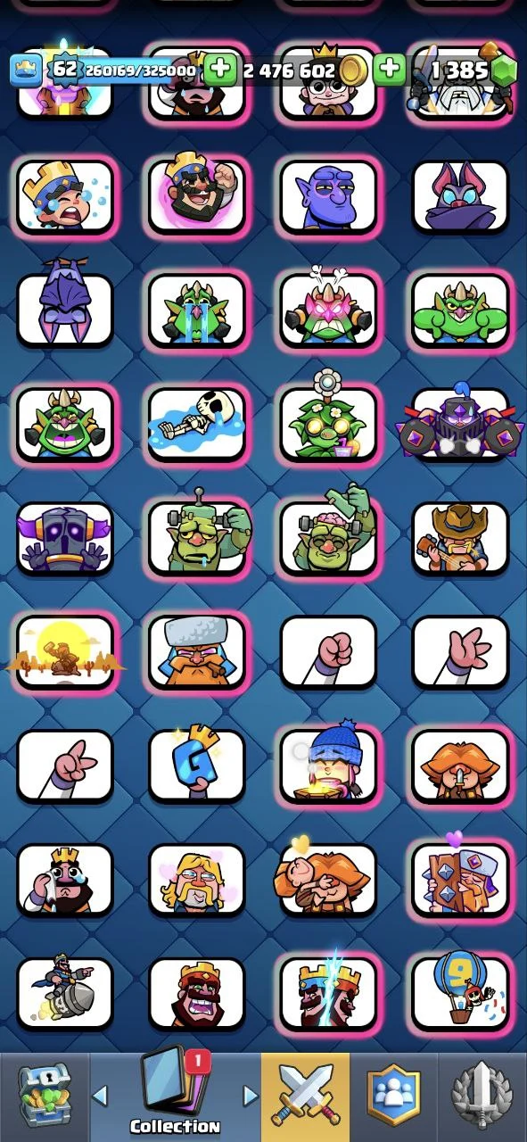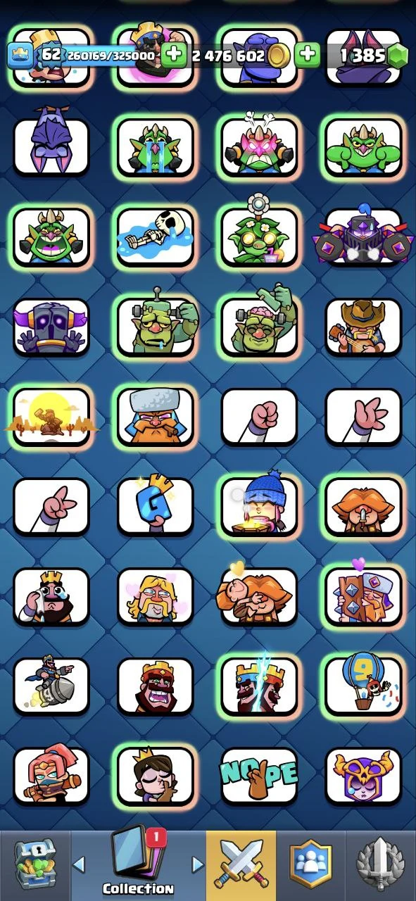 #CRL 1 EMOTE ✨ KT 15 🔱 LVL 62🏆 GOBLIN KISSING TROPHY 🏆 CUPS[9000] ✨ MAX CARDS [111] ✨ ELITE [33] ✨ EVO [15] ✨ LVL 14 [78] ✨ EMOTES [176] ✨ SKINS [12] 🔱 CARDS [119] ✨ 10000% SAFE