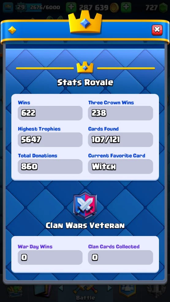 ๐ KT 10 ๐ 5559 Trophy ๐ 29 LVL ๐ 107 Cards ๐ 20 Emotes ๐ 727 Gems ๐ 287 k Gold ๐