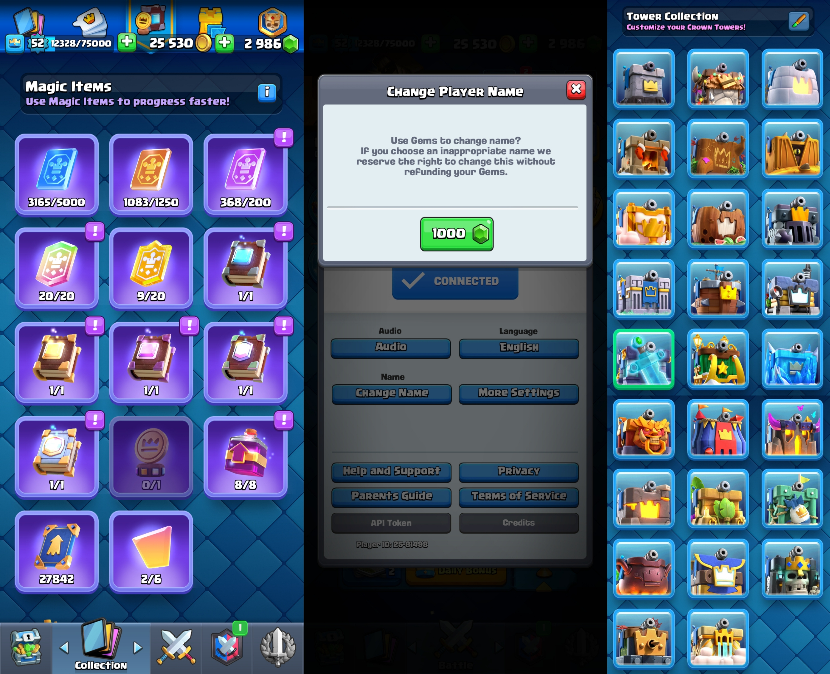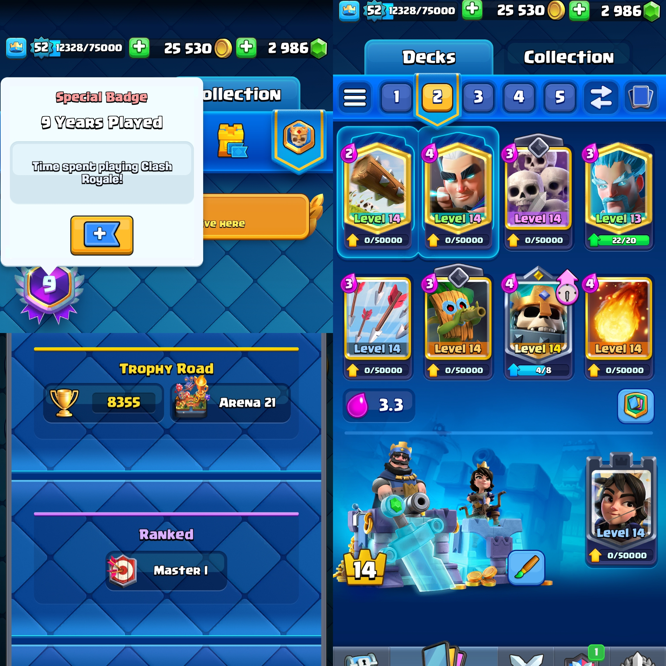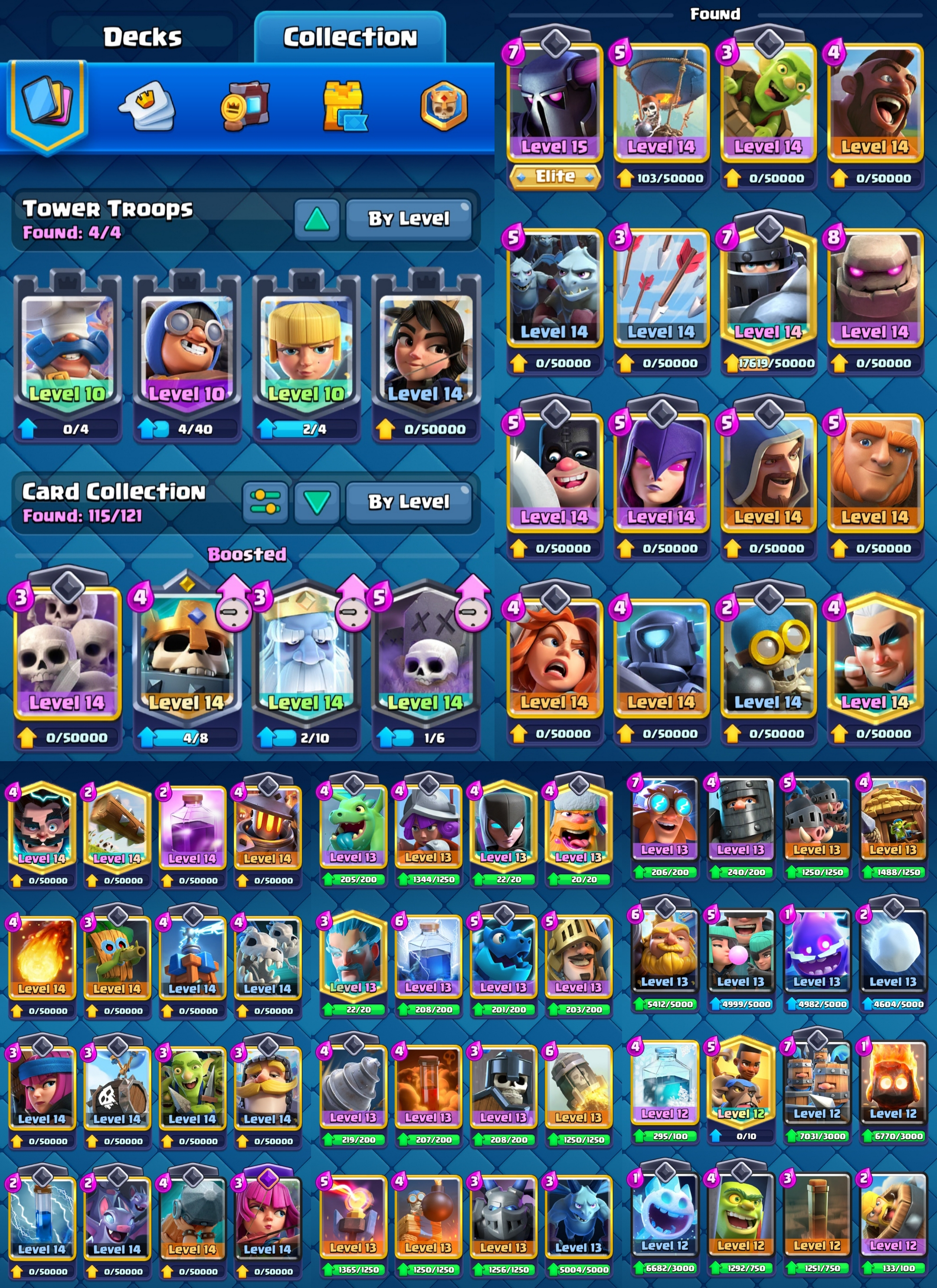⭐ KT 14 ⭐ 52 EXP ⭐ RARE EMOTE ( GOBLIN KISSING & RAINDOW PRINCE ) ⭐ 1 ELITE & 33 MAX CARD ⭐ 1 EVO ⭐ 25 TOWERSKINS ⭐ HEAVY MAGIC ITEMS ⭐ 2900 GEMS