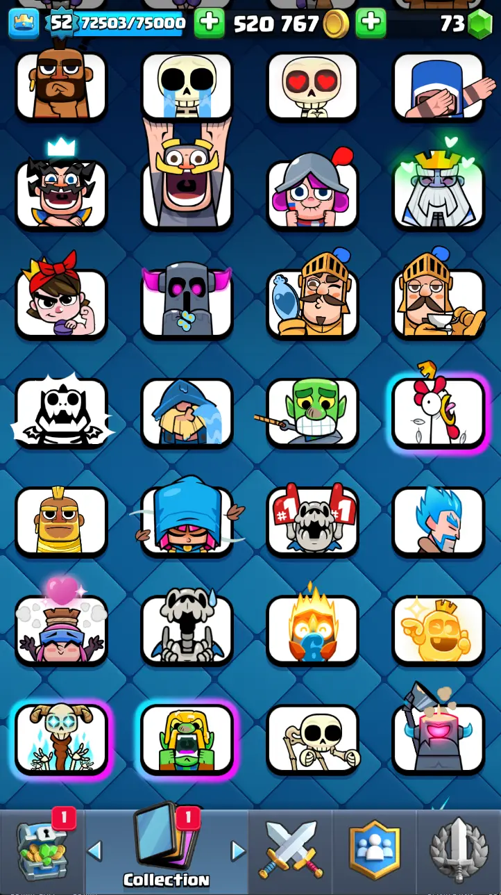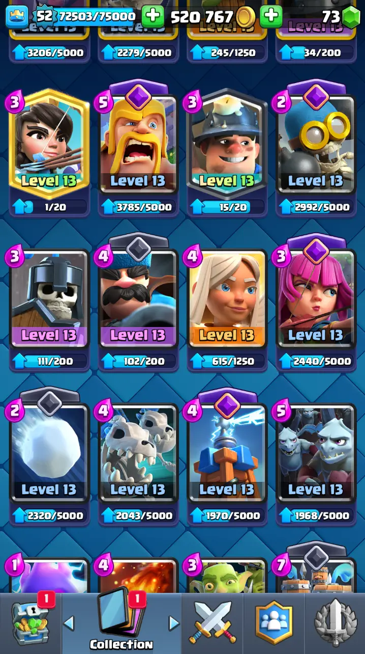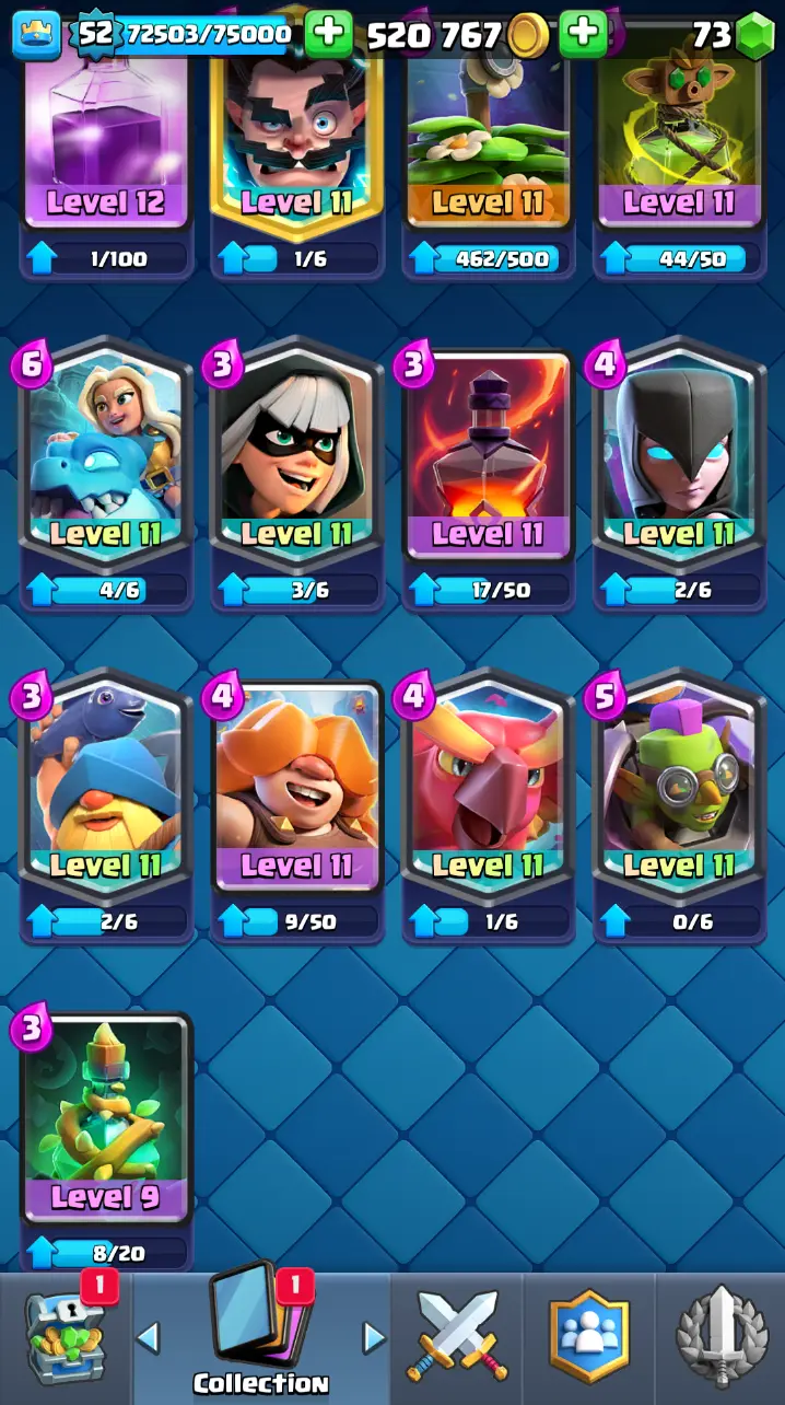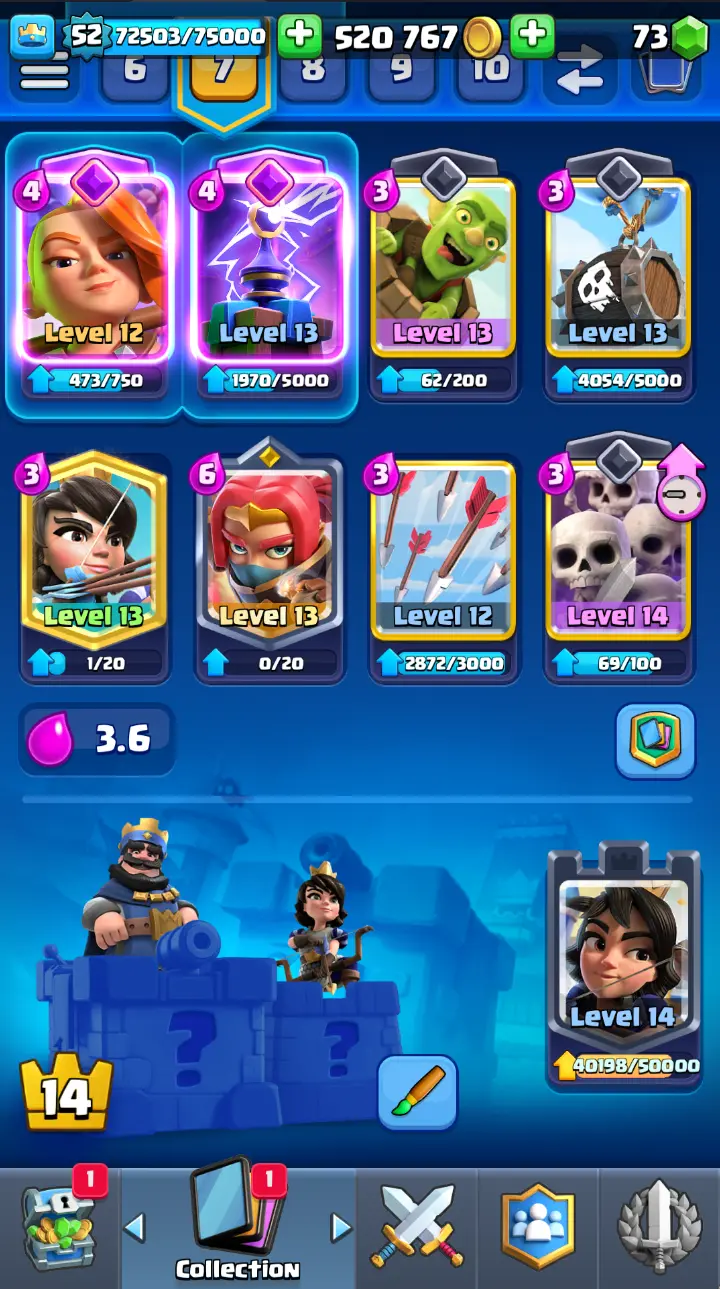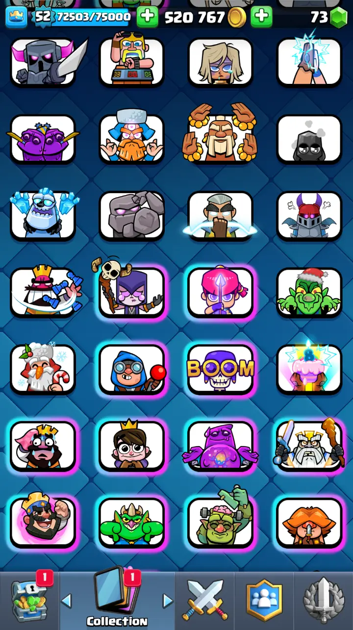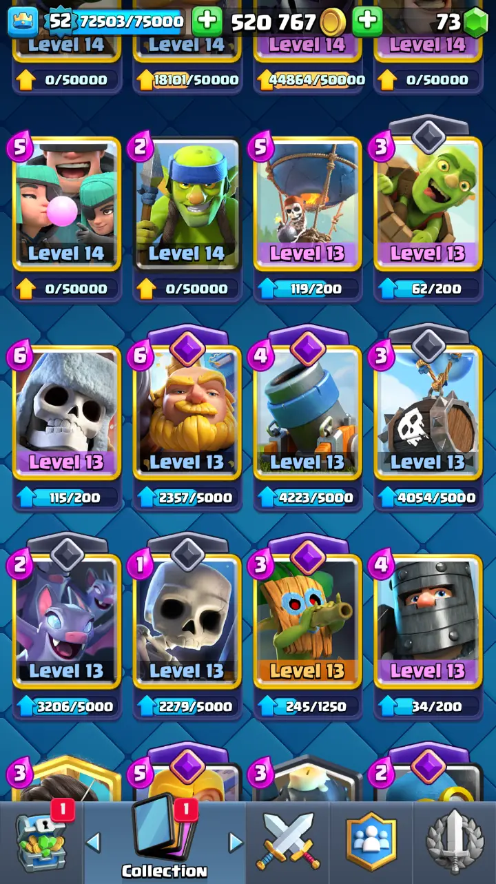 ◀️ KT 14 ▶️ LEVEL 52 🤩 9000 TROPHIES 🏆 3 ELITE CARD 🙀 7 MAX CARD 😎 13 EVO ☠️ 86 EMOTE 😍 7 SKIN 👽 121 CARDS 💳 520k GOLD 💰 73 GEMS 💎 RL126