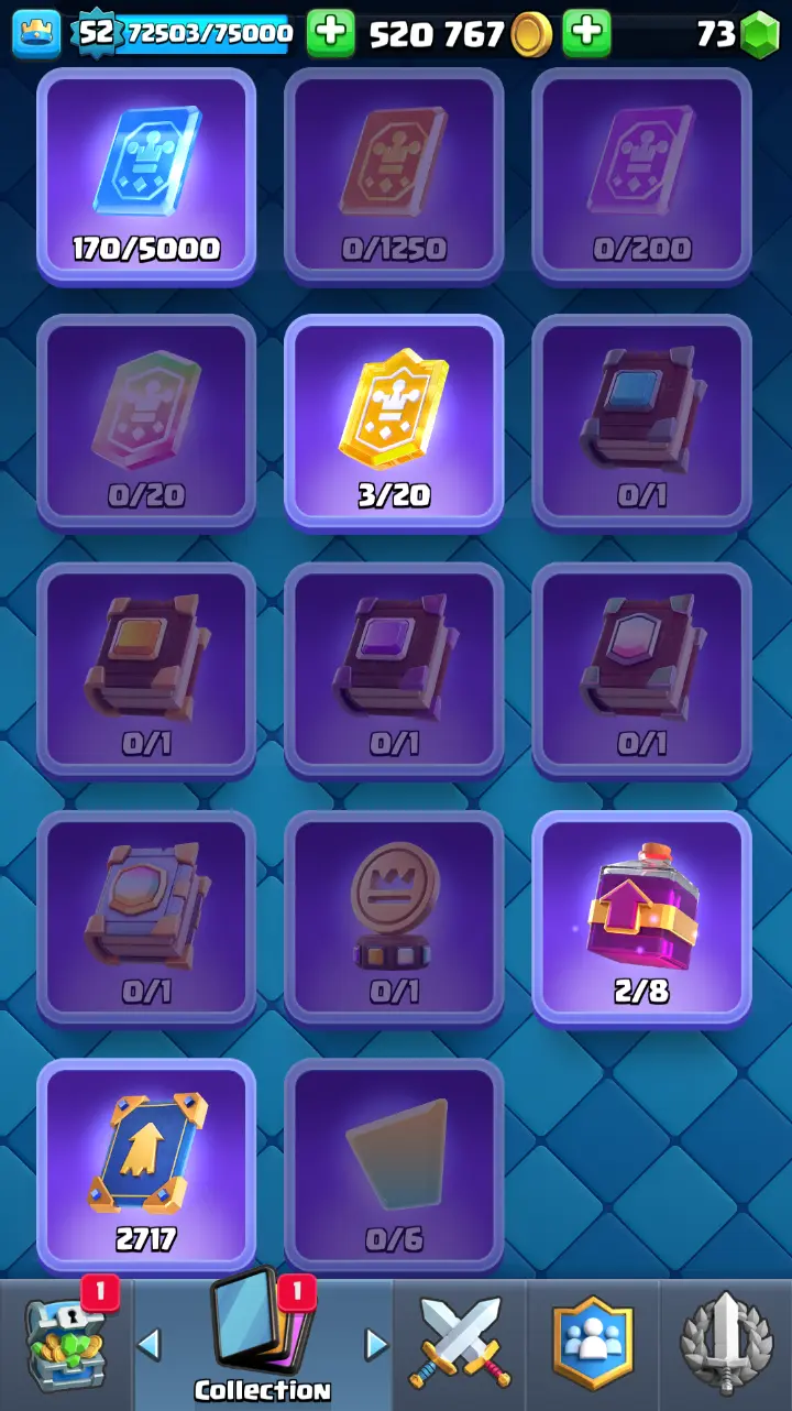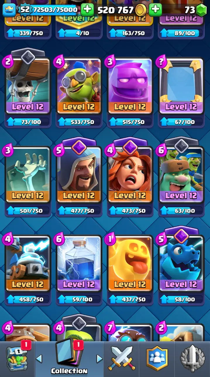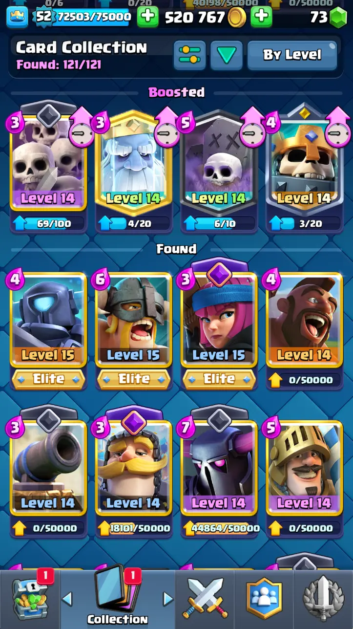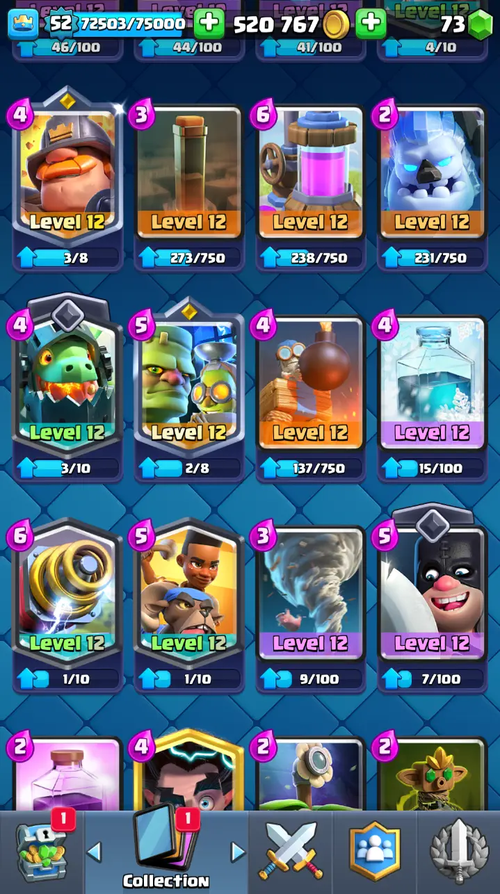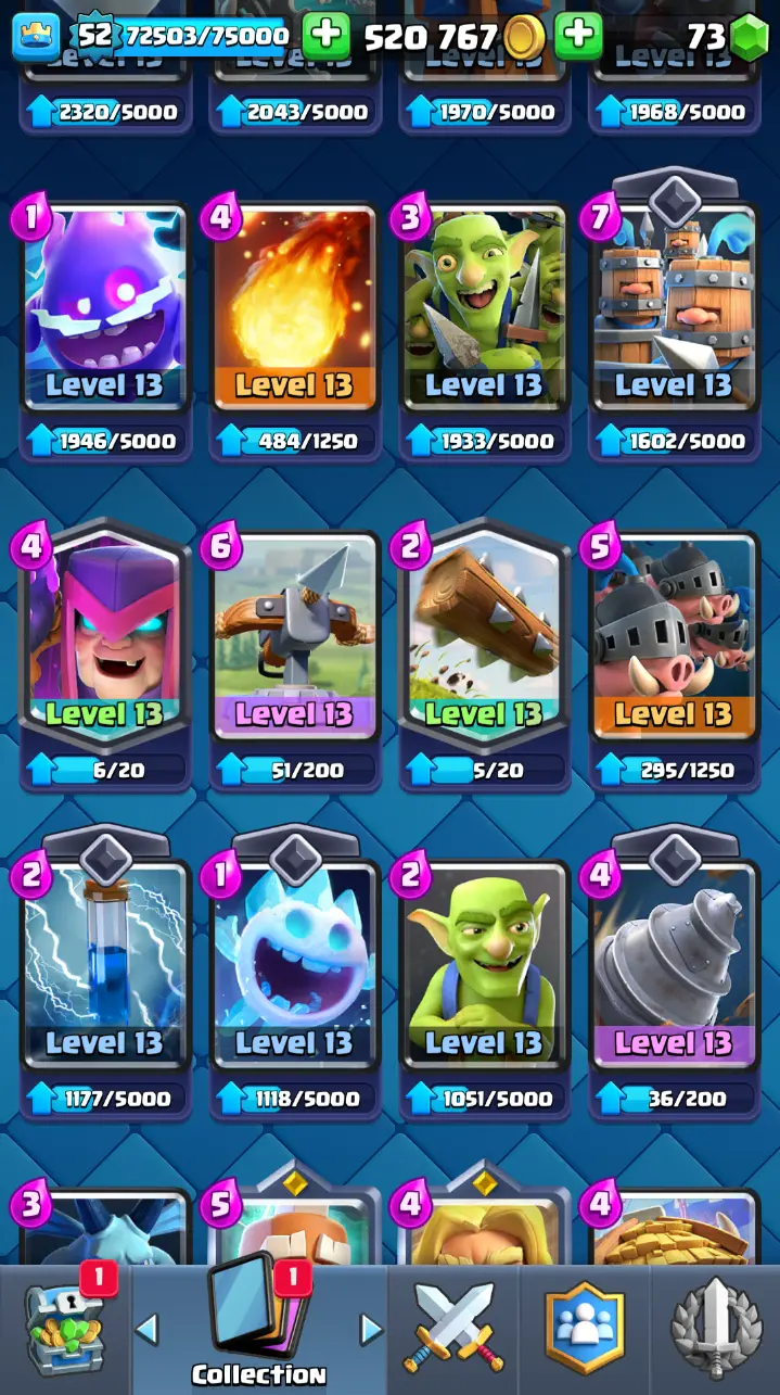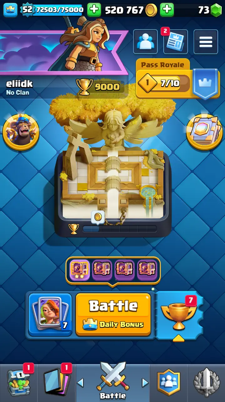 ◀️ KT 14 ▶️ LEVEL 52 🤩 9000 TROPHIES 🏆 3 ELITE CARD 🙀 7 MAX CARD 😎 13 EVO ☠️ 86 EMOTE 😍 7 SKIN 👽 121 CARDS 💳 520k GOLD 💰 73 GEMS 💎 RL126