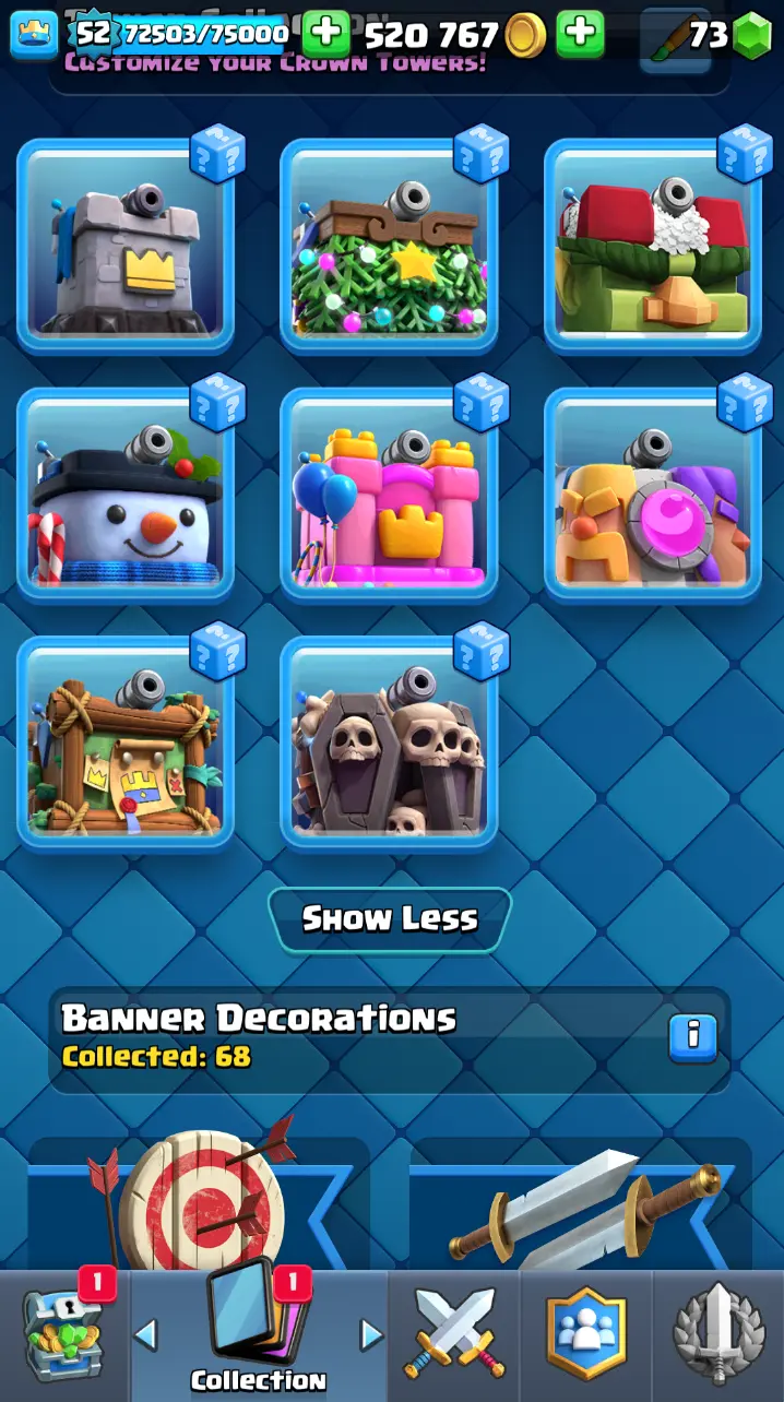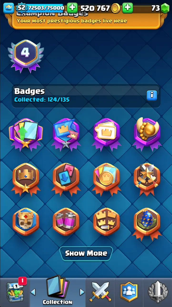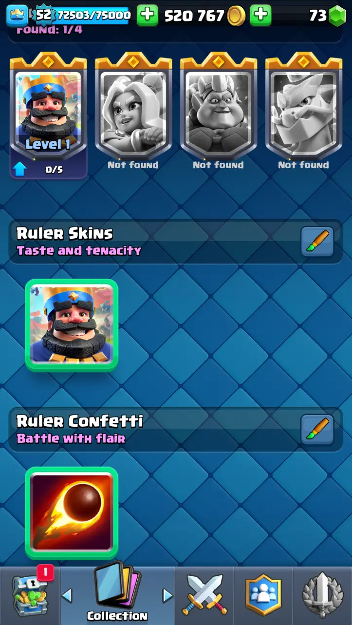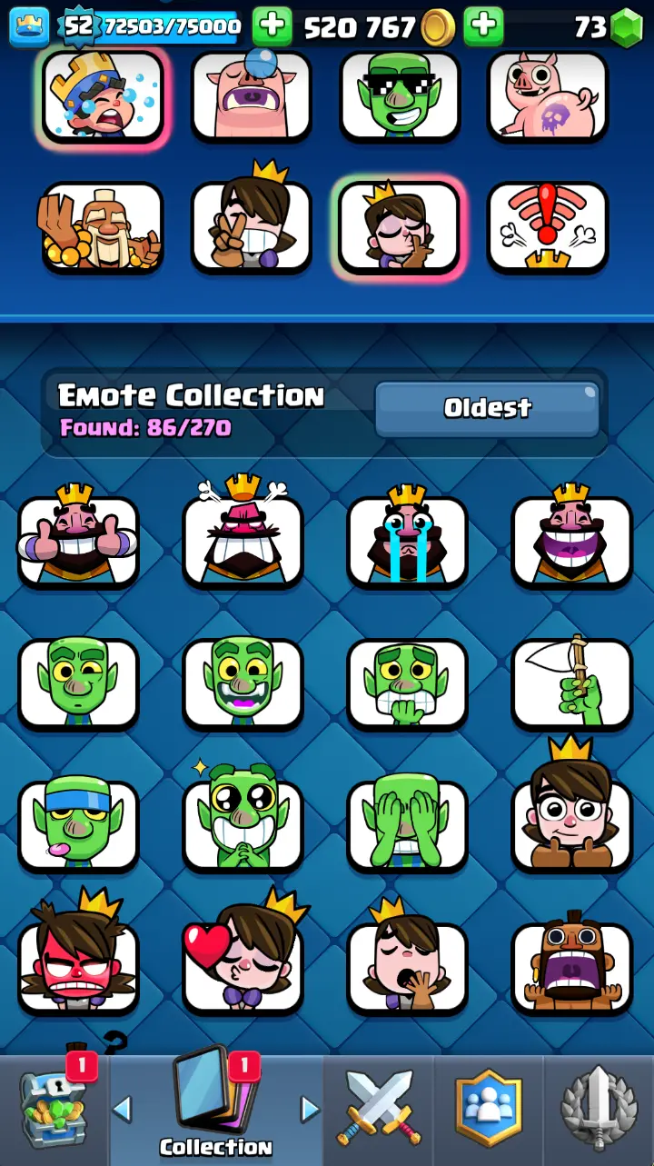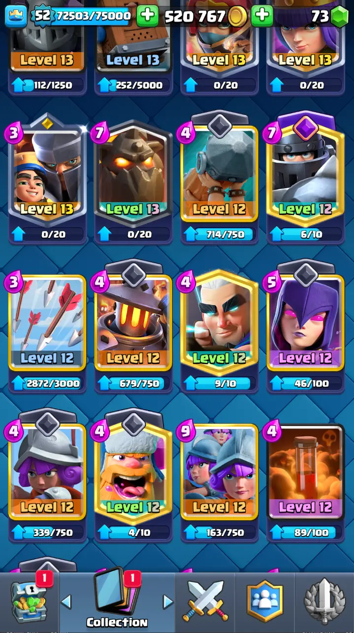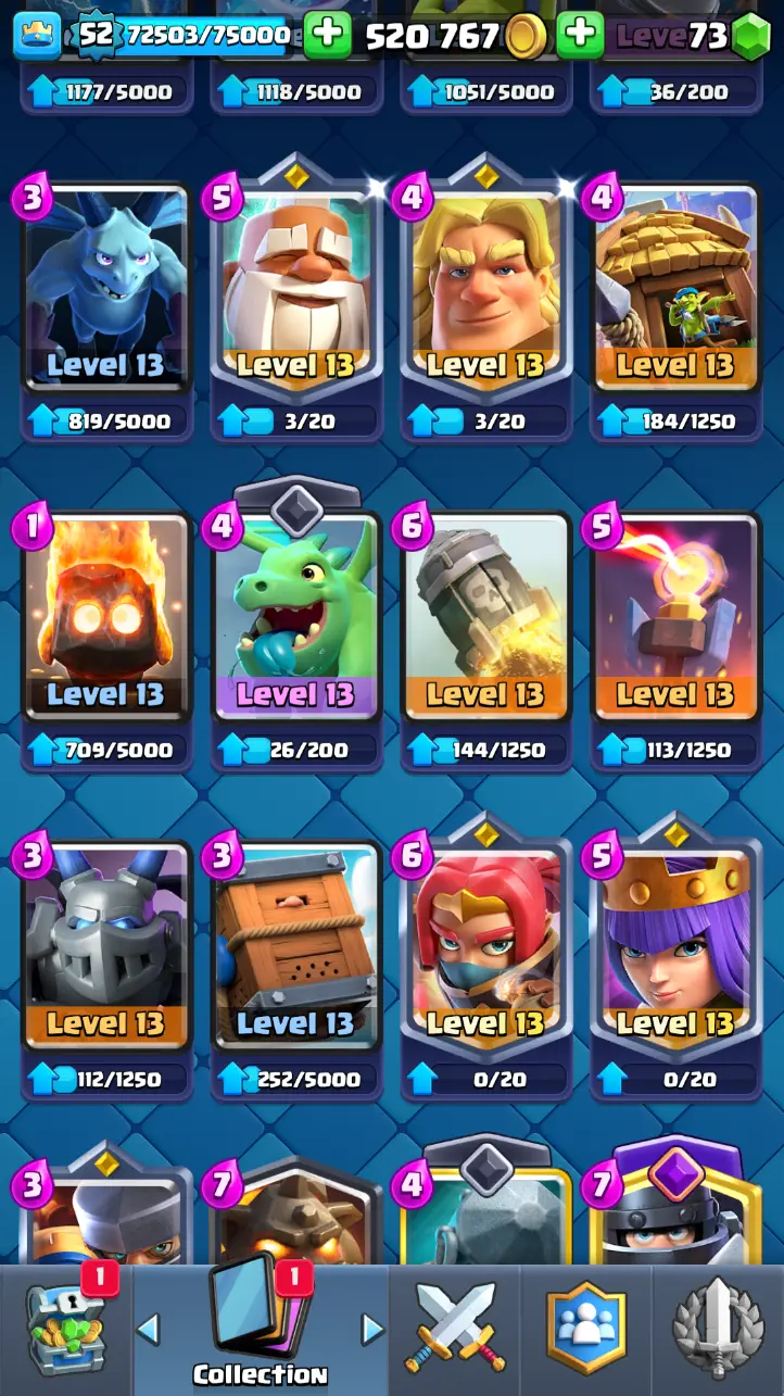 ◀️ KT 14 ▶️ LEVEL 52 🤩 9000 TROPHIES 🏆 3 ELITE CARD 🙀 7 MAX CARD 😎 13 EVO ☠️ 86 EMOTE 😍 7 SKIN 👽 121 CARDS 💳 520k GOLD 💰 73 GEMS 💎 RL126