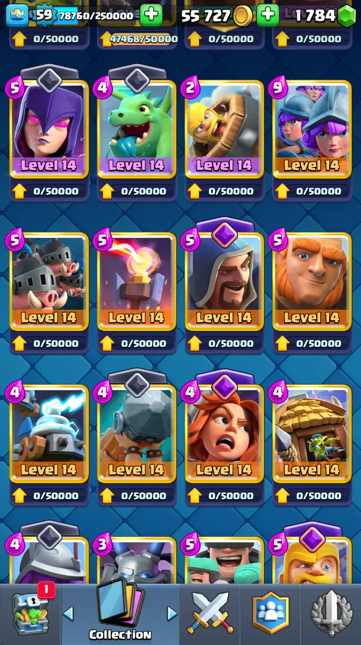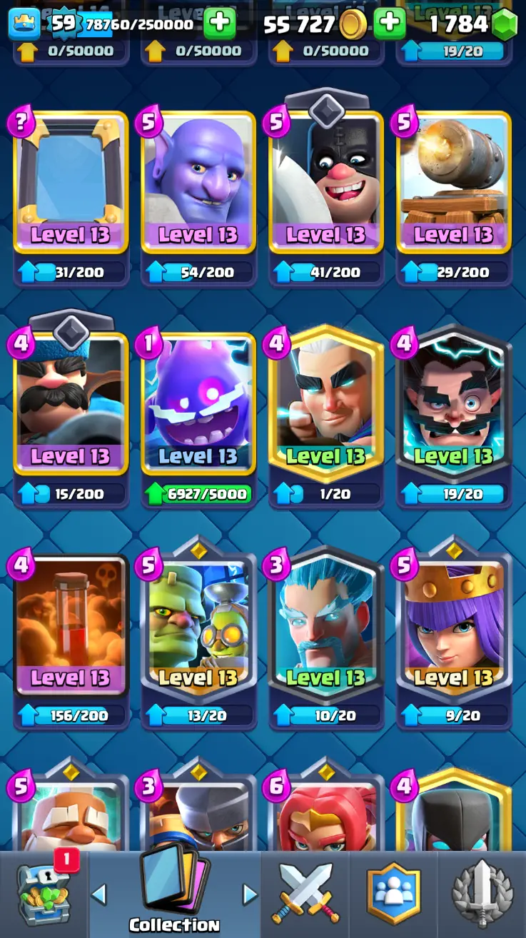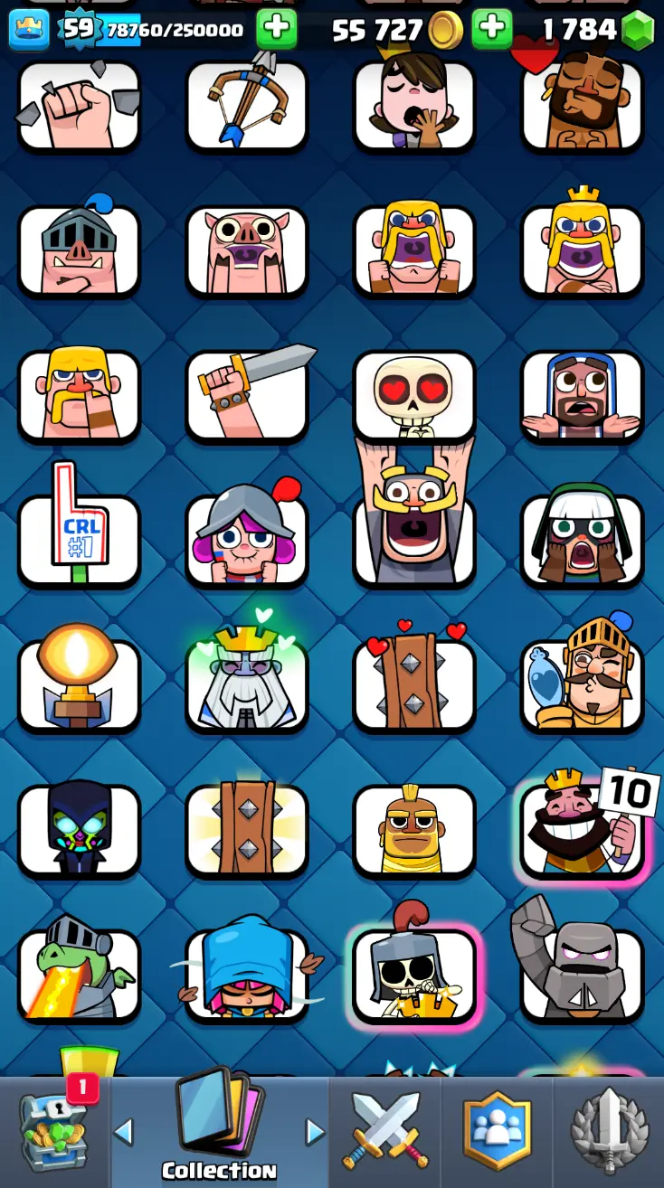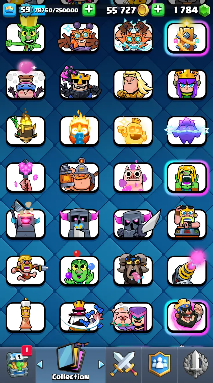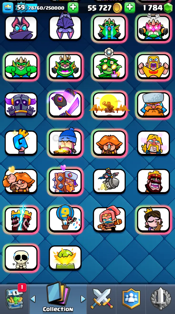 ◀️ KT 15 ▶️ LEVEL 59 🤩 11000 TROPHIES 🏆 18 ELITE CARD 🙀 62 MAX CARD 😎 16 EVO ☠️ 130 EMOTE 😍 7 SKIN 👽 121 CARDS 💳 55k GOLD 💰 1784 GEMS 💎 RL150