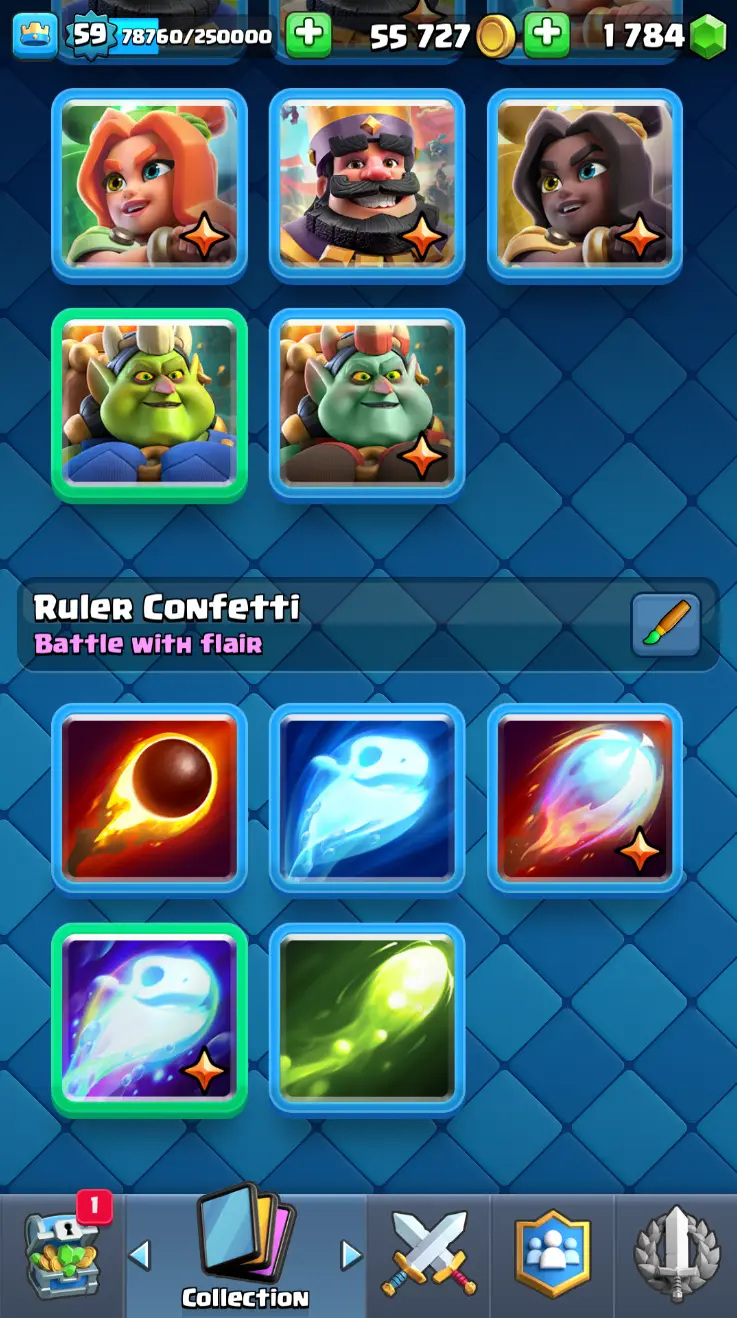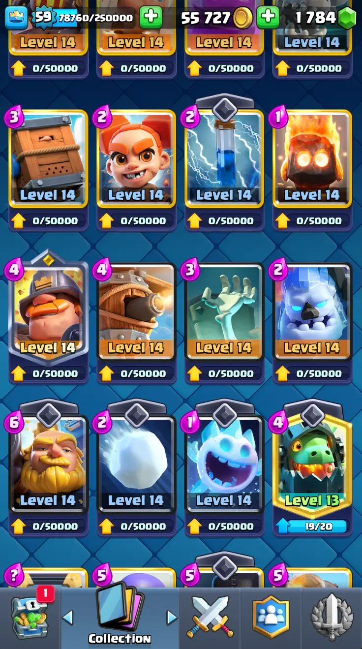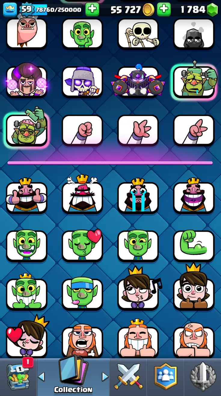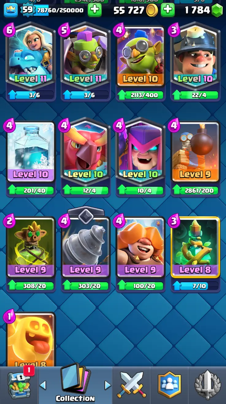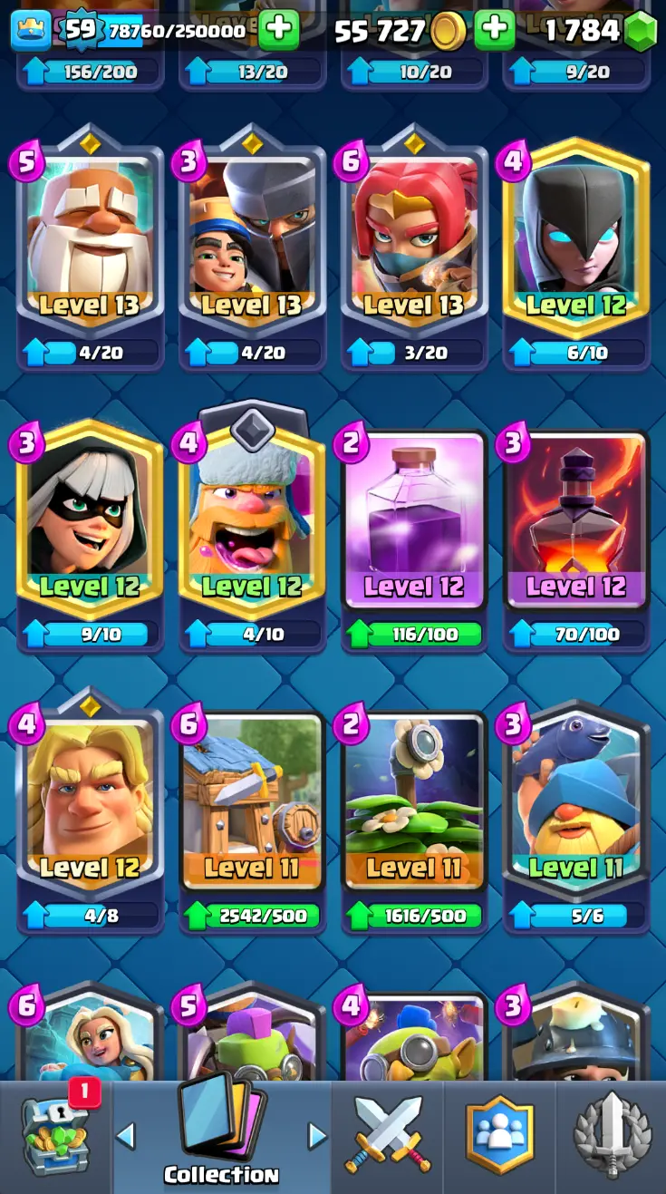 ◀️ KT 15 ▶️ LEVEL 59 🤩 11000 TROPHIES 🏆 18 ELITE CARD 🙀 62 MAX CARD 😎 16 EVO ☠️ 130 EMOTE 😍 7 SKIN 👽 121 CARDS 💳 55k GOLD 💰 1784 GEMS 💎 RL150