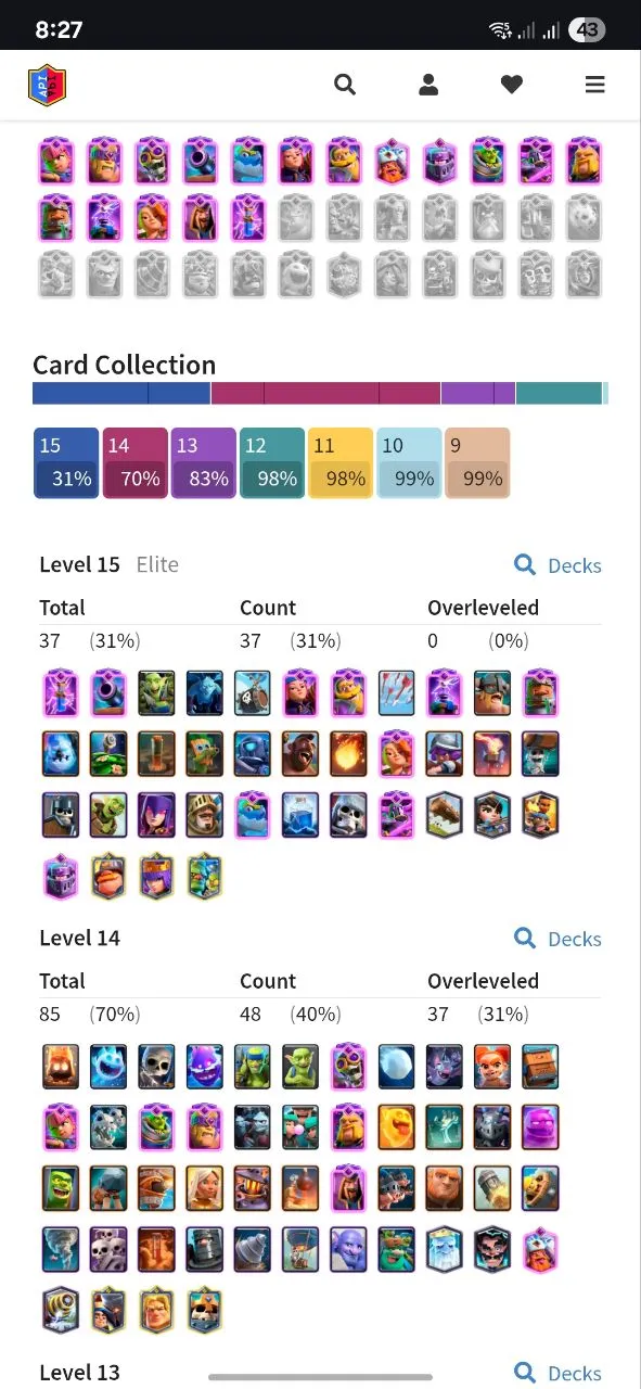 KT 15 🌸 Lvl62 🌸 37 Elites [Level 15]🌸 85 Max Cards [ Level 14] 🌸 17 Evos 🌸12 Tower Skins 🌸128 Emotes 🌸Ultimate Champion 🌸Instant Delivery 🌸 VS7