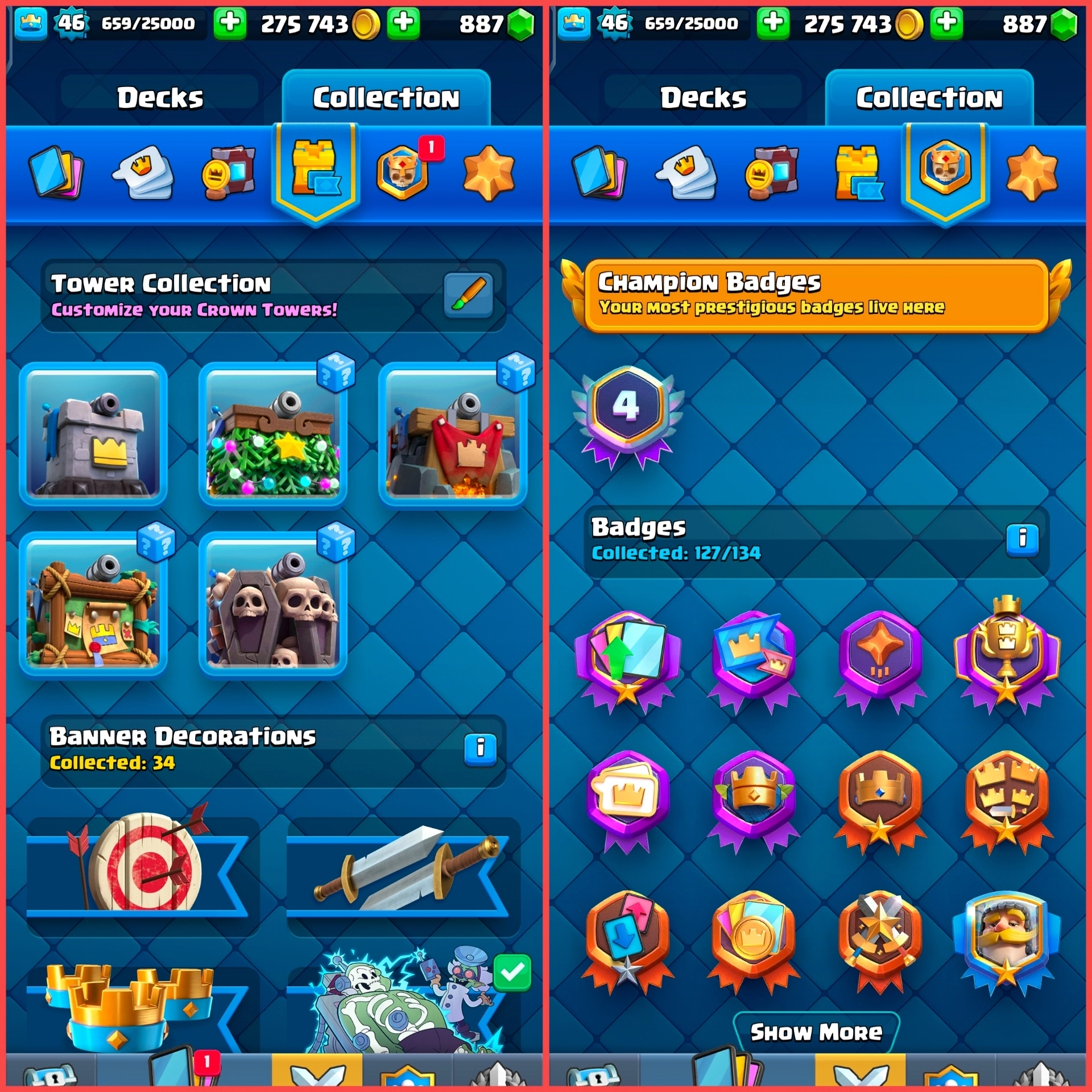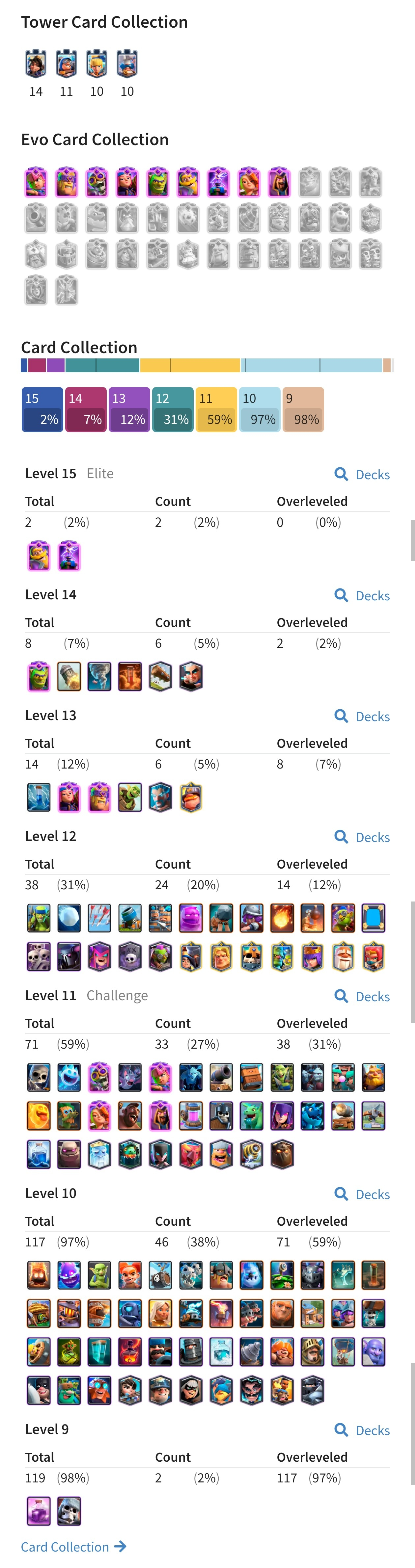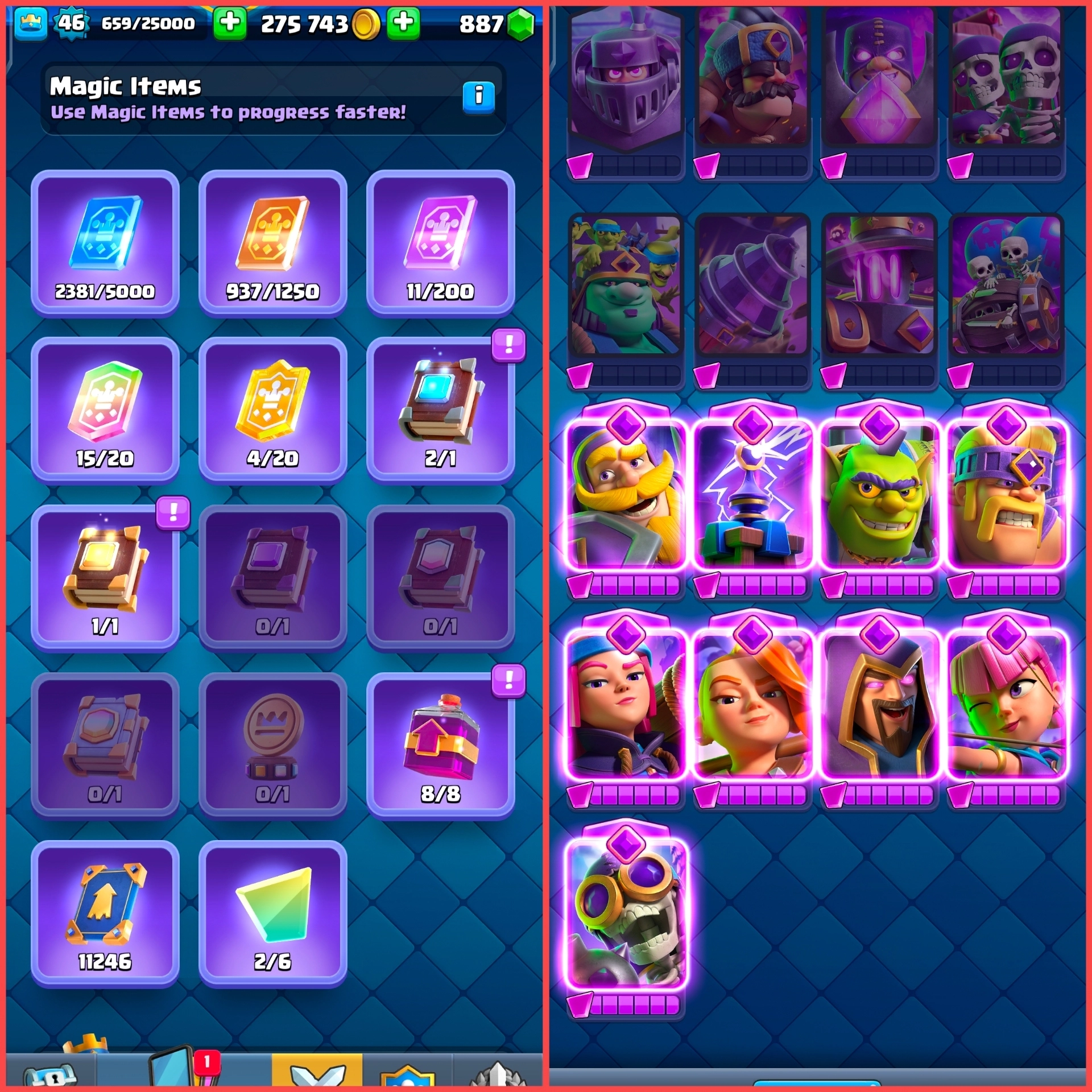 Level 46, 275k Gold & 7.3k Trophies | NC Avbl, 120 ALL Cards | 9 Evos Unlock | 6 Cards Level 14, 2 Level 15, 24 Lvl-12, 33 Lvl-11 & 46 Lvl-10 | CH437