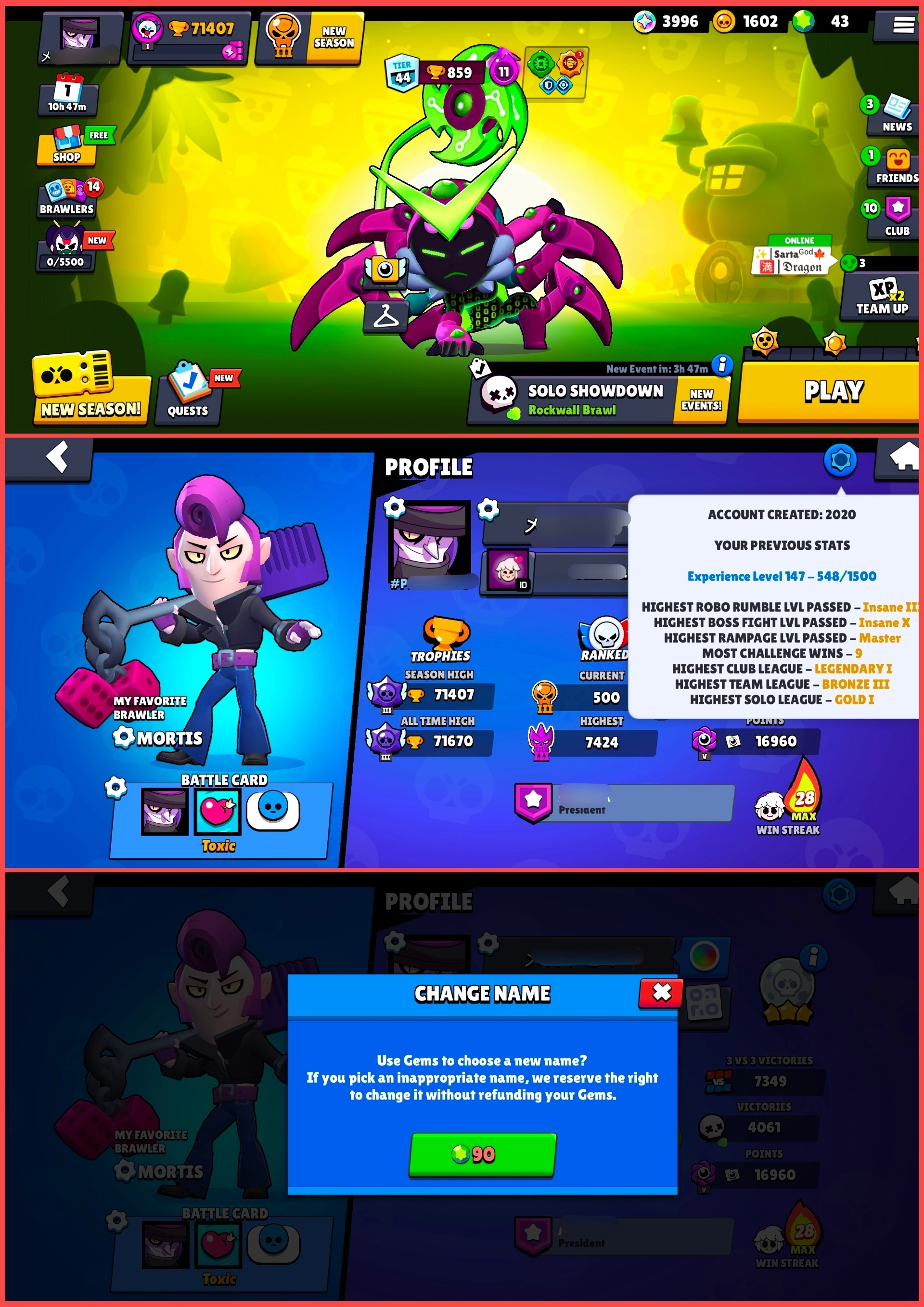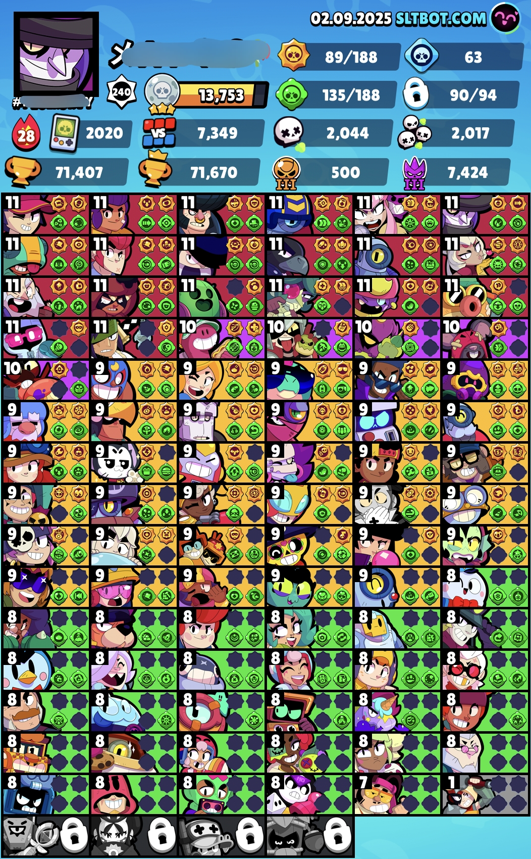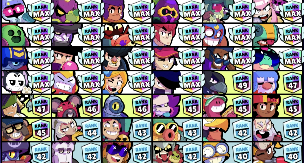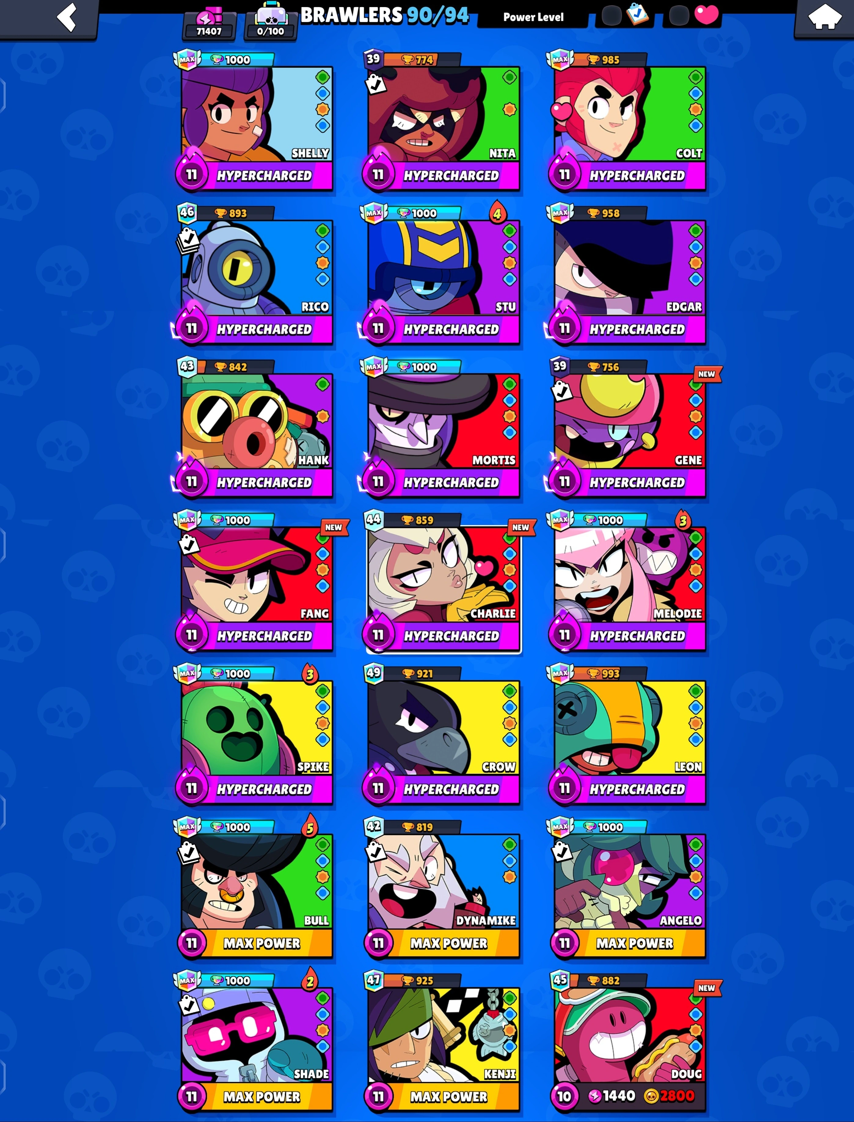*22 Max Ranks* 💪 71k Trophies 🏆 90 Brawlers 🤖 [20 Max Power 💪 15 Hypers ⚡] 72 Rare 🟩 69 Super Rare 🟦 27 Epic 🟪 5 Mythic 🟥 5 Legendary 🟨 5 Hypers ⚡ CH267