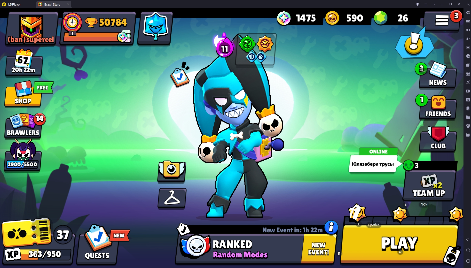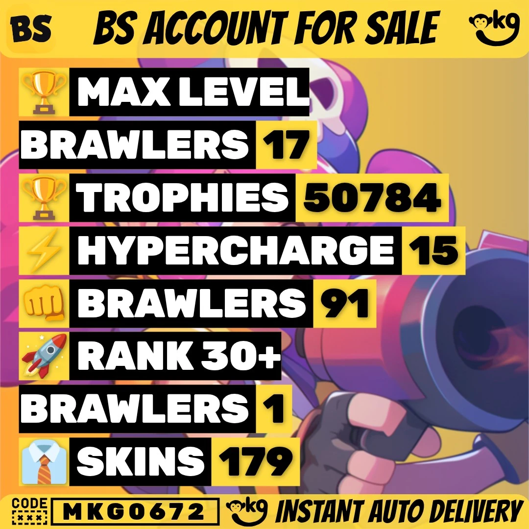 179 SKINS 💯 50.784 TROPHIES 🏆 91 BRAWLERS 🐼 15 HYPERCHARGED 🩸 17 MAX BRAWLERS 💛 DARK LORD SPIKE 🧡 !MKG0672