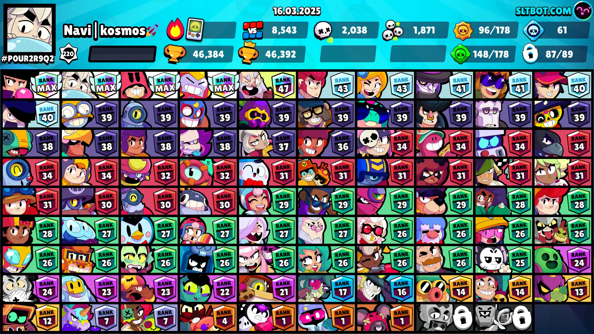 132 SKINS 🩵 46.384 TROPHIES 🏆 87 BRAWLERS 🧸 6 HYPERCHARGED 🩸 16 MAX BRAWLERS 🩷 CHAINSAW BUSTER 🩵 INSPECTOR COLETTE 🩵 MAGMA MANDY 🩵 GUARD RICO 🩵INSPECTOR COLETTE 🩵 RACEQUIT TARA 🎀