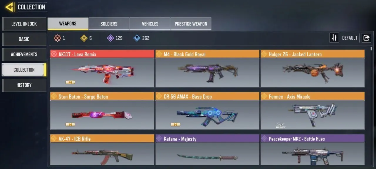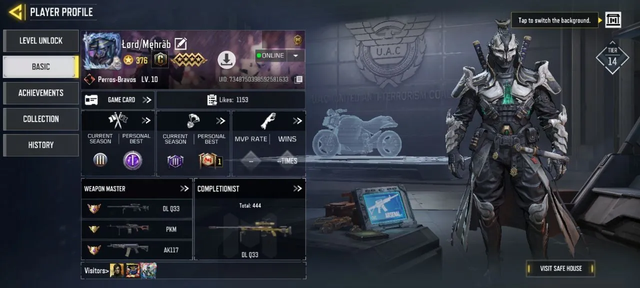 iOS Android 🛍️ Level 376 💯 Rank Master 🏆 129 Epic 🔫 6 Legendery ✅ 1 Mytich 💧 44 Epic Soldier 🔥 Code498
