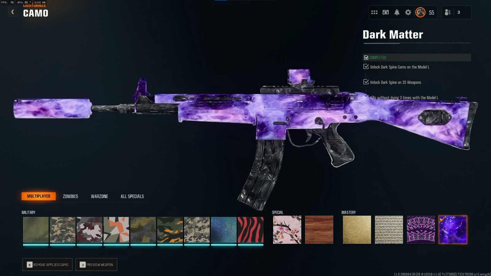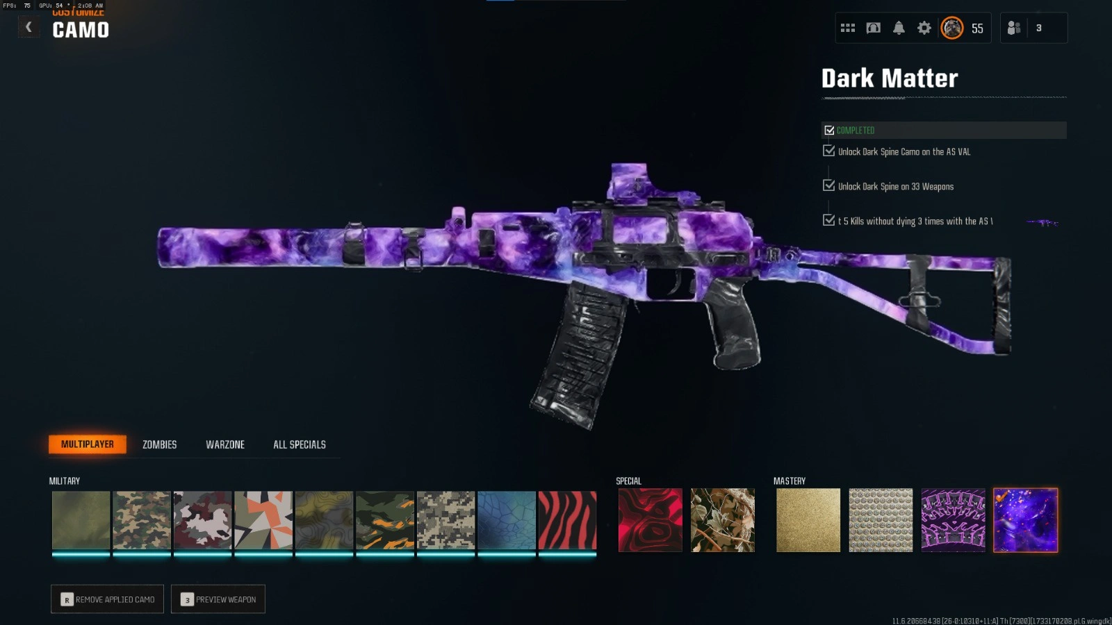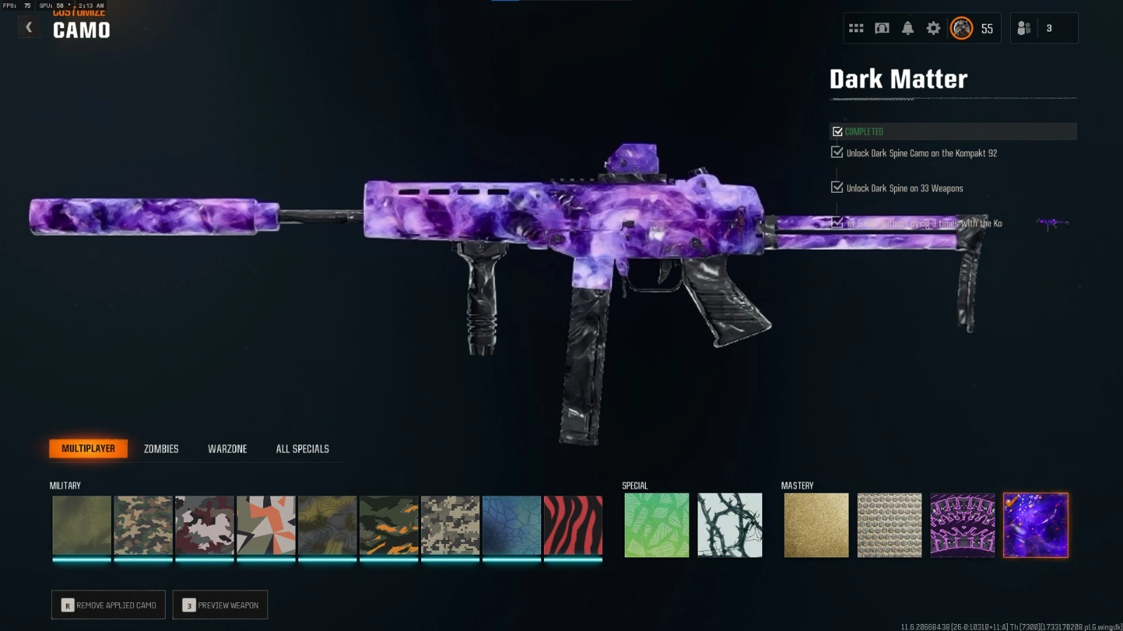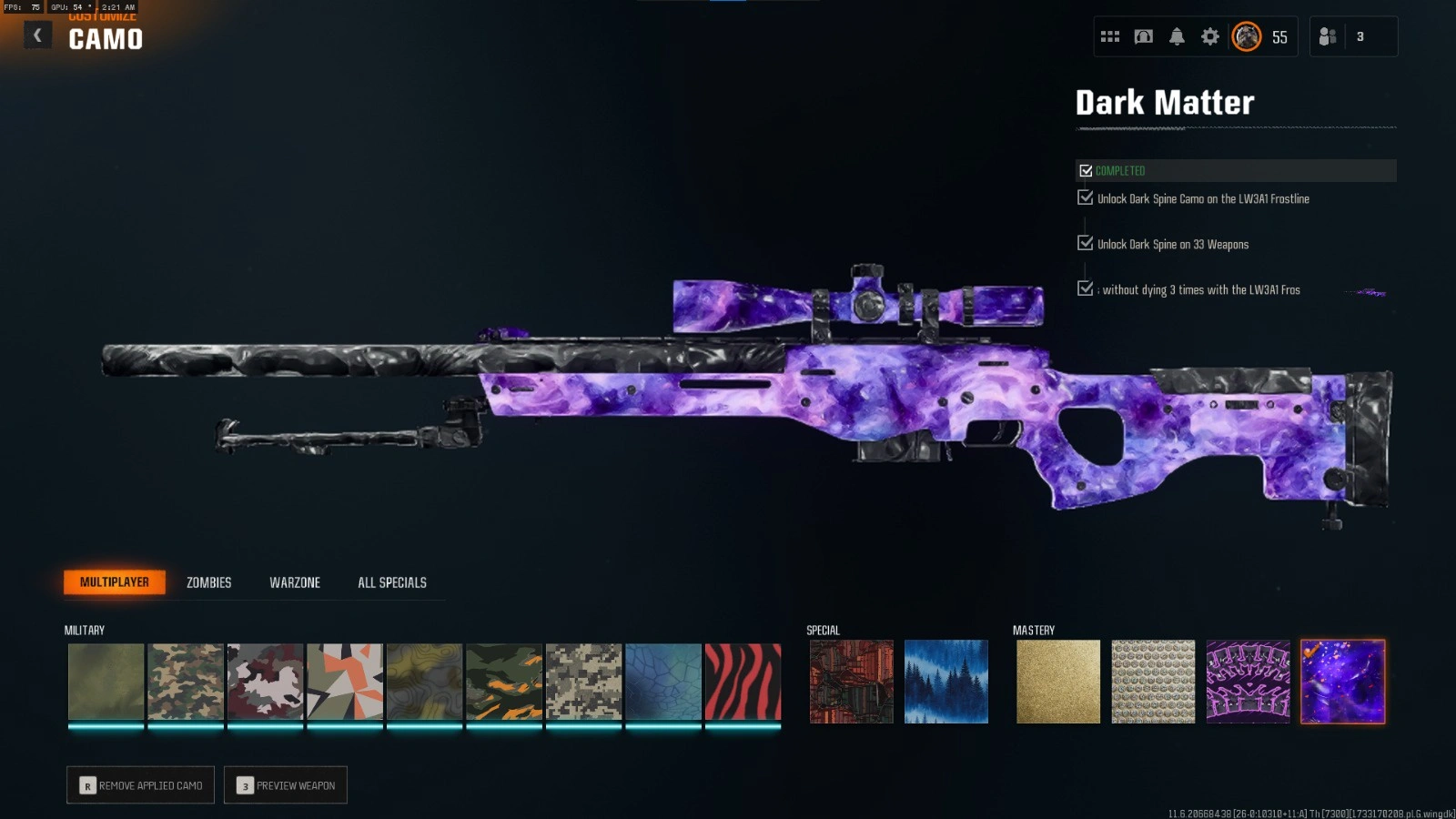 BO6 33 guns Dark Matter 🦮 Level 55 Prestige 1 🪞 Diamond 🧃 Dark Spine 🐻 Gold 🎍 All-platform support 🥁 Instant Delivery 🥬 HandLevelled