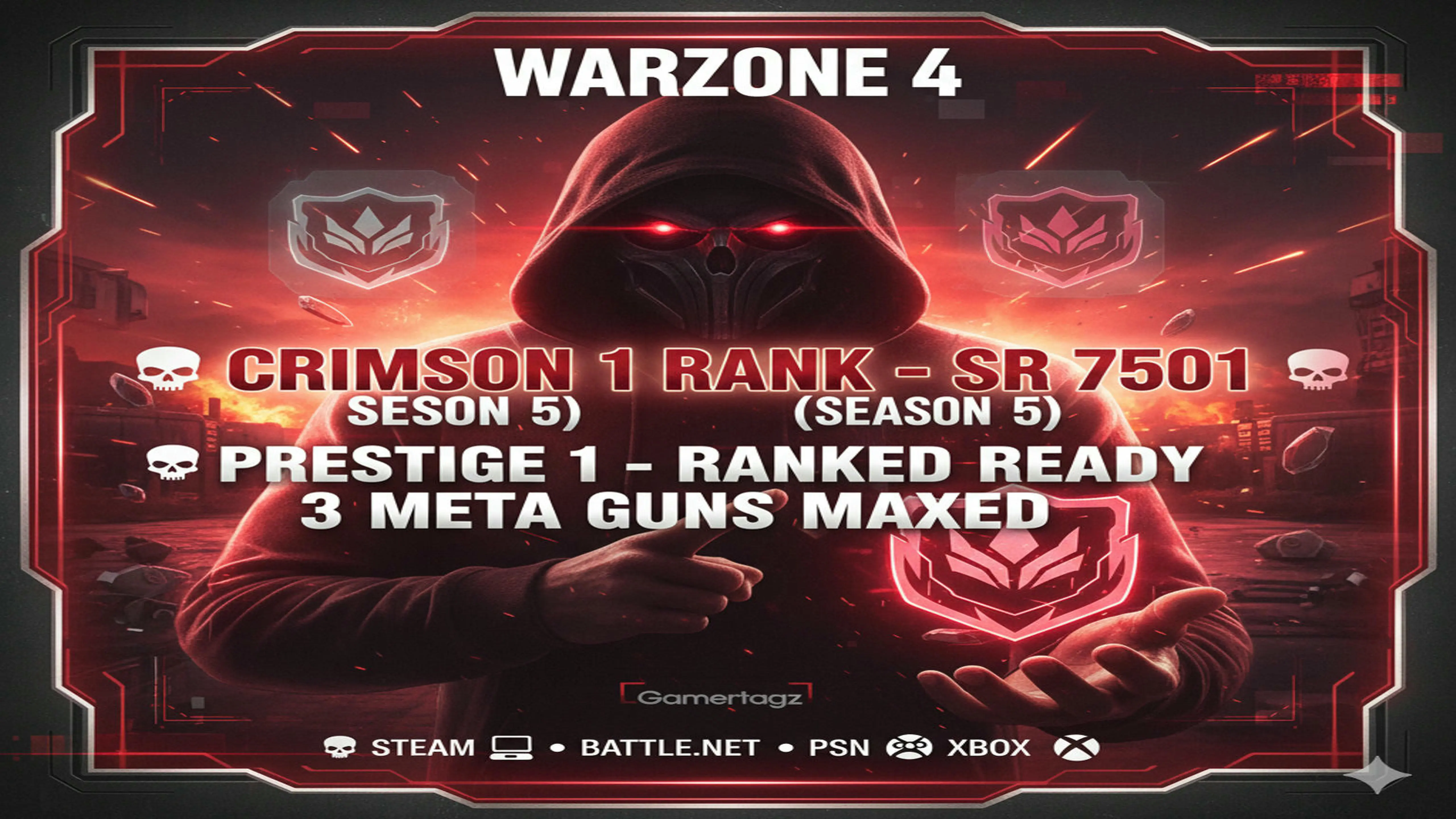 ⭕ Warzone 4 ⭕ Crimson 1 Rank SR 7501 ( Season 5 ) ⭕ 3 Meta Guns Maxed ⭕ Prestige 1 Level 49 ⭕ Ranked Operators and Camo ⭕ Full Access ⭕ Handmade ⭕ Ranked Ready ⭕ Linkable: Steam 💻 • Battle.net 🖥 • PSN 🎮 • Xbox 🟢 #GXX8Yh