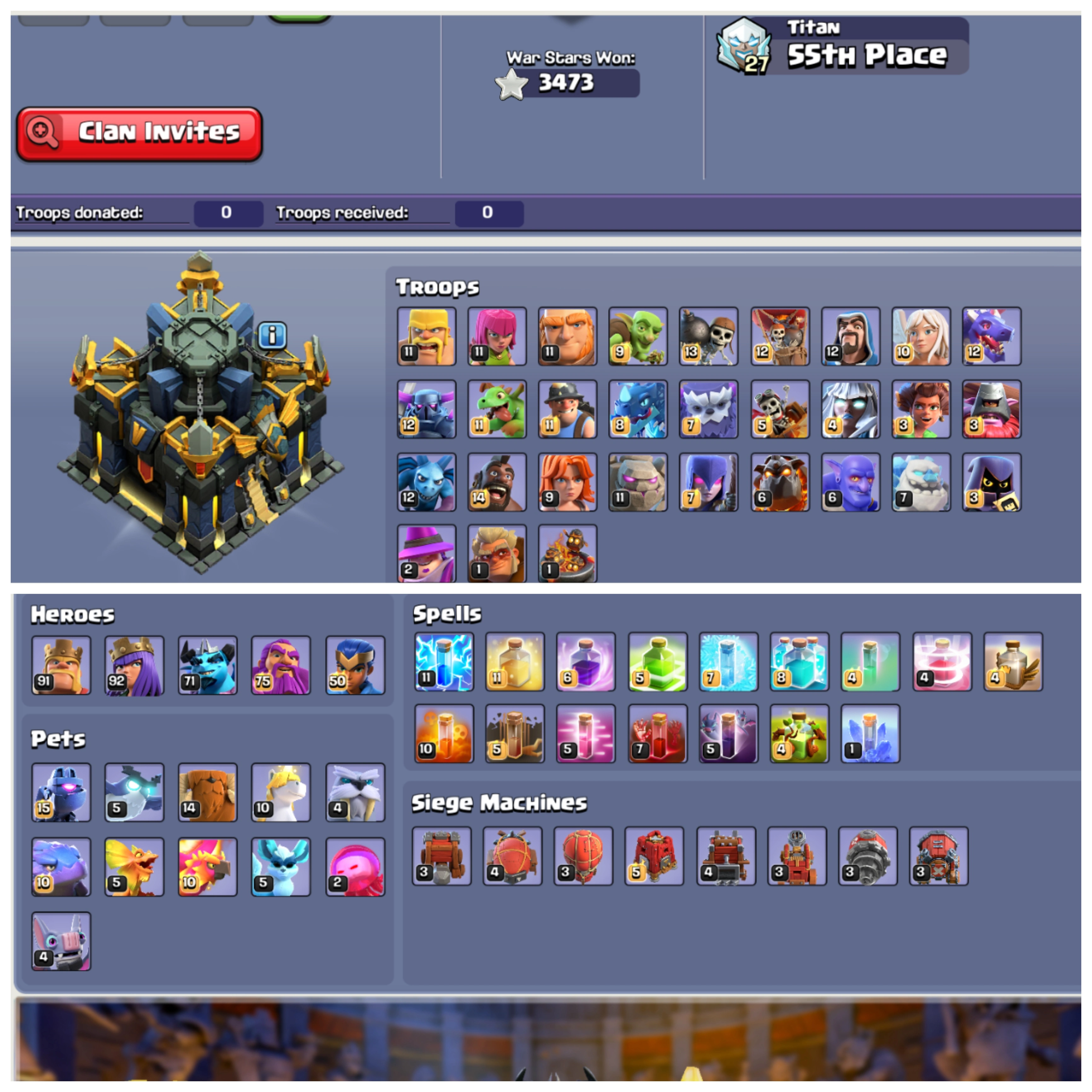 ⚡ 2 Heroes Max 💥 TH 17 Almost Max Laboratory 💎 XP 233 ⚔️ 11 Epic Equipments 🧾 Free Name Change 🎖️ 140 CWL Medals 🎒 Stacked Items 🚀 Instant Delivery