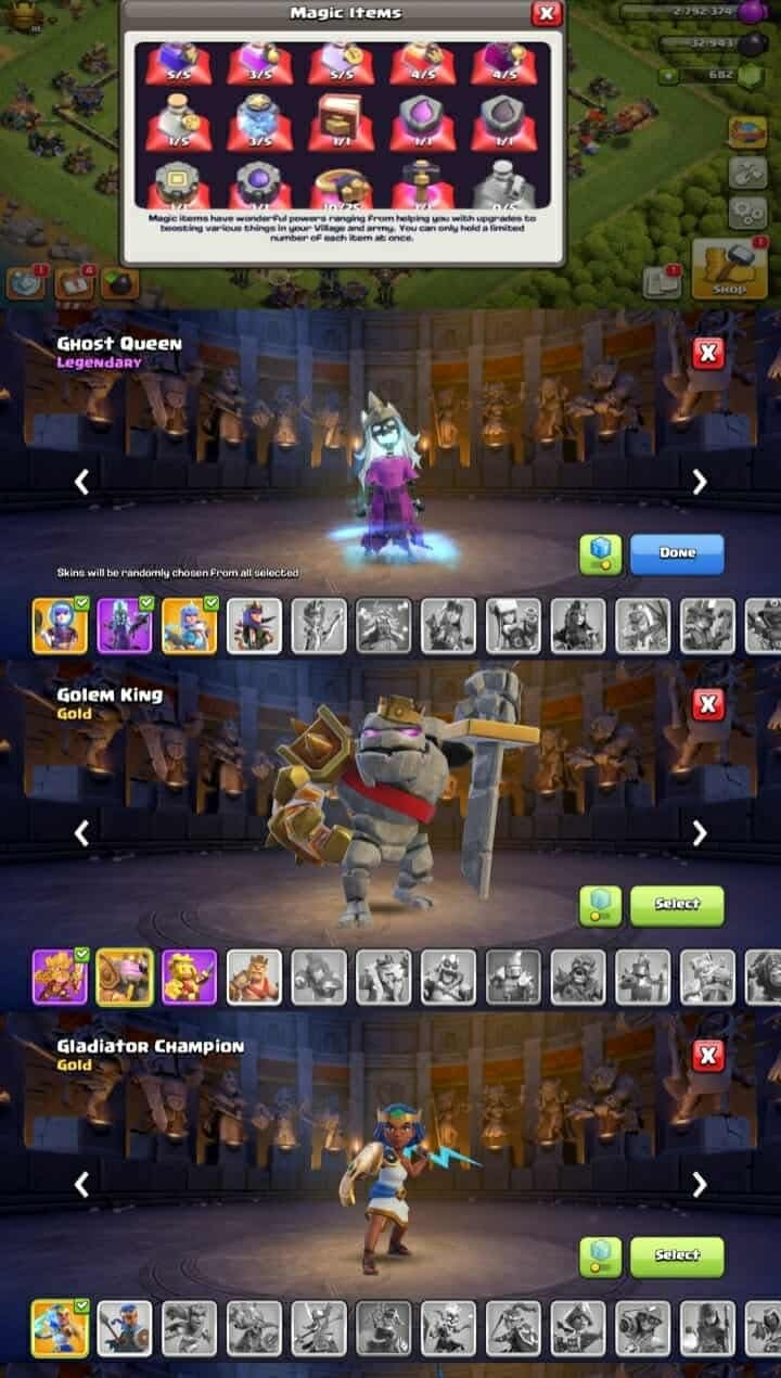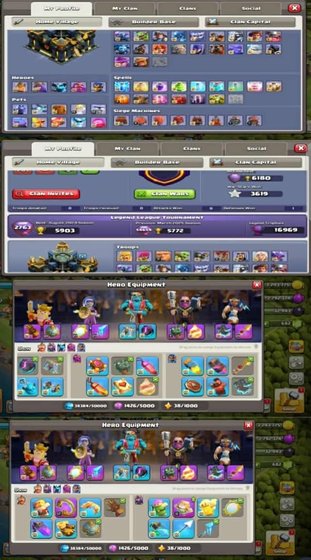 4 HERO MAX➠ MAX WALL➠ 24 EQUIPMENT MAX➠ 10x EPIC➠ 16K+ LEGEND TROPHY➠ XP-244➠ TH17 MAX ID➠ 9 SKIN➠ NIGHT BASE MAX➠ BUYER MAIL➠HEROS 100-100-75-50 ➠ LOTS OF MAGIC ITEMS