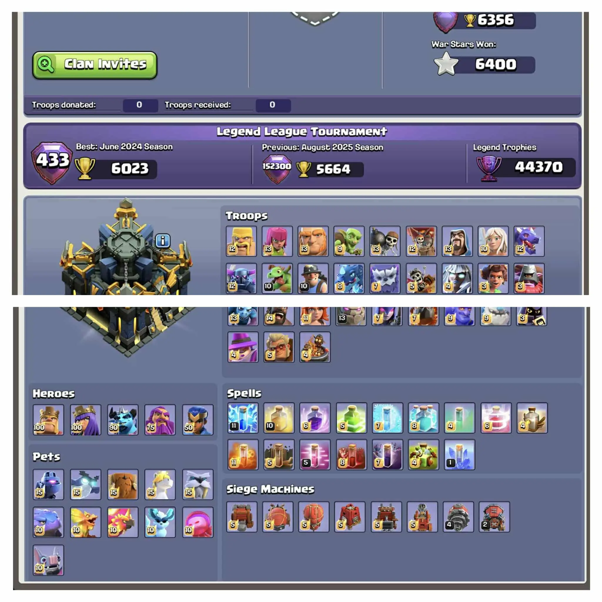 Level 279🌹TH 17 Max🌹Rare 6.4k WarStars🌹Rank 433🌹7 Epic Equipments Maxed🌹Heroes/Pets/Walls/defense Max
