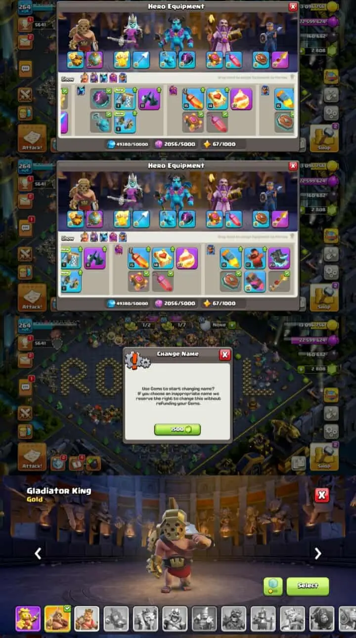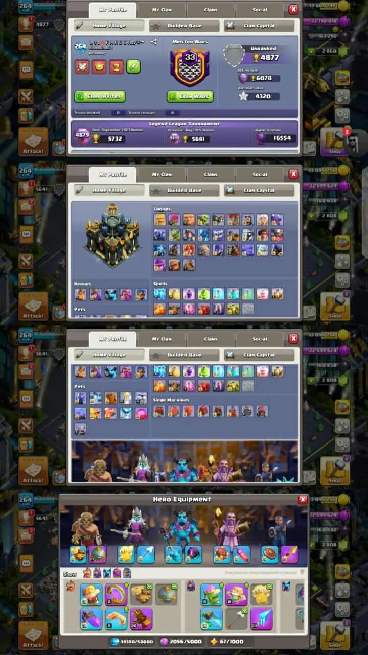 MAX STACKED ID➠ HERO MAX➠ WALL MAX➠ 6K+ HIT➠ 16K+ LEGEND TROPHY➠ 15 EQUIPMENT MAX➠ RARE 11x EPIC➠ TH17 MAX ID➠ XP-264➠ EGYPT SCENERY➠ 4 SKIN➠HEROS 100-100-75-50 ➠ BASE MAX➠ LOTS OF MAGIC ITEM