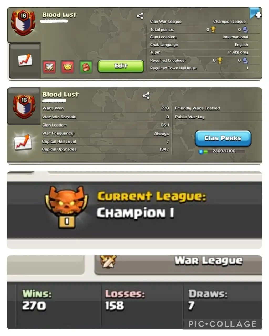 🔥CHAMPION 1 LEAGUE CLAN💀💥NAME- Blood Lust | 💥LVL- 16 |☠️ WARLOG W-L-D: 270-158-7 | CWL LEAGUE : CHAMPION 1🏆 ☠️| CC: ALMOST 8 !!⚡⚡