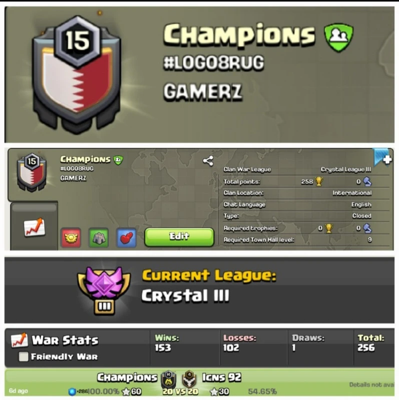 Champions !! LEVEL 15 !! WIN 153 LOSS 102 !! CRYSTAL 3 !! PERFECT NAME !! GOOD WAR LOG !! AFFORDABLE !! INSTANT DELIVERY