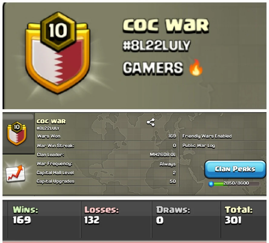 coc war !! LEVEL 10 !! WIN 169 LOSS 132 !! POSITIVE WAR LOG !! GOOD NAME !! AFFORDABLE !! INSTANT DELIVERY