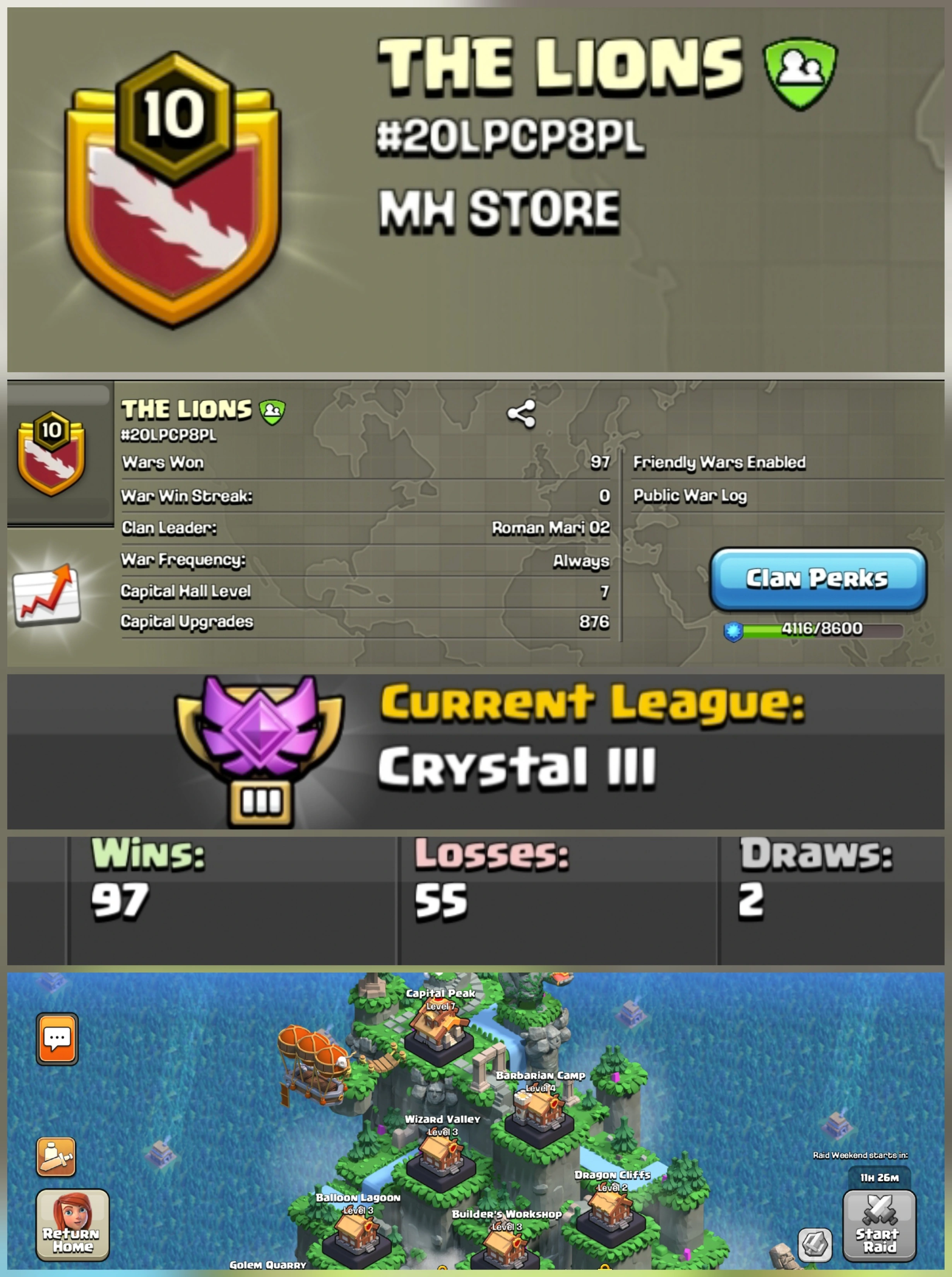 CLAN CASTLE !! LEVEL 10.7 !! CRYSTAL 3 !! WIN 86 LOSS 128 !! PERFECT NAME !! AFFORDABLE !! FAST DELIVERY