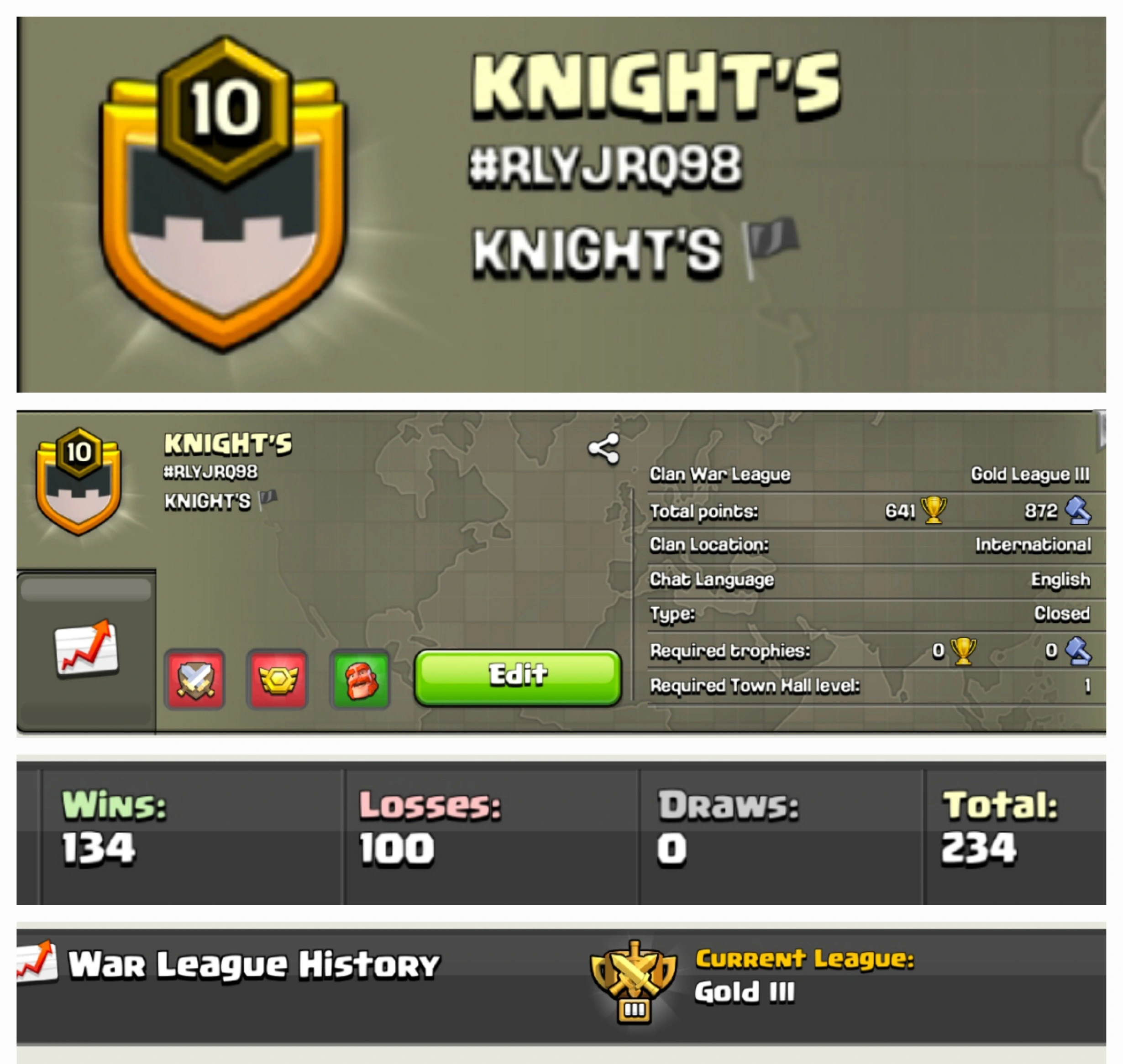 KNIGHT'S !! LEVEL 10 !! WIN 134 LOSS 100 !! POSITIVE WAR LOG !! GOLD LEAUGE 3 !! PERFECT NAME !! AFFORDABLE !! INSTANT DELIVERY
