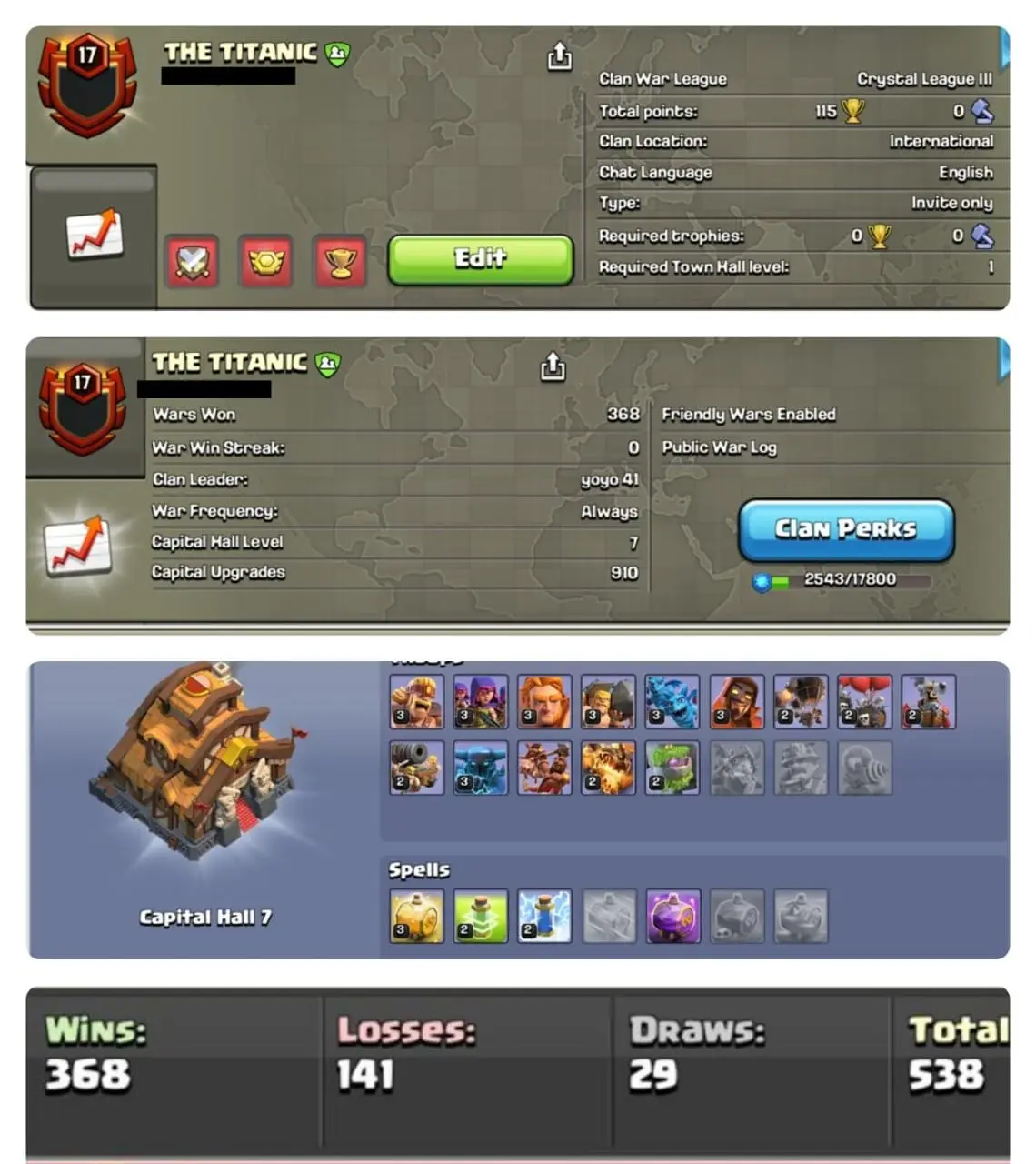 🔥NAME- THE TITANIC | LVL 17🥵| 💥WARLOG W/L/D:368/142/29 | CWL League: CRYSTAL 3🏆| CC: 7 !!💥