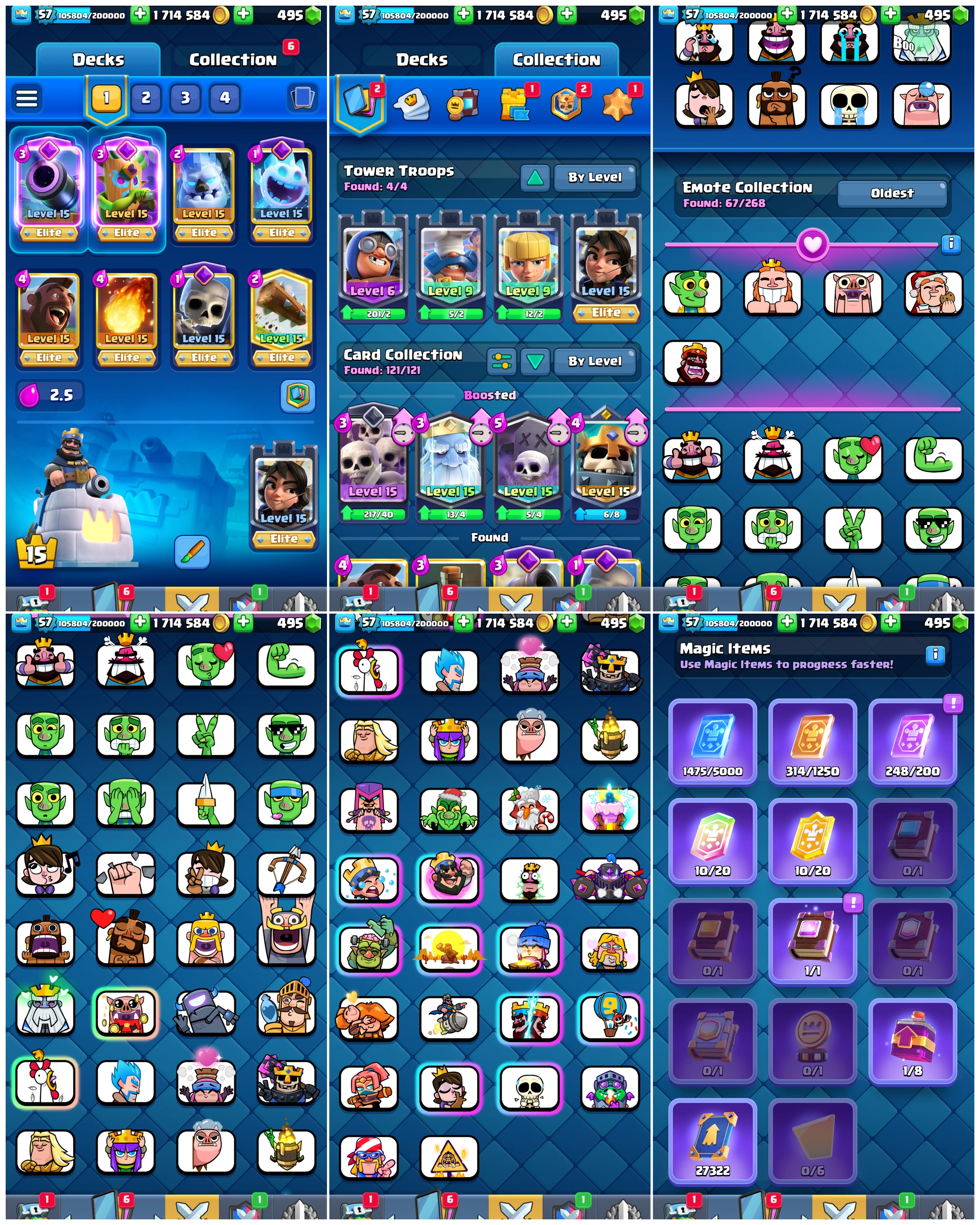 14K+ Trophies 🎯 8 Year Fully Maxed | Level 57🔥 | King Tower 15 👑 | Arena 24 ⚔️ | Emote 67 😎 Cards 121 🔥 Instant Delivery ✅ Lifetime Access ✅ | #P679