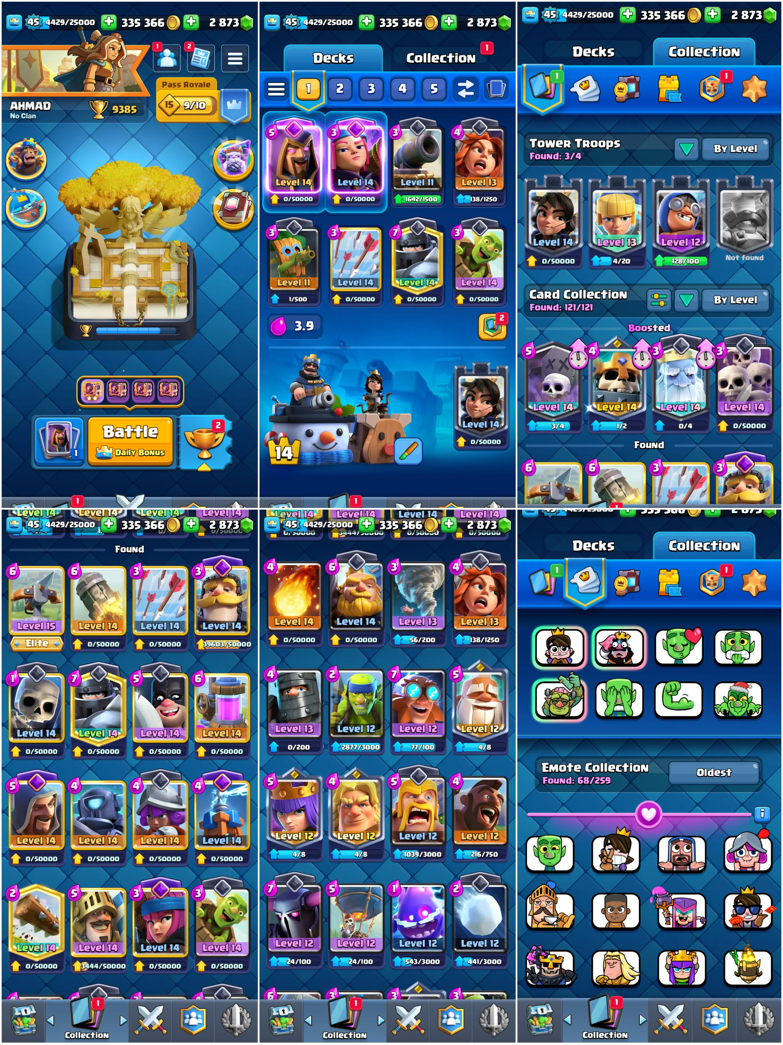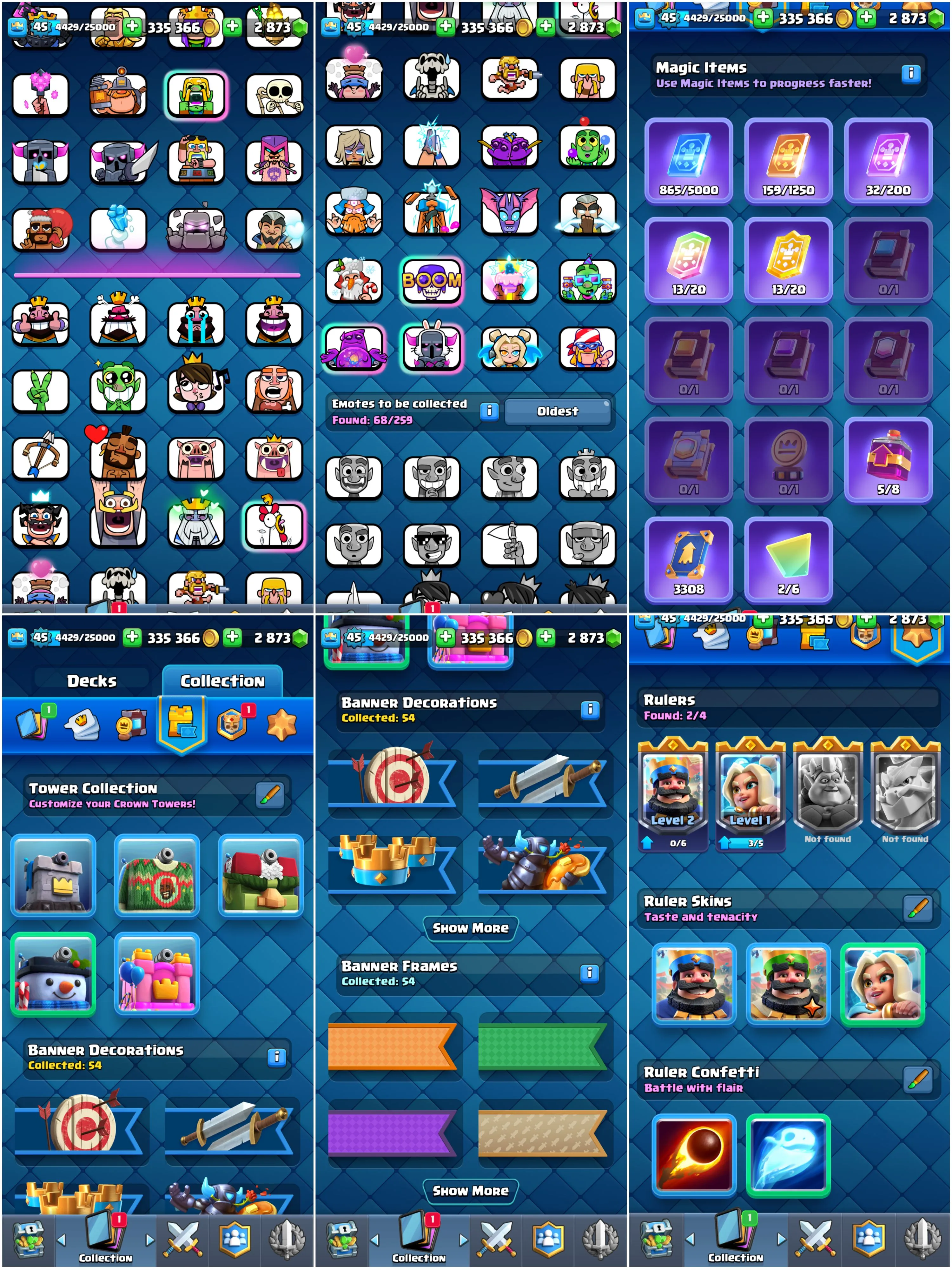 {2800+ Gems} Level 45 + KT 14 🐯 9300+ Trophies 🍇 4 Years Badge 🐸 19 Max Cards 🍉 1 Elite 🎯 5 Evos 🐻 68 Emotes 🎯 5 Tower Skins 🧊 Instant Delivery