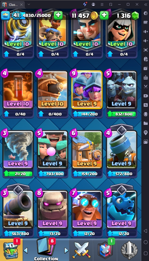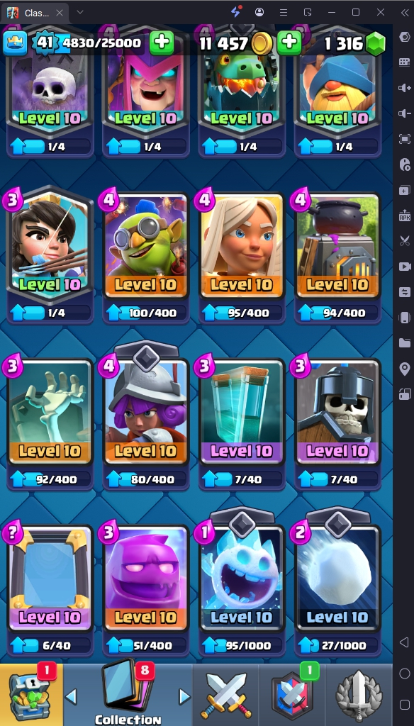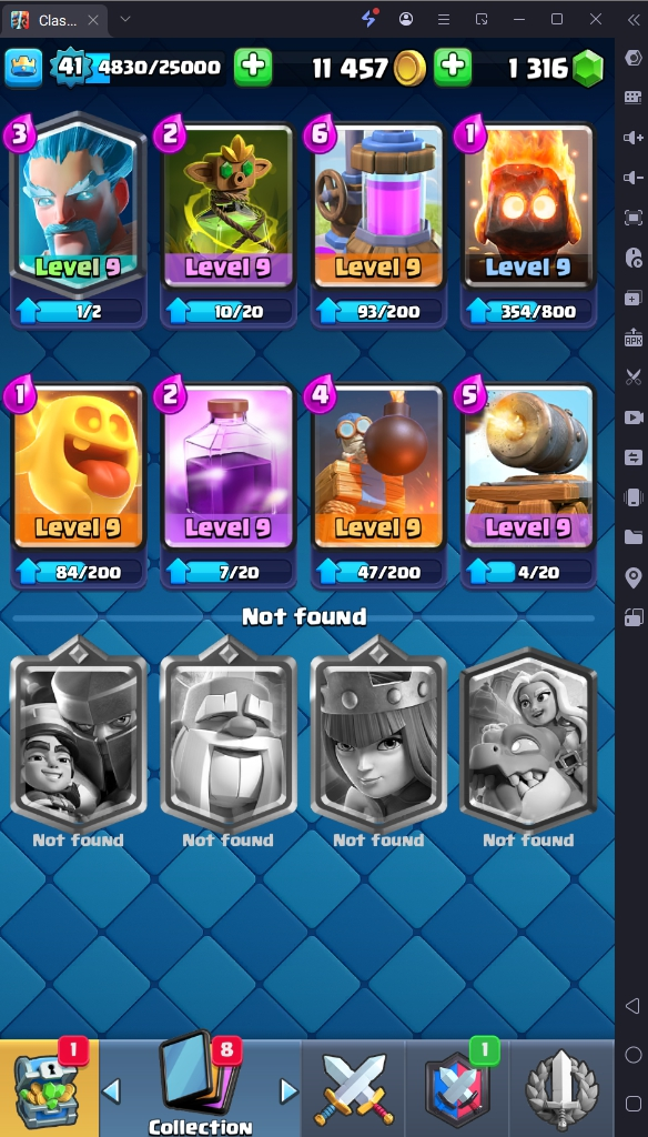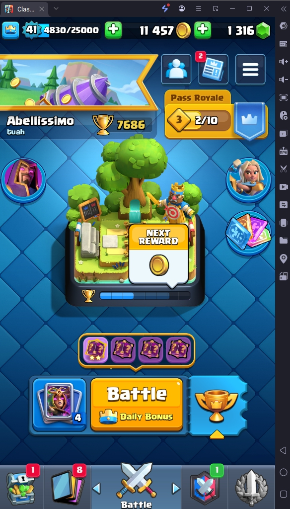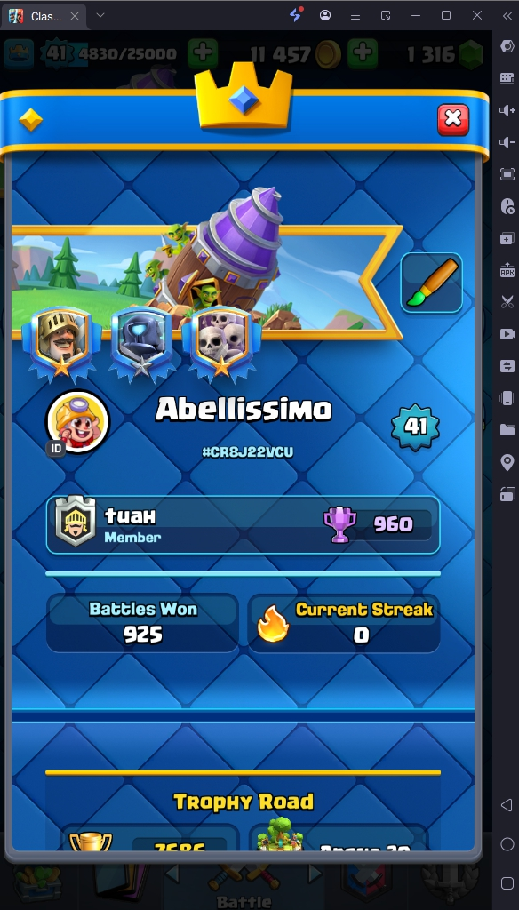 7686 TROPHY 🏆 41 LVL 💯 KT 13 👑 116 CARDS ♦️ 3 MAX CARDS 👑 1 ELITE CARDS 🔮 8 EVO 💯 EMOTE 24 🎭 #CR8J22VCU ⸱ TAG ACCOUNT ♥️