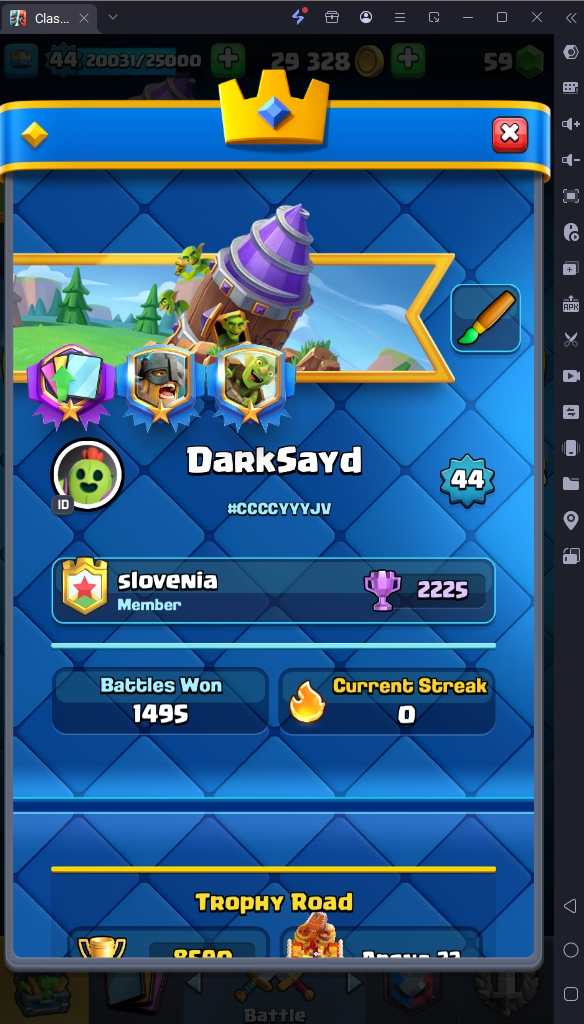 8590 TROPHY 🏆 44 LVL 💯 KT 14 👑 118 CARDS ♦️ 3 MAX CARDS 👑 2 ELITE CARDS 🔮 6 EVO 💯 EMOTE 43 🎭 #CCCCYYYJV ⸱ TAG ACCOUNT ♥️