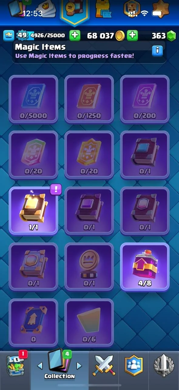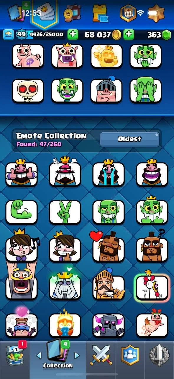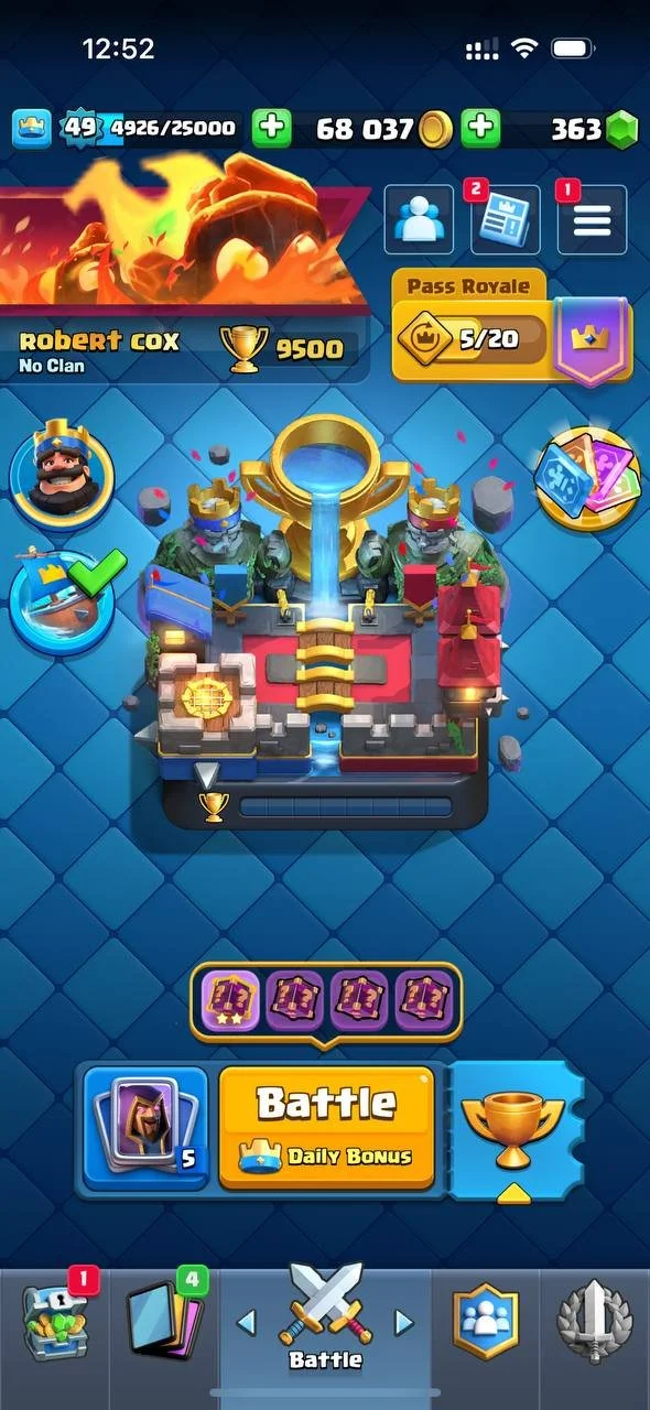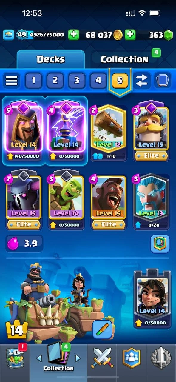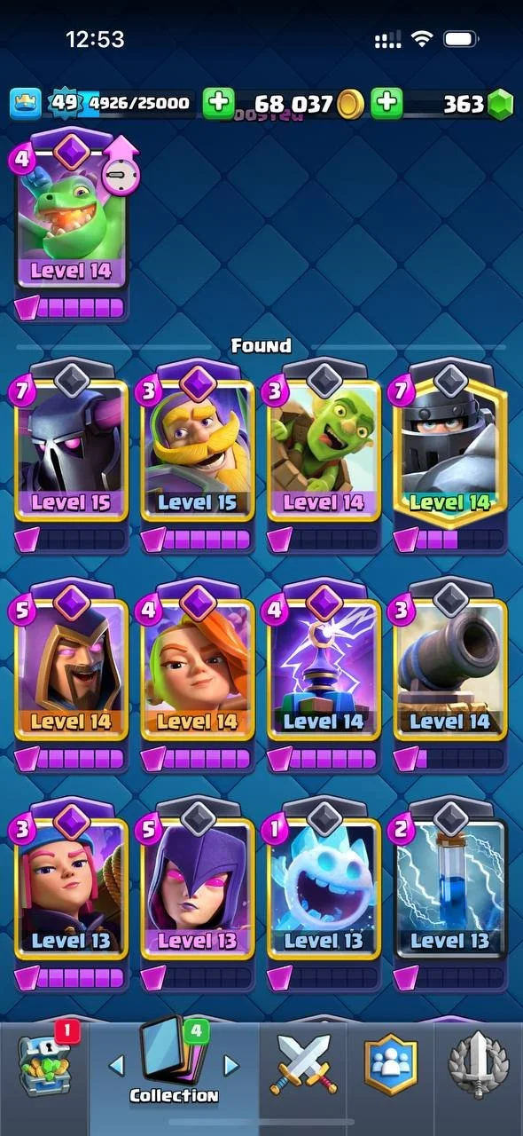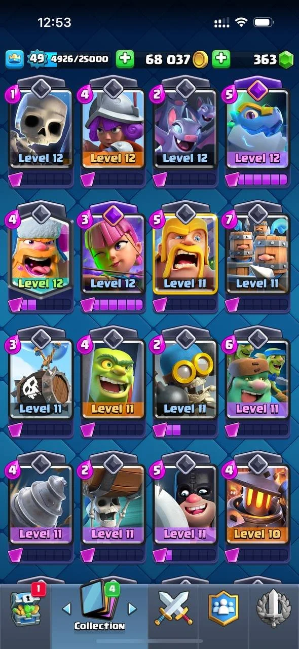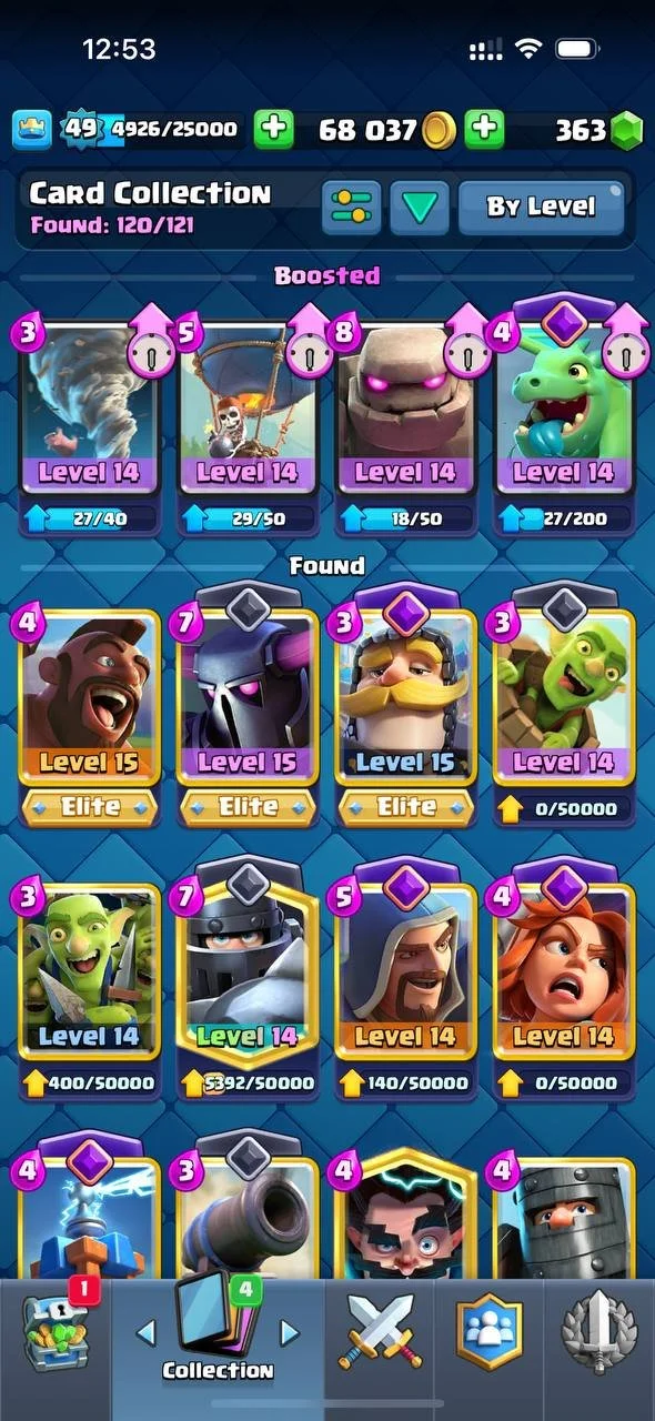 9.5k , lvl 49, deck with pekka, bp bought, 3 lvl 15 + 10 lvl 14, 8 evo, 47 emoji,