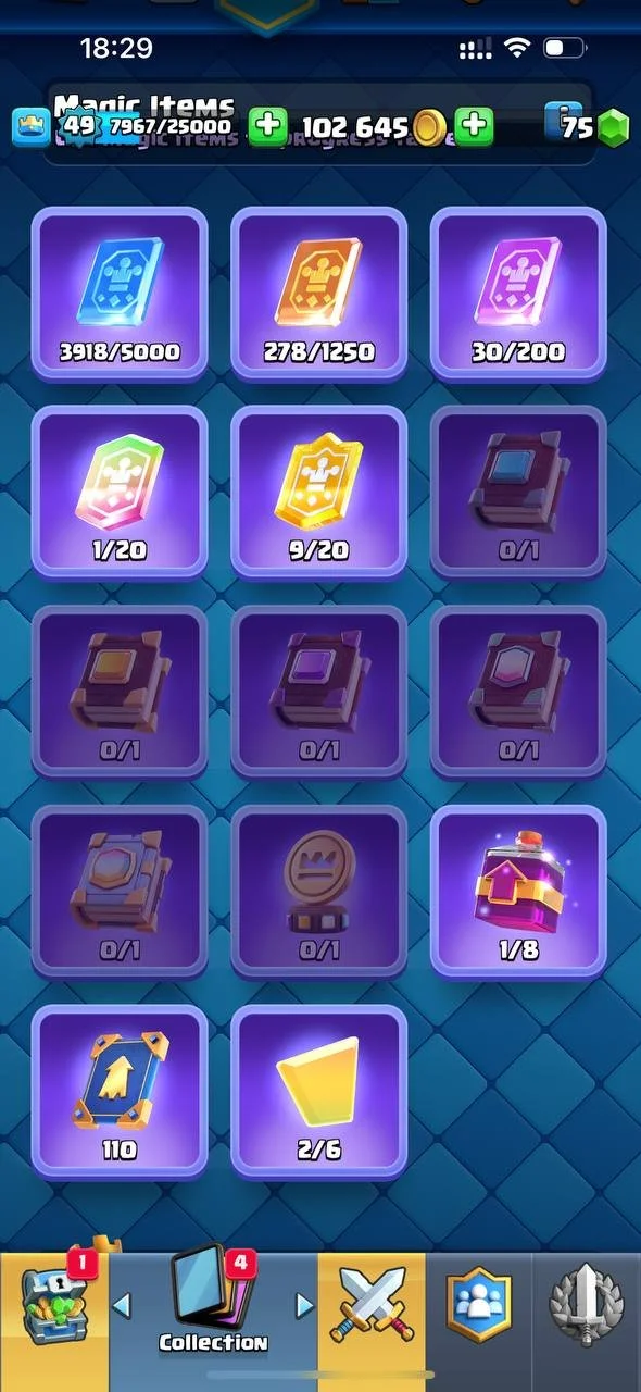 9.7k , lvl 49, 3 lvl 15 cards, deck with mortar, 8 evolutions, 48 emoji,