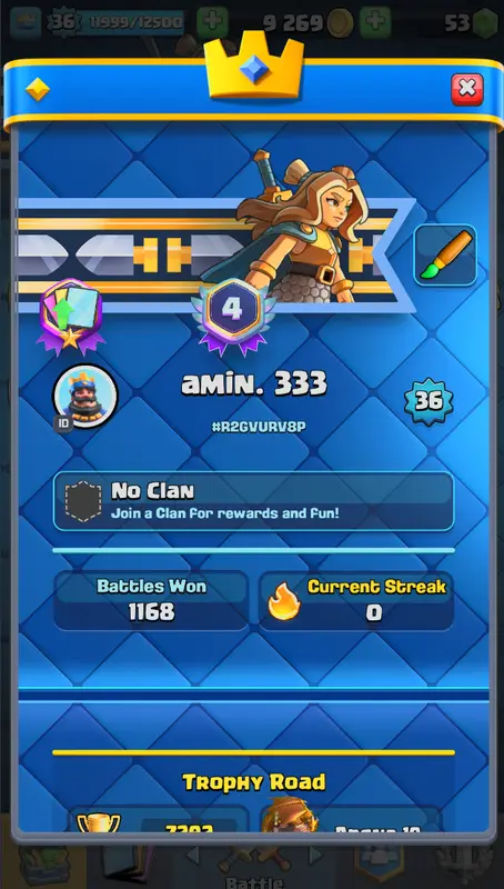 CL6211 KT 12 LEVEL 37 | 6 Evolution | Trophies:7292 | 115 Cards | 1 Cards (14LVL) | 2 Tower Skins | 21 Emotes | 9K Gold | 53 Gems | IOS/ANDROID