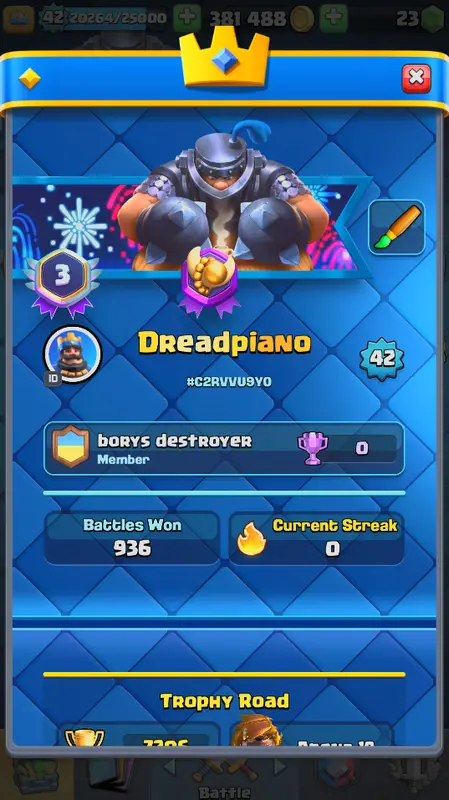 CL6823 KT14 ⸱ Level 42 ⸱ 1 Cards lvl 15 ⸱ 13 EVO ⸱ 7206 Trophy ⸱ 59 Emotes ⸱ 6 Skin Tower ⸱ 23 Gems ⸱ 381k Gold