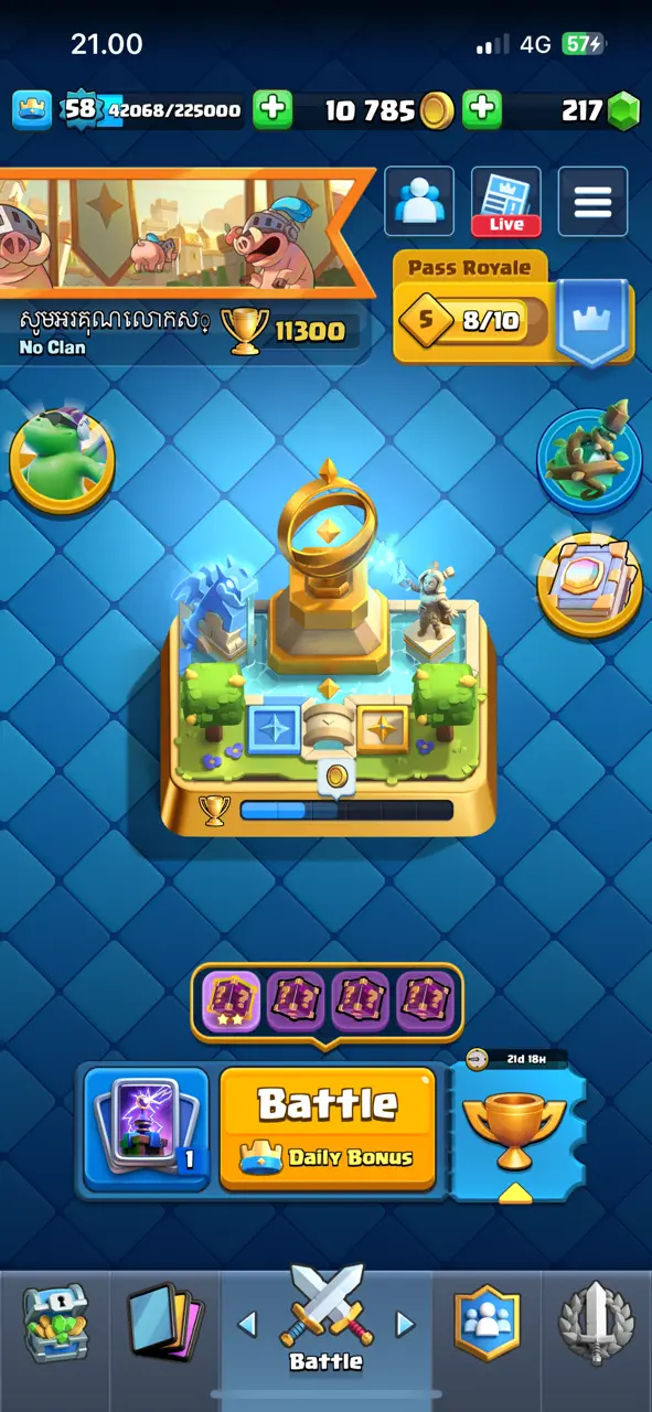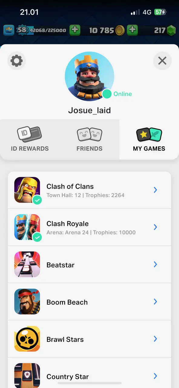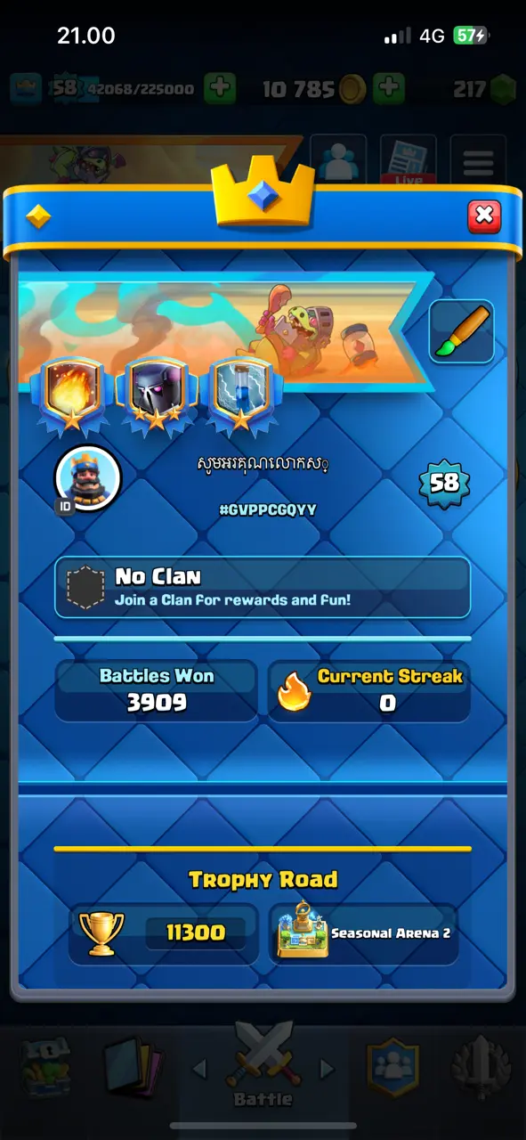 🔥 [Combo CR+COC] 🔥 CR Lv.58 🔥 Seasonal Arena 2 🔥 11300 Trophies 🔥 KT 15 🔥 11 Evo Card 🔥 42 Max Cards & 18 Elite🔥 60 Emotes 🔥 8 Tower Skins 🔥 Full Acces & Guaranteed 🔥 [F2320] 🔥
