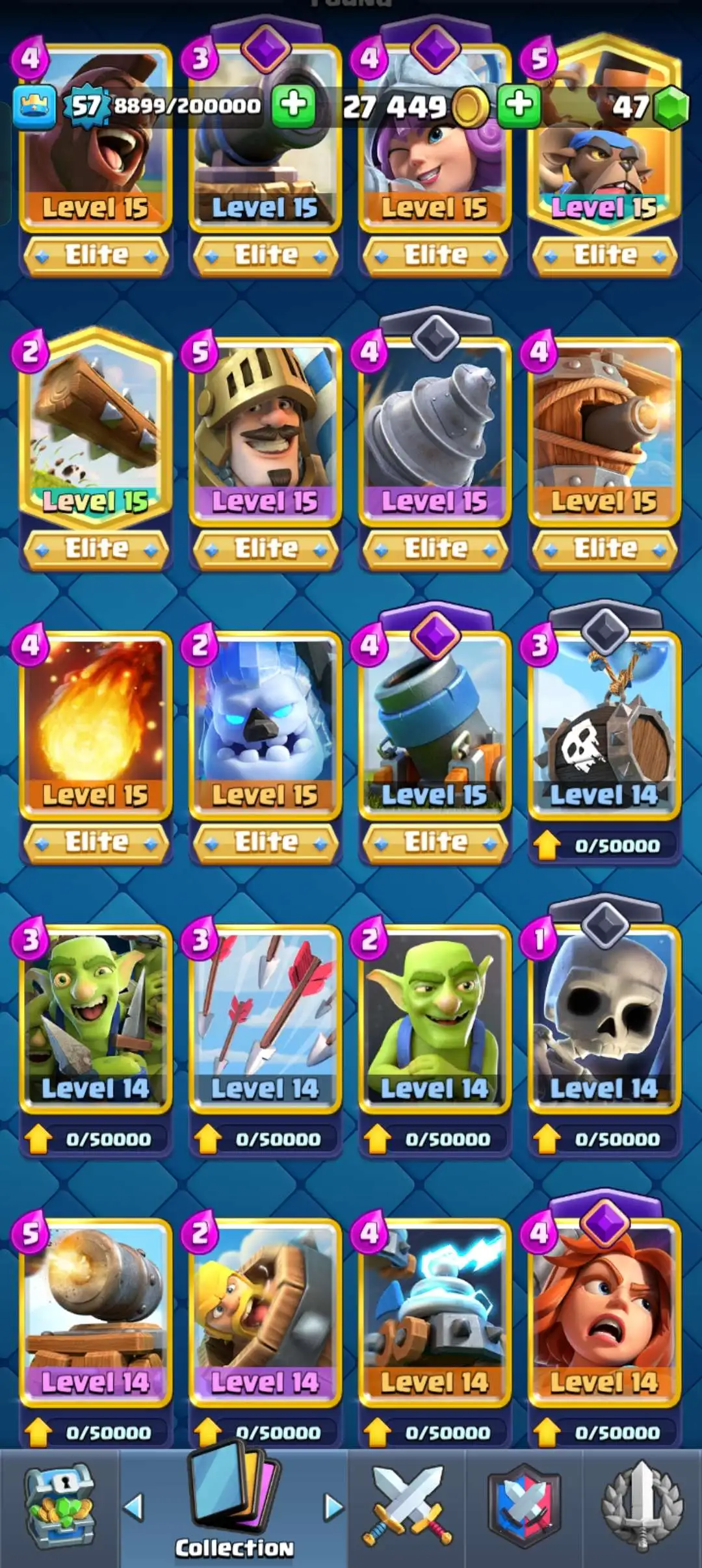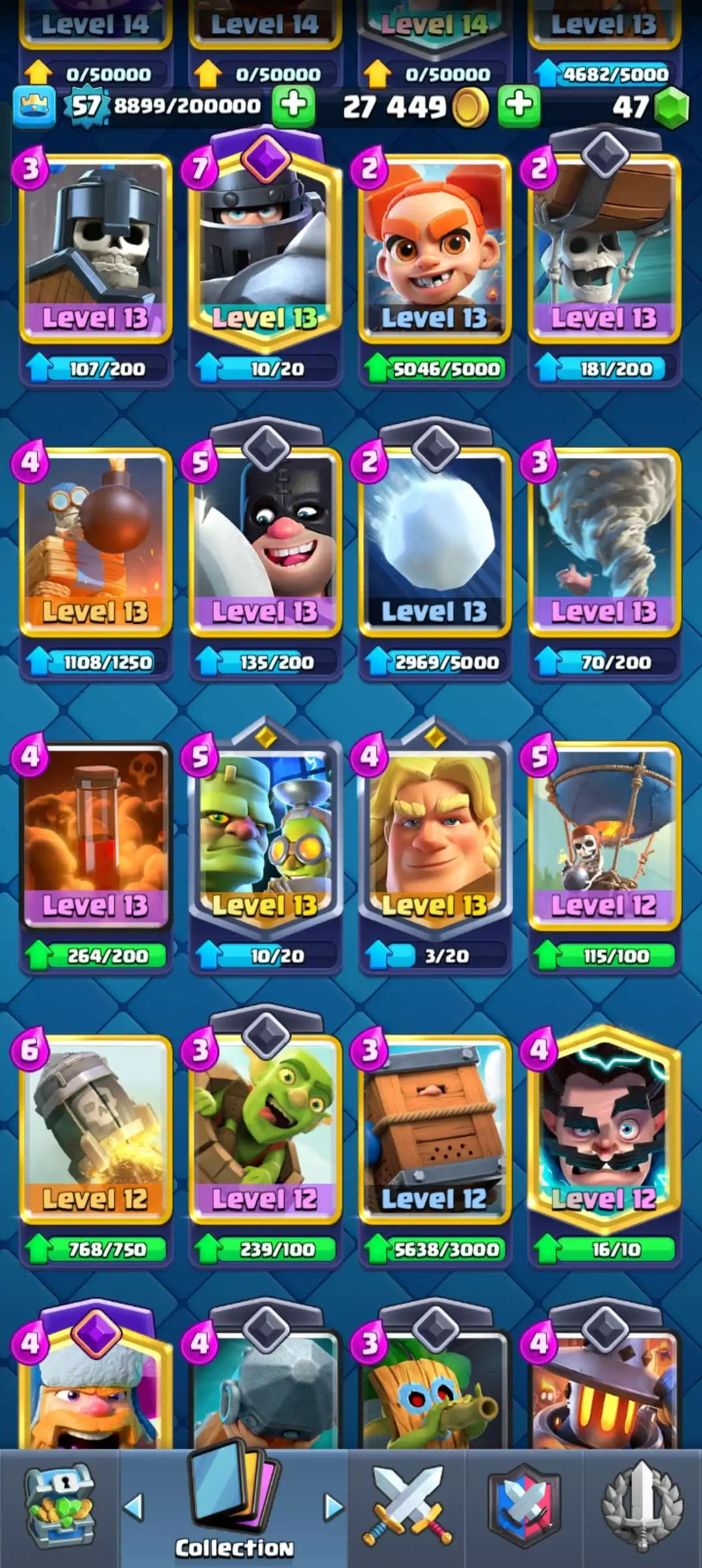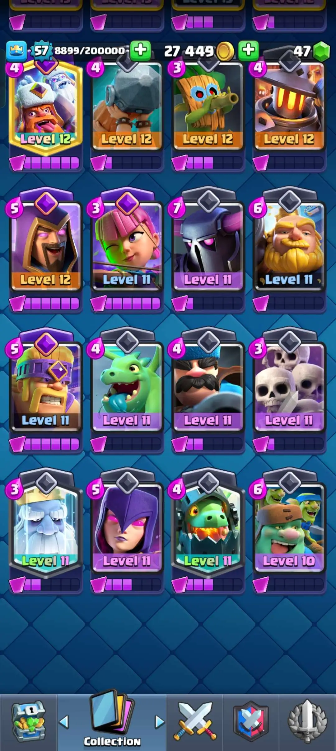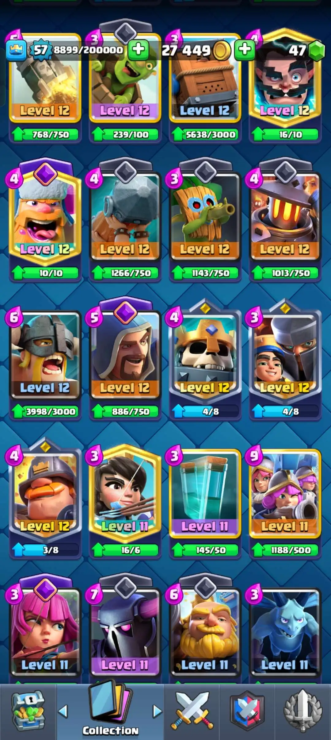 CR Lvl 57 ✨ 12150 Trophy ✨ 9 years badge ✨ KT 15 ✨ 13 Elite Cards ✨ 37 Max Cards ✨ 15 Evo Cards ✨ 85 Emotes ✨ 9 tower skins