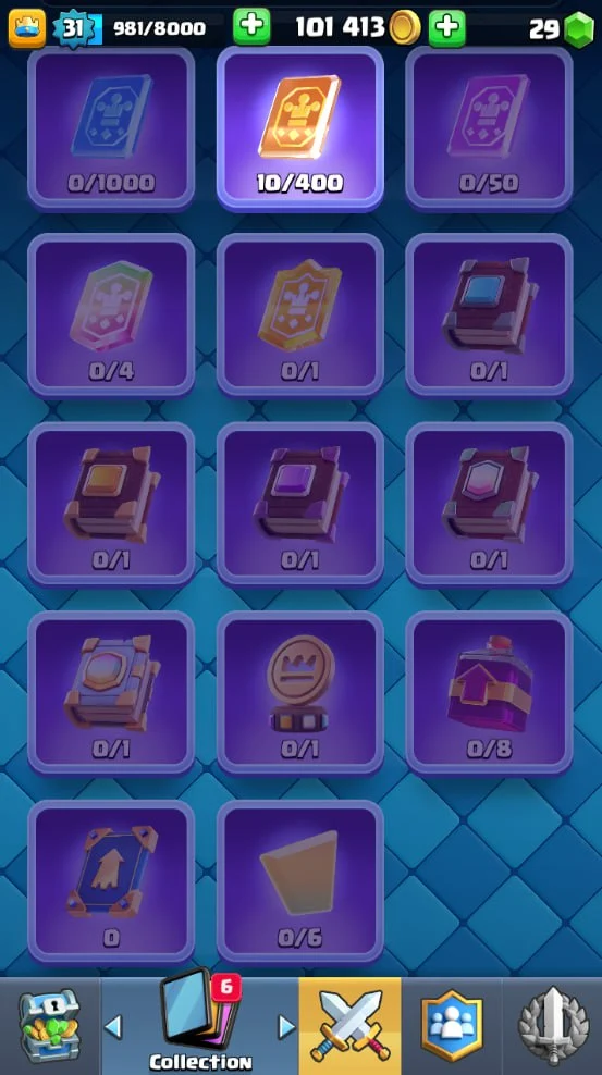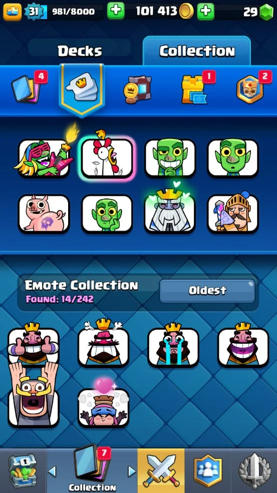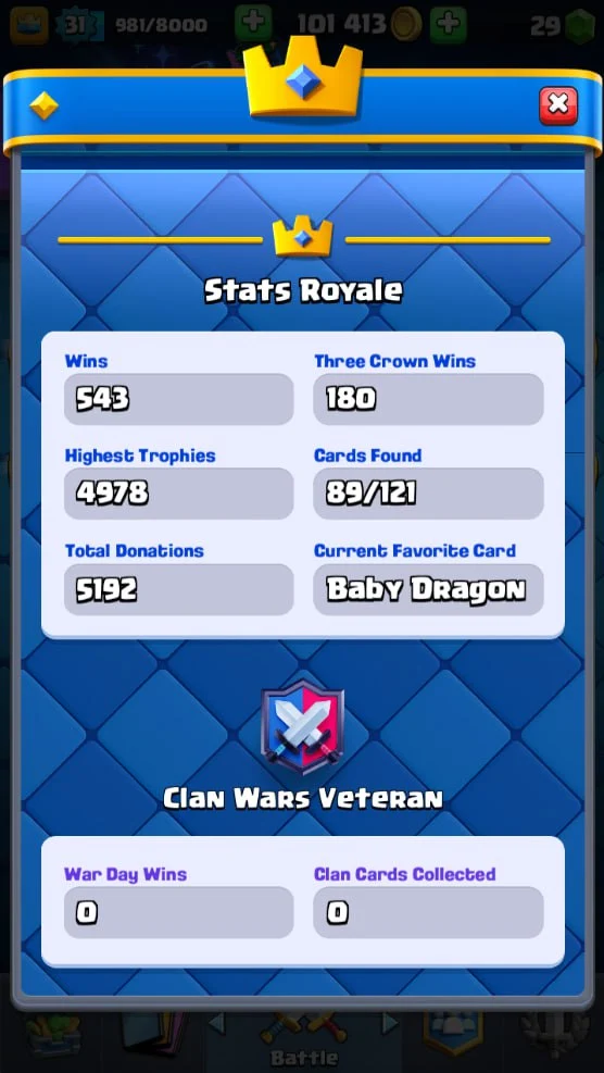 👑 KT 11 👑 4857 Trophy 👑 31 LVL 👑 89 Cards 👑 14 Emotes 👑 29 Gems 👑 101 k Gold 👑