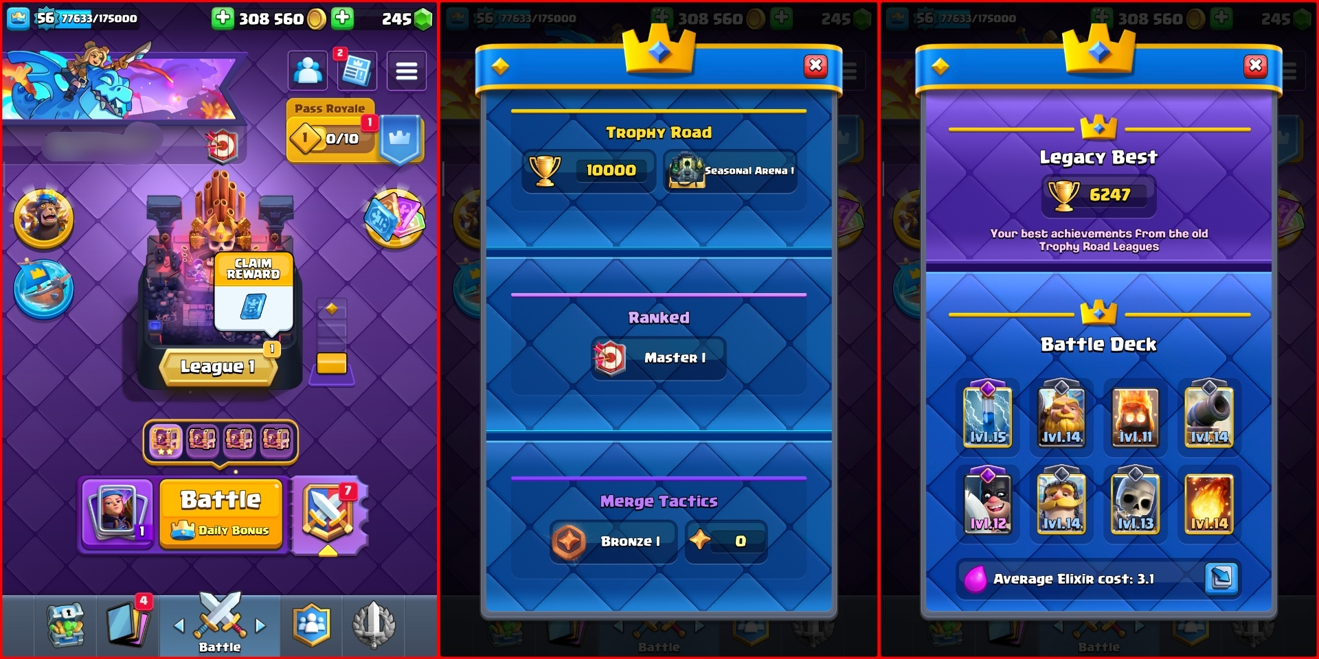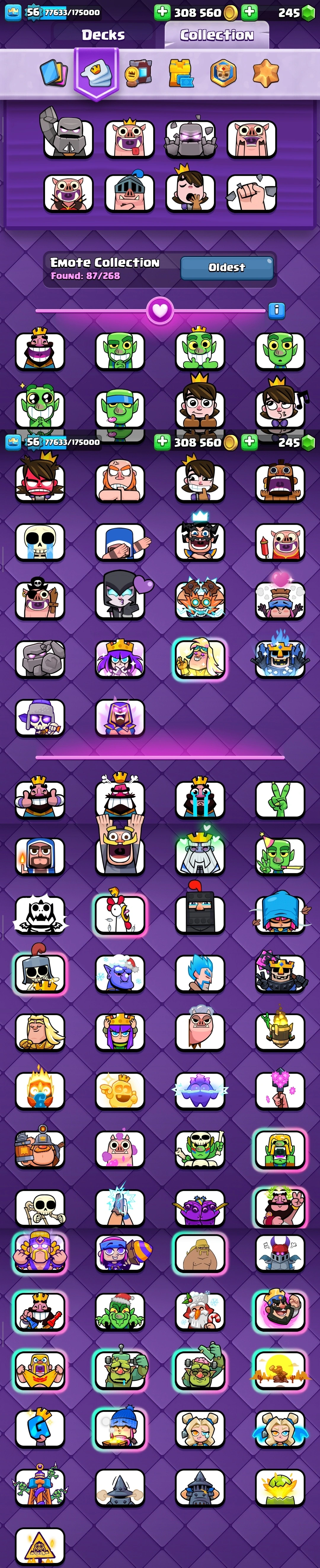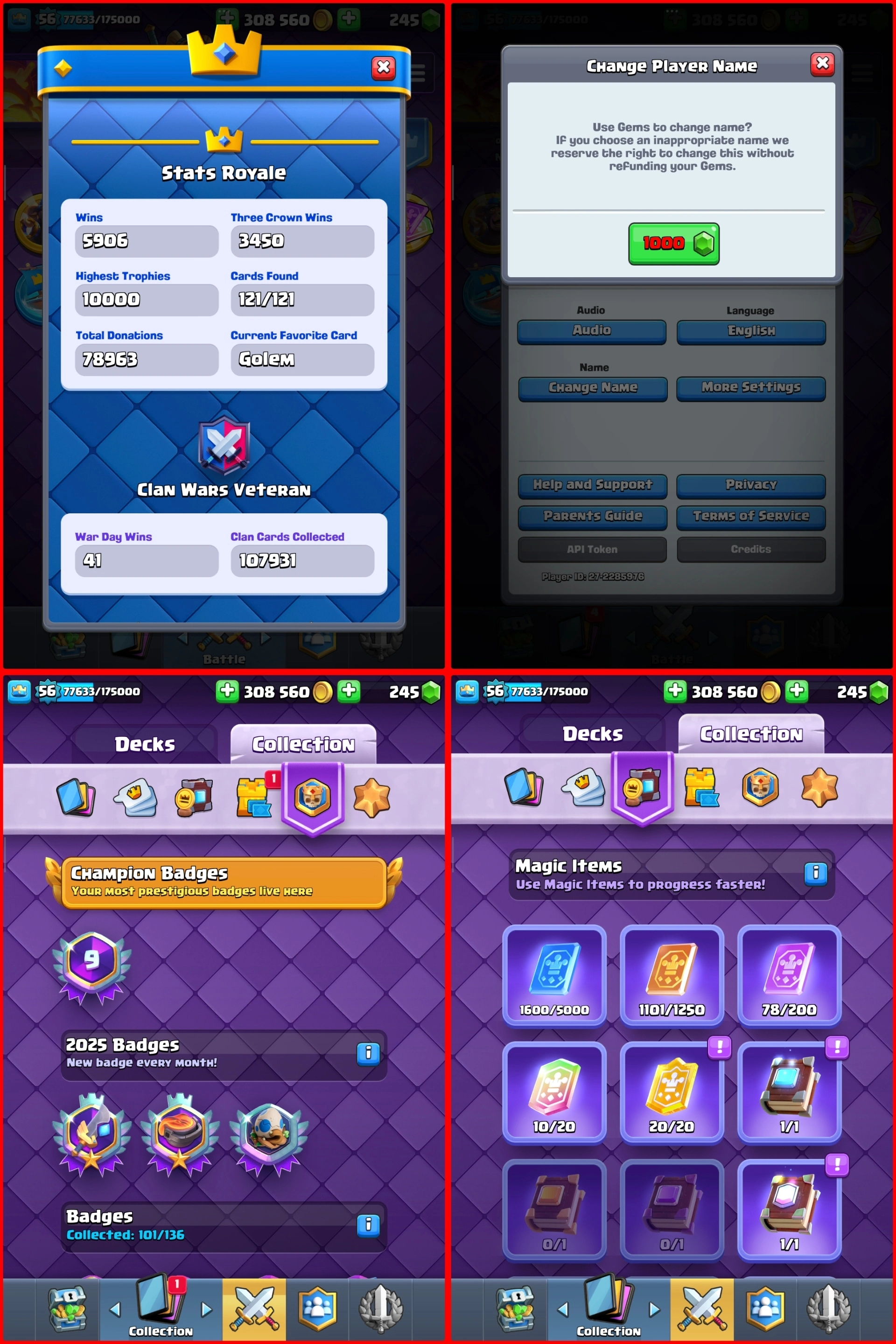 Level 56 ⸱ 121 ALL Cards | 10k Trophies, 9 Years Old ID | 9 Evos Unlock, 17 Cards Level 14 & 11 Level 15 | 6247 Legacy Rank, 87 Nice Emotes | RC12