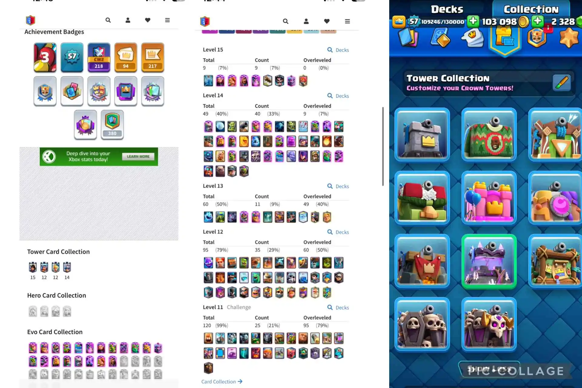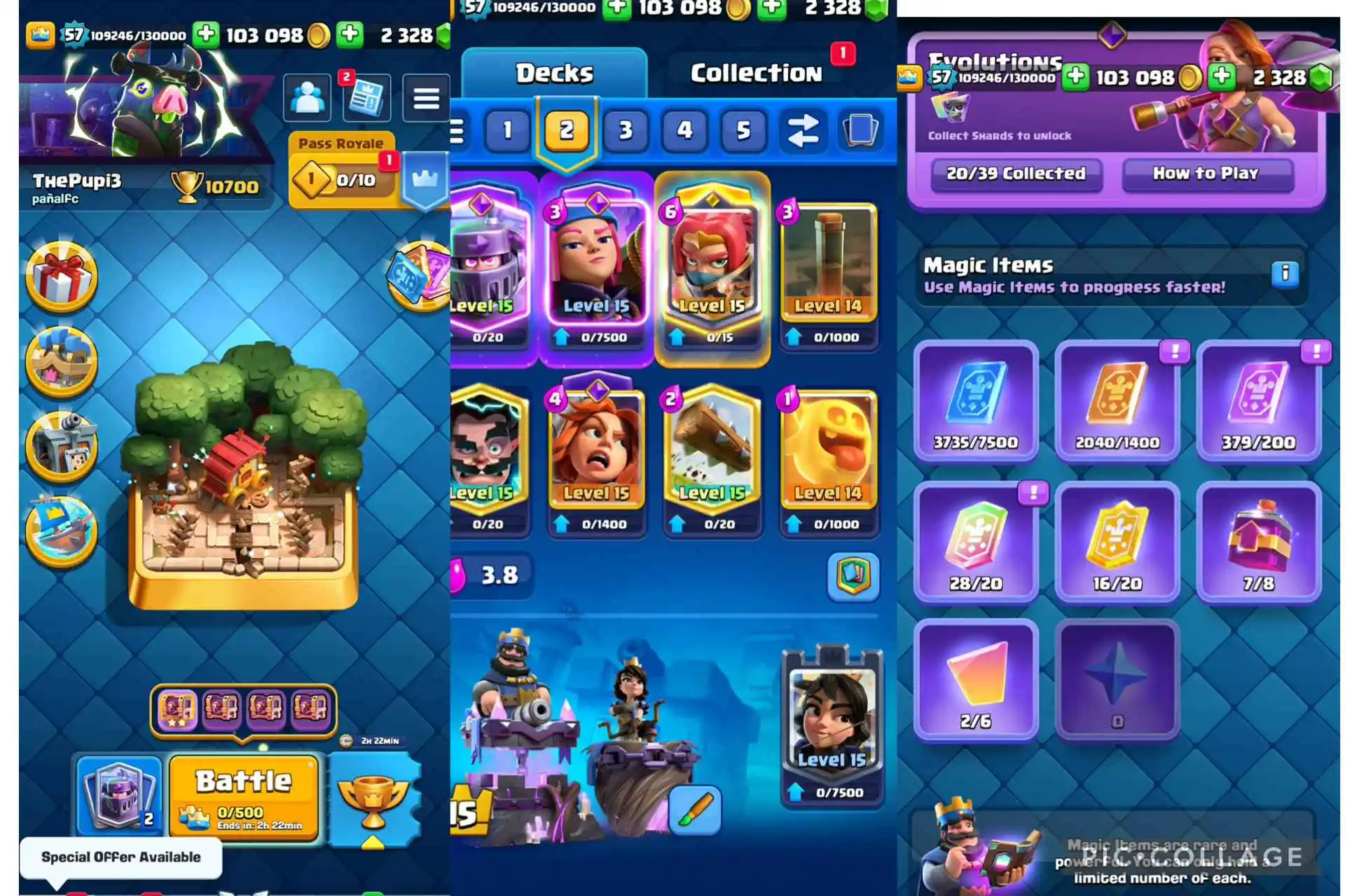 Level[57]-Exclusive Evolution[20]-Level15[9]-Level14[49]- unlocked card[120]-Kt15-Kt Skin[11x]-Cool Emote[94-Trophy[10700]