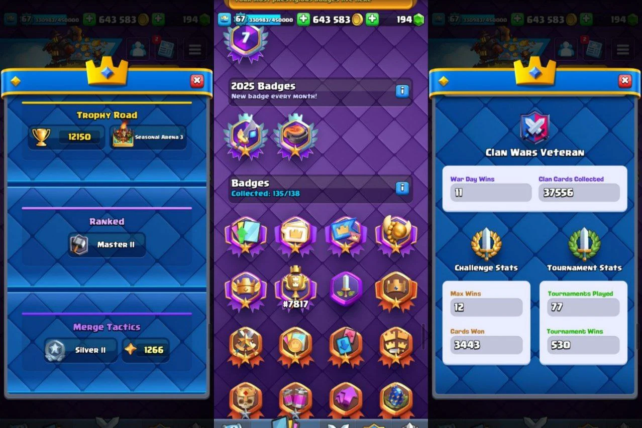 Ranked | KT 15 | Lvl67 | 72 Elite Cards | 119 Max Cards | 29 Evos | 251 Exclusive Emotes | 30 Tower Skins | Rare Banners | Ultimate Champion | Instant Delivery