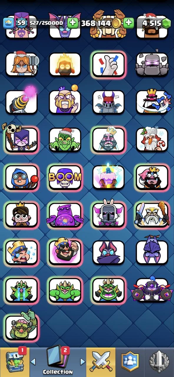 👑 RARE EMOTES 👑 KT 15 👑 7500 Trophy 👑 59 LVL 👑 117 Cards 👑 84 Max Cards 👑 15 Elite Cards 👑 89 Emotes 👑 8 Skins 👑