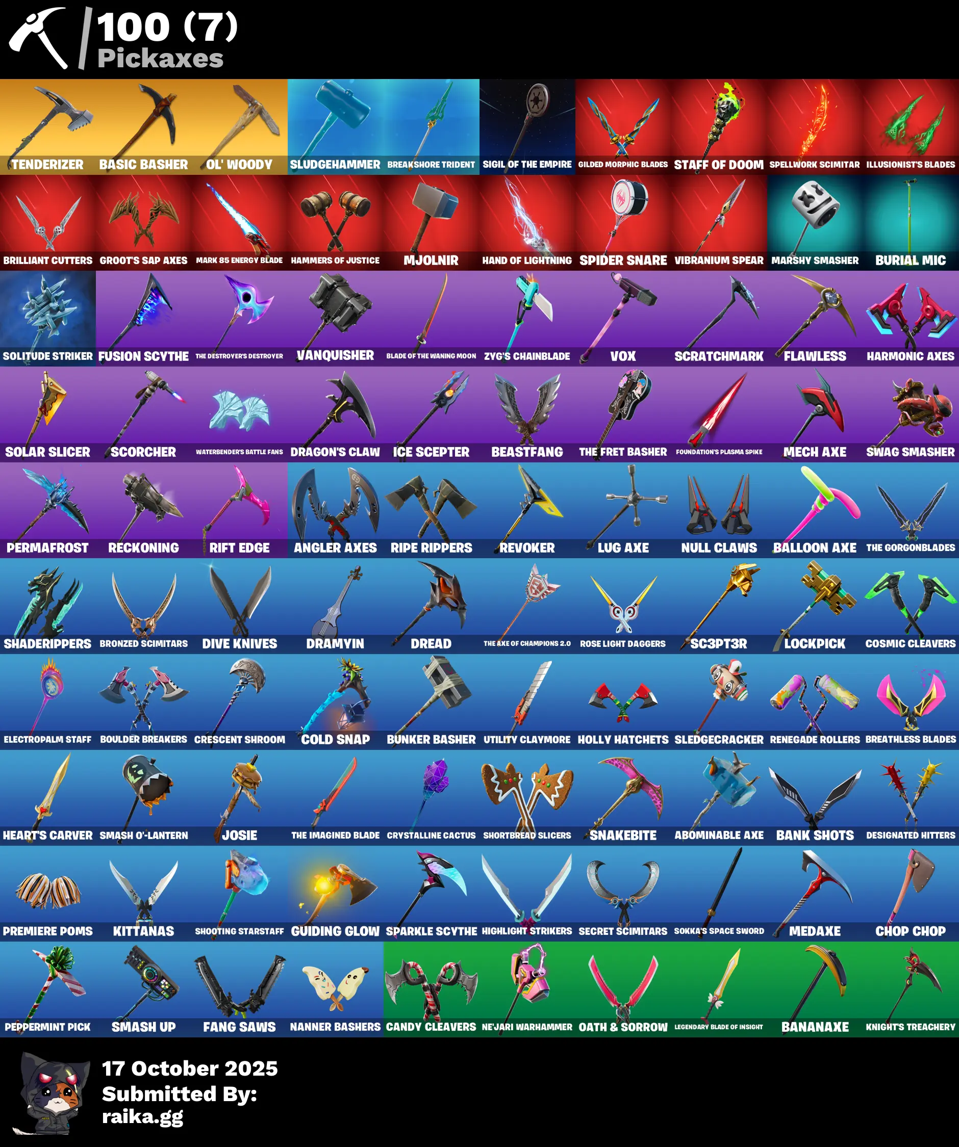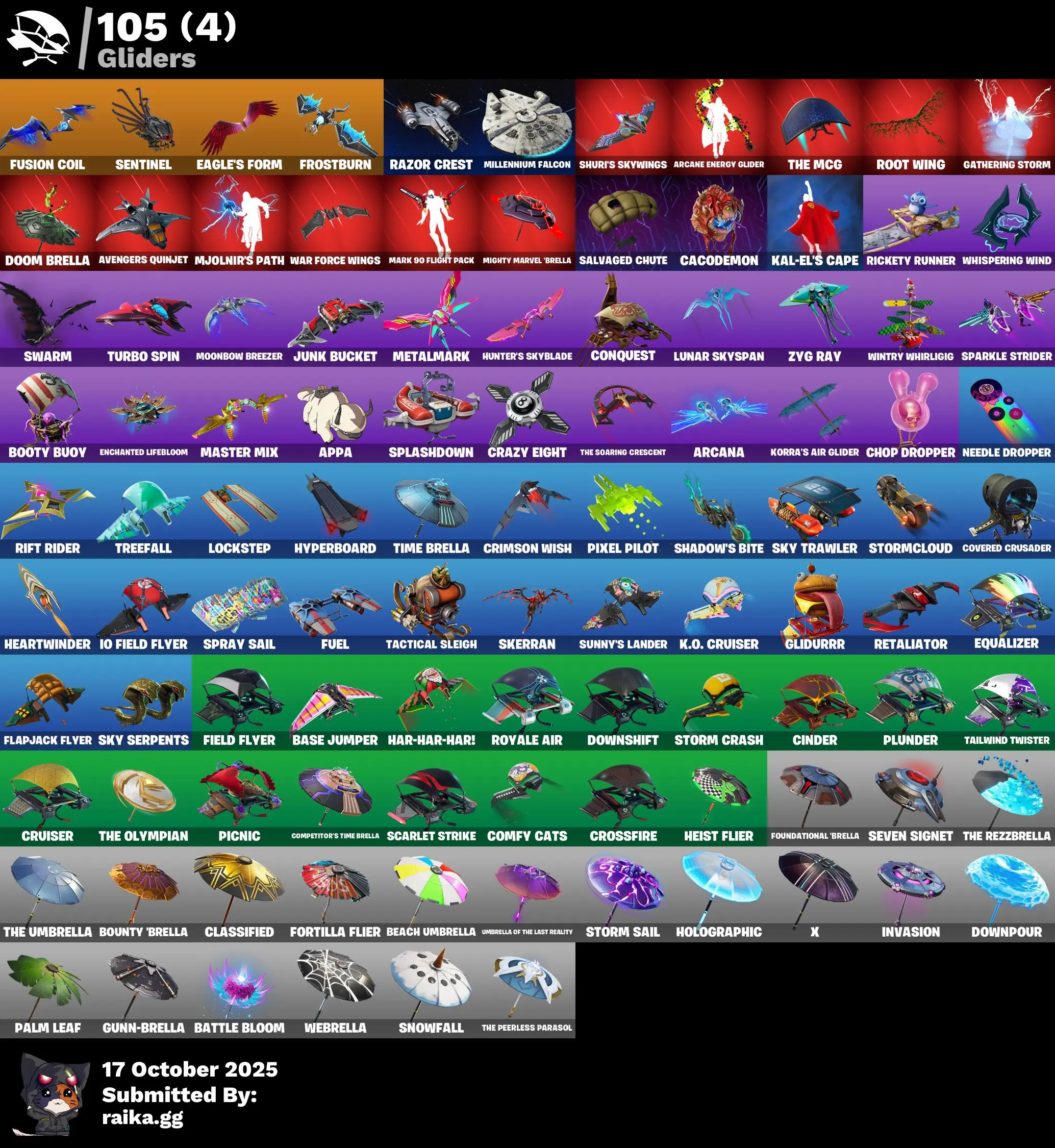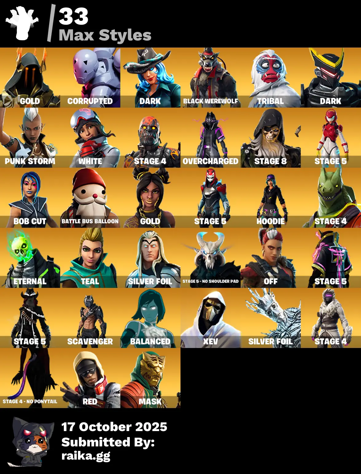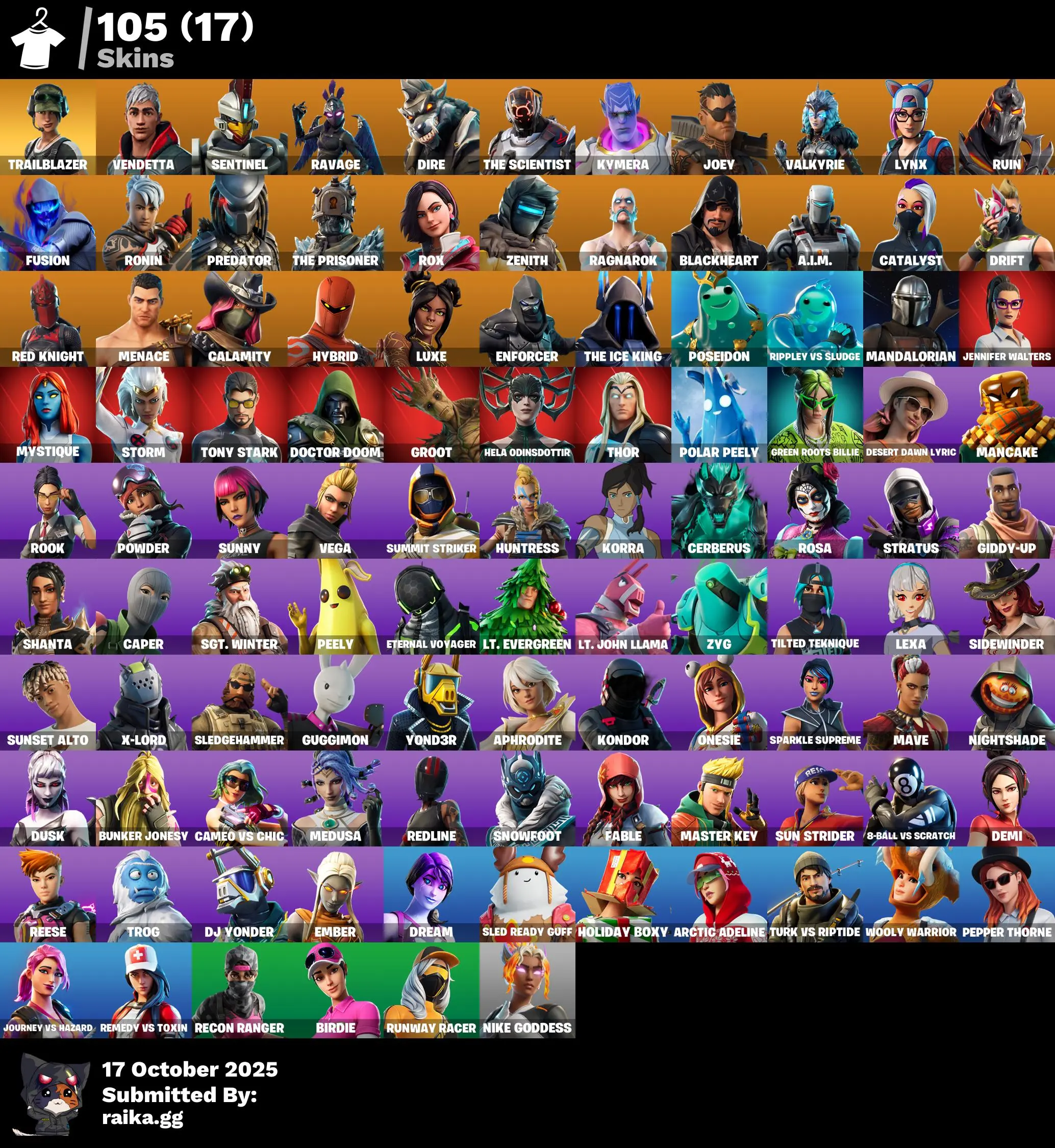 105 skins | Rox🐔Catalyst🐔Ronin🐔Zenith🐔Menace🐔Hybrid🐔Kymera🐔Blackheart🐔A.I.M.🐔Red Knight🐔Ragnarok🐔The Scientist🐔Luxe🐔Ruin🐔Ravage🐔Sentinel🐔Valkyrie🐔Lynx🐔Enforcer🐔Drift🐔Calamity🐔Dire🐔Vendetta🐔Joey🐔The Prisoner🐔Fusion🐔Predator D5133