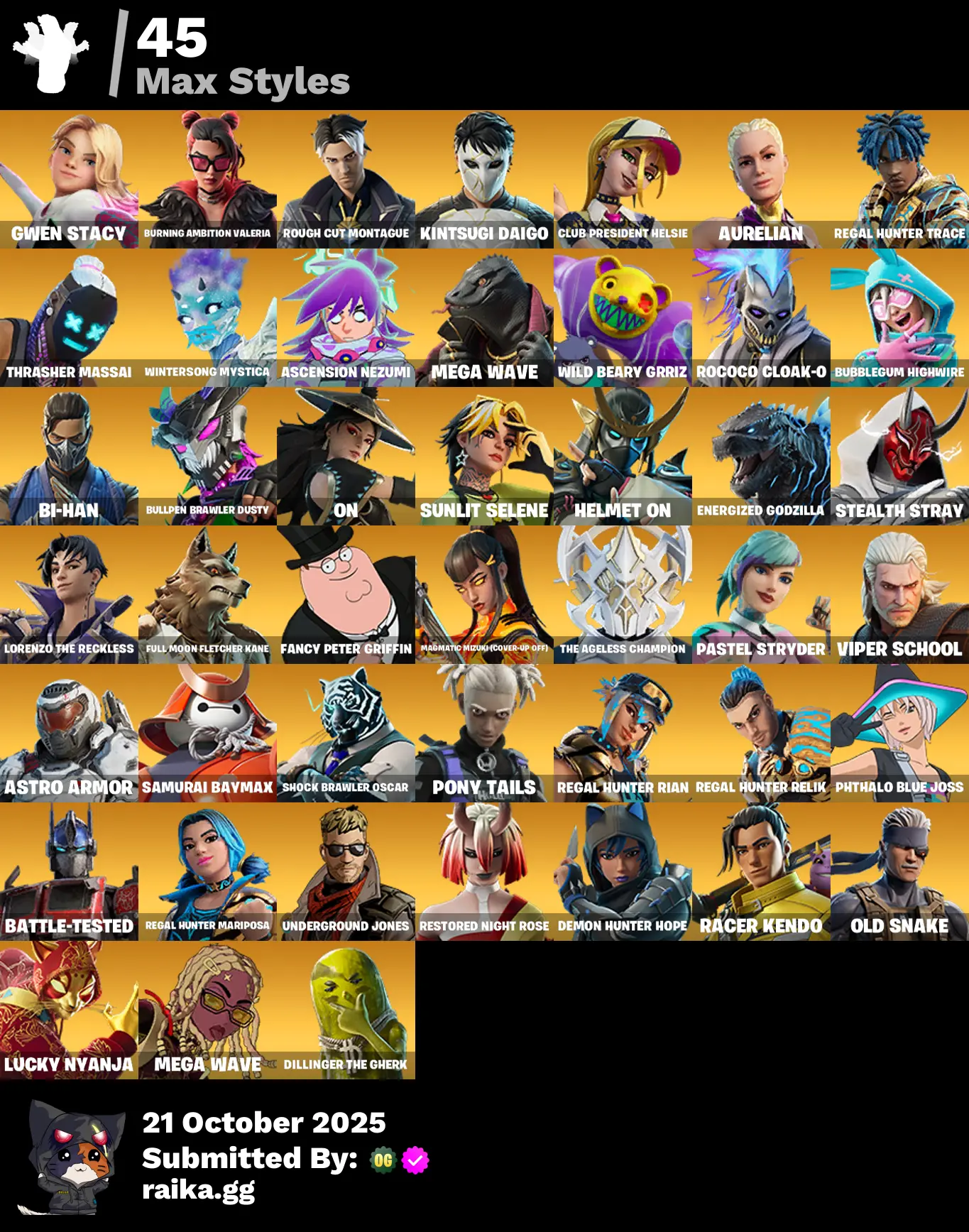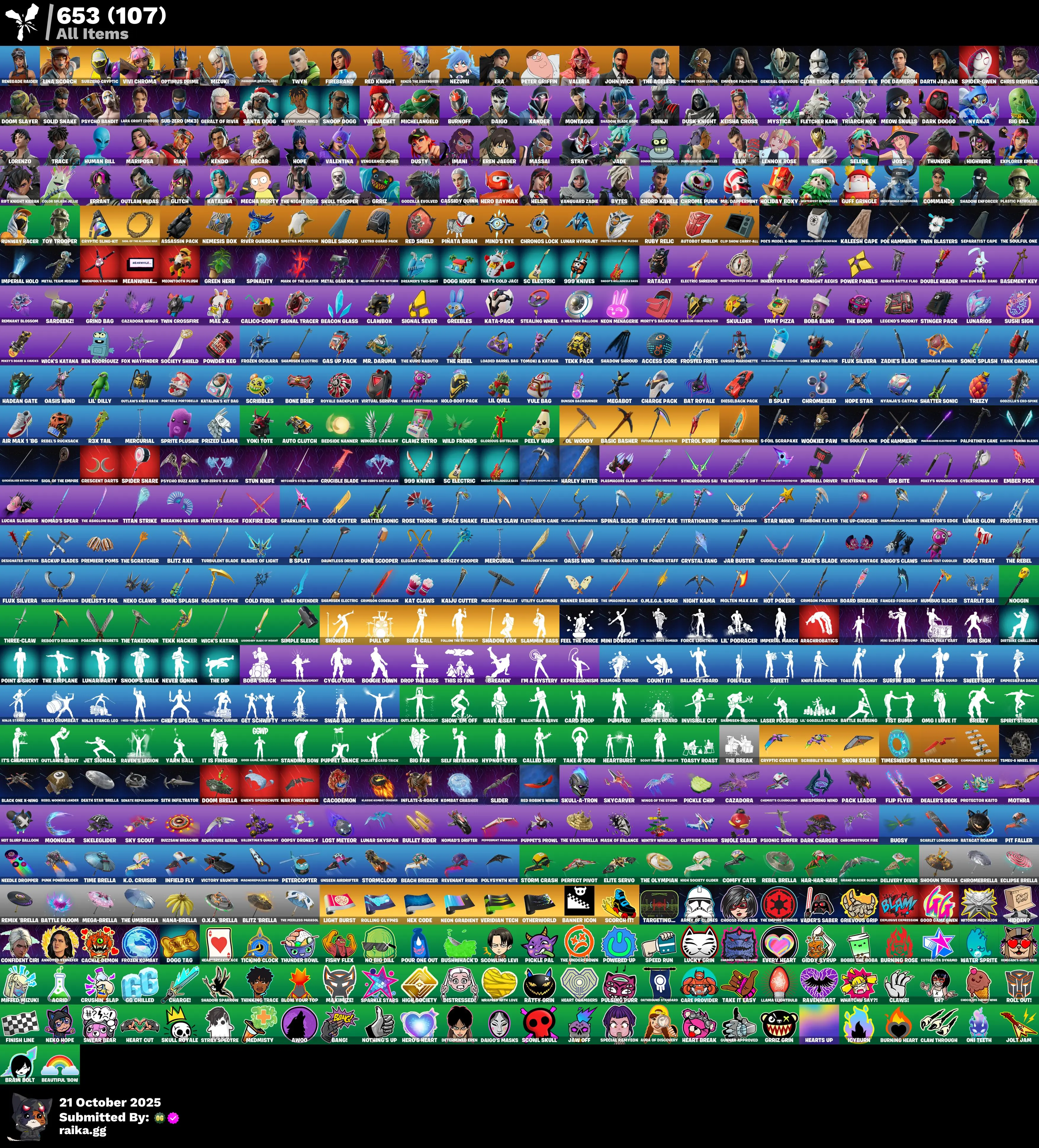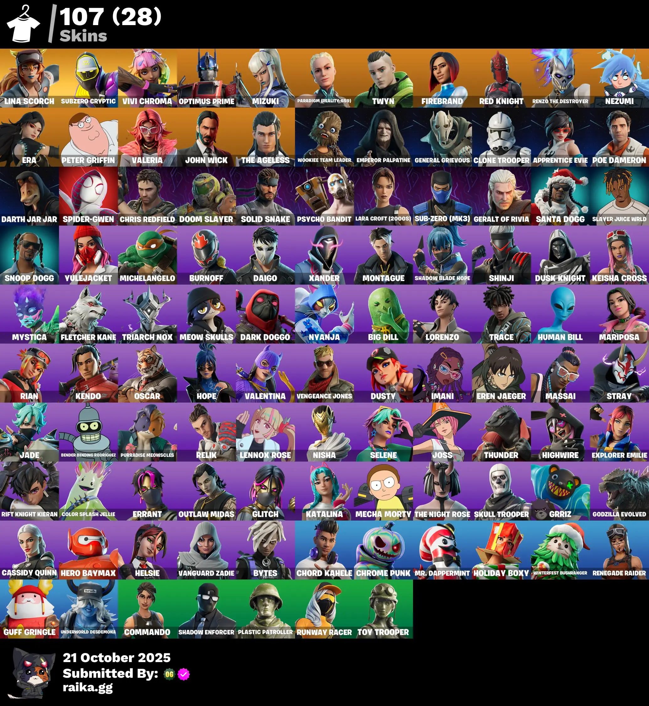 107 skins | Vivi Chroma🐔Renegade Raider🐔Paradigm (Reality-659)🐔Subzero Cryptic🐔Peter Griffin🐔Twyn🐔Optimus Prime🐔Nezumi🐔Firebrand🐔The Ageless🐔John Wick🐔Era🐔Wookiee Team Leader🐔Apprentice Evie🐔Red Knight🐔Lina Scorch🐔Valeria D5169