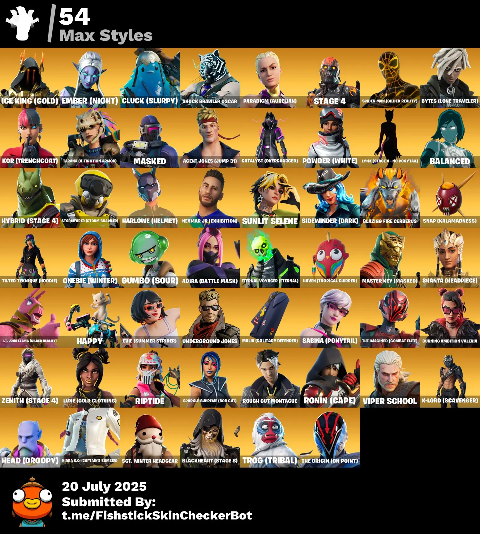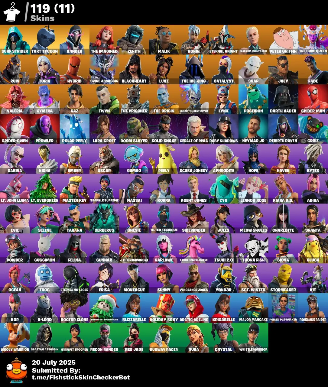 🌠119 skins 🎮 [PC/PSN/XBOX] 🦊 Renegade Raider 💫 Surf Strider 🌈 Tart Tycoon 🐉 Xander ⚔️ Zenith 🔮 Malik 💎 Ronin 🪩 Eternal Knight 🧿 FTN144